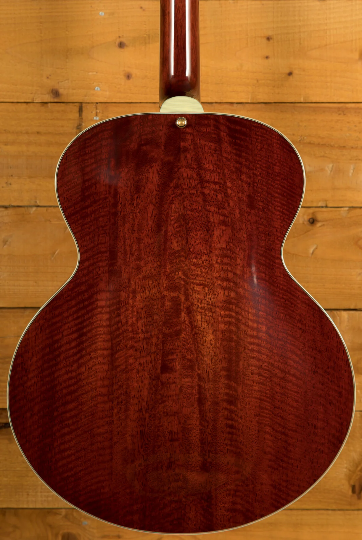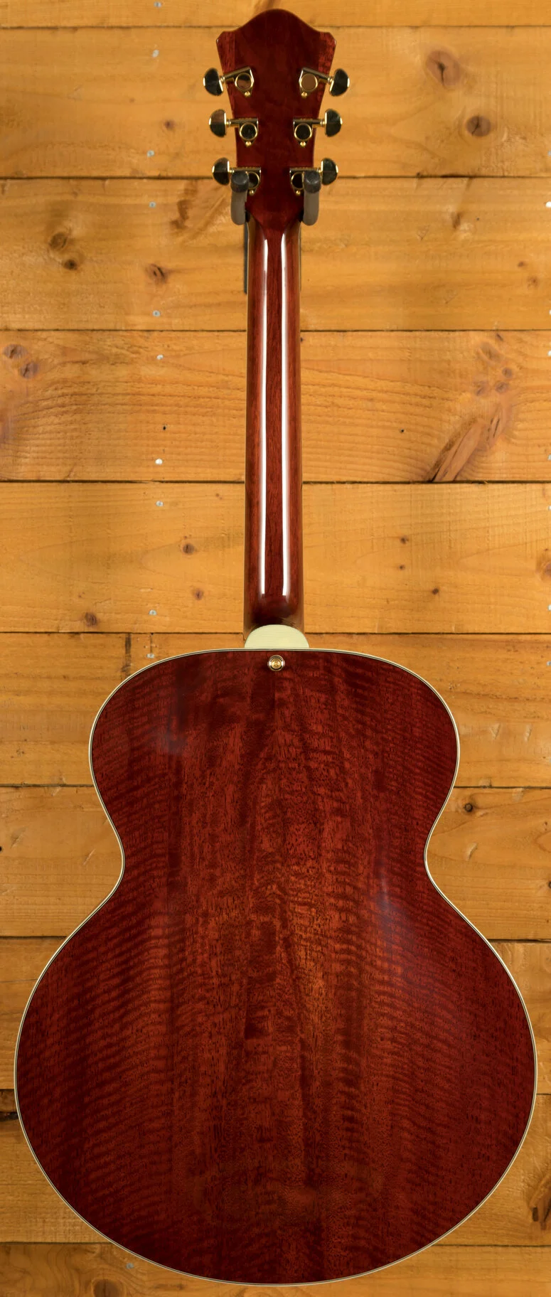 The solid spruce top and solid mahogany back/sides contribute to the guitar's exceptional resonance and projection, providing a well-balanced, full-bodied sound that will captivate both the player and the audience.