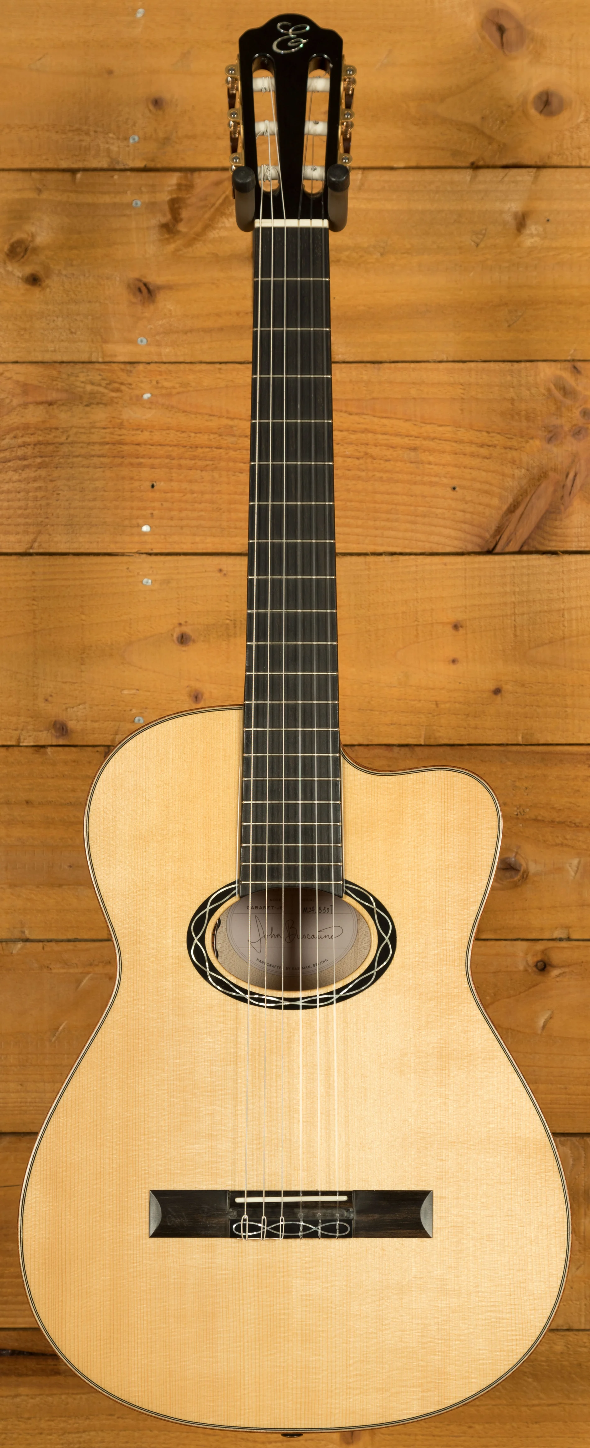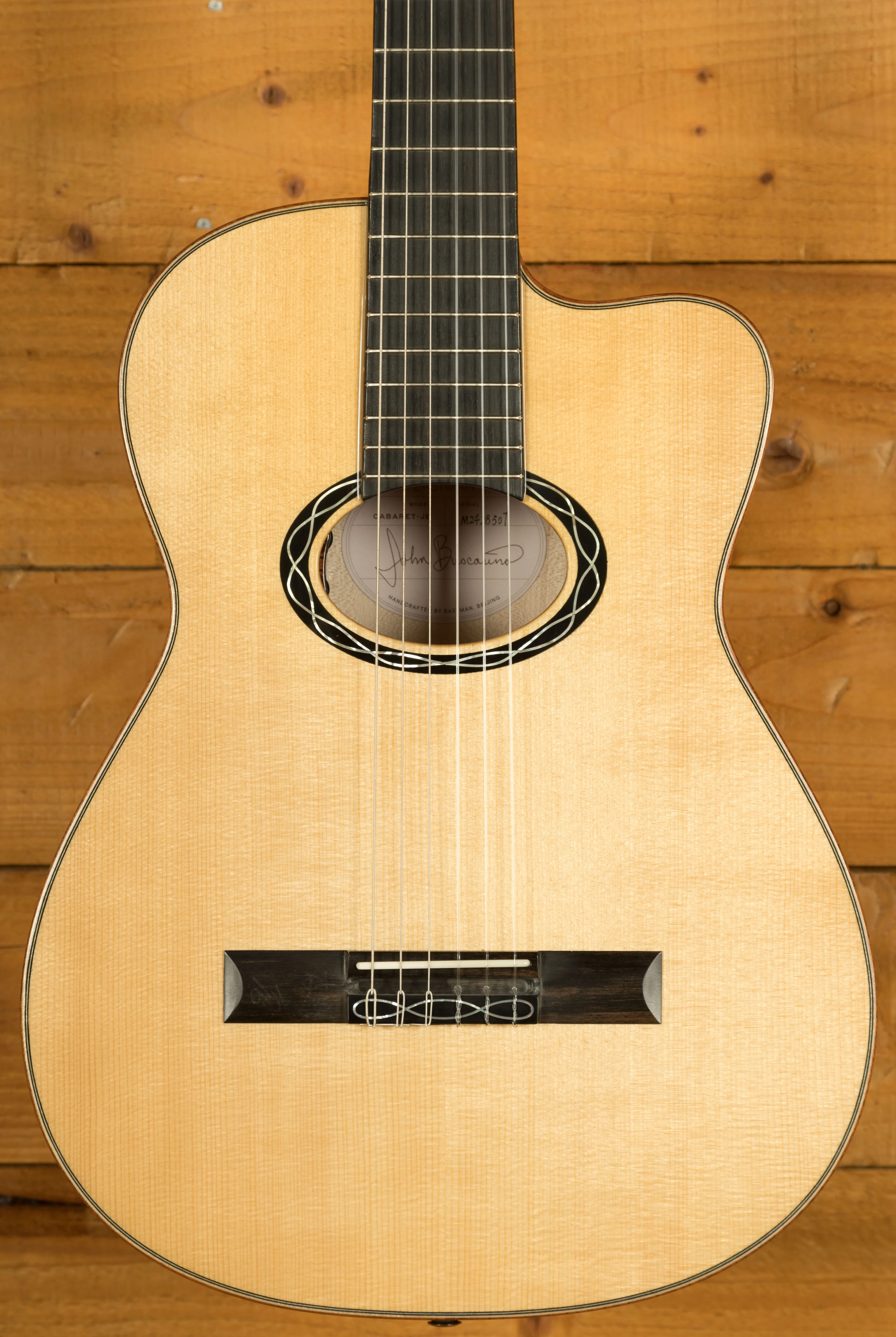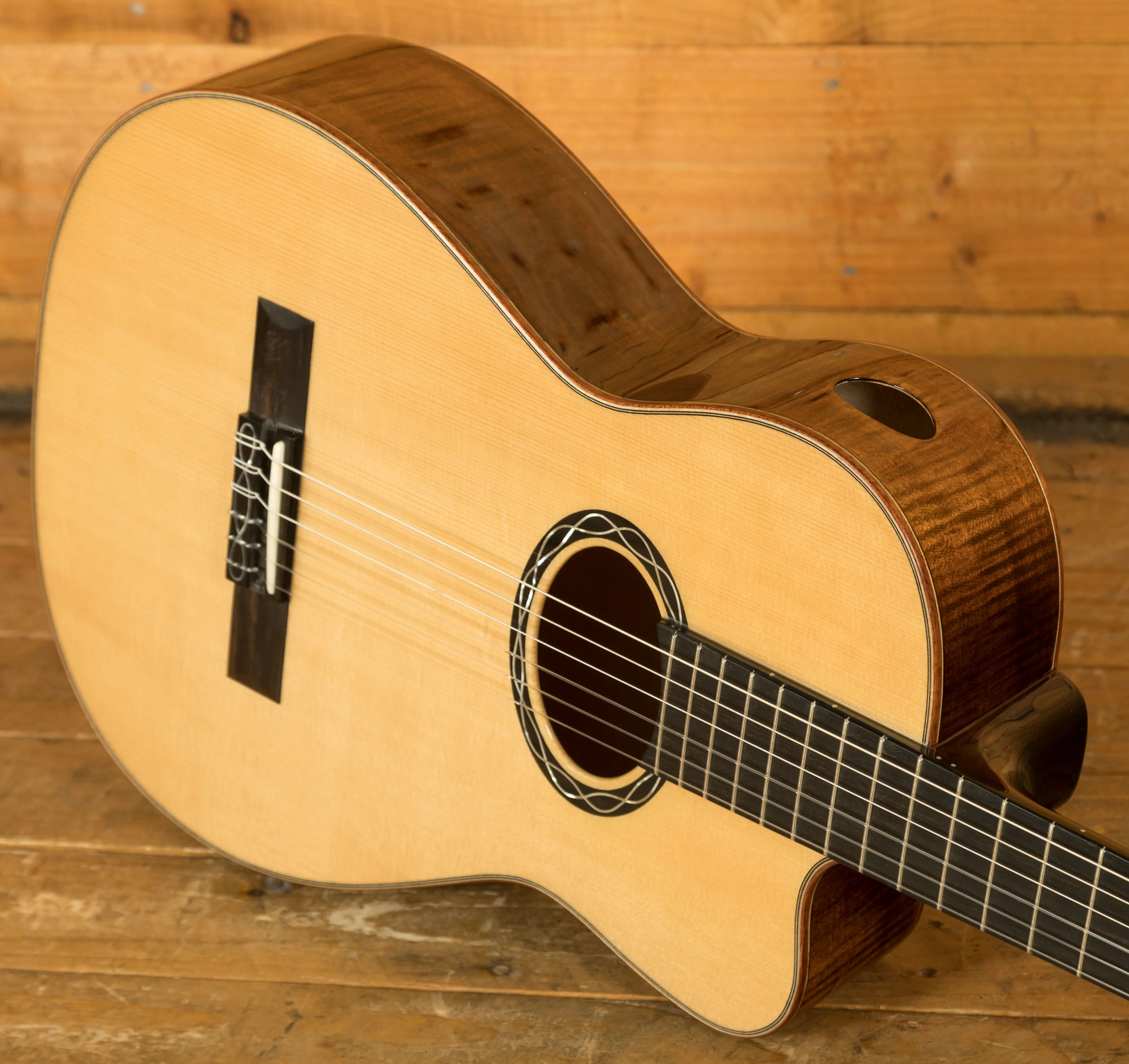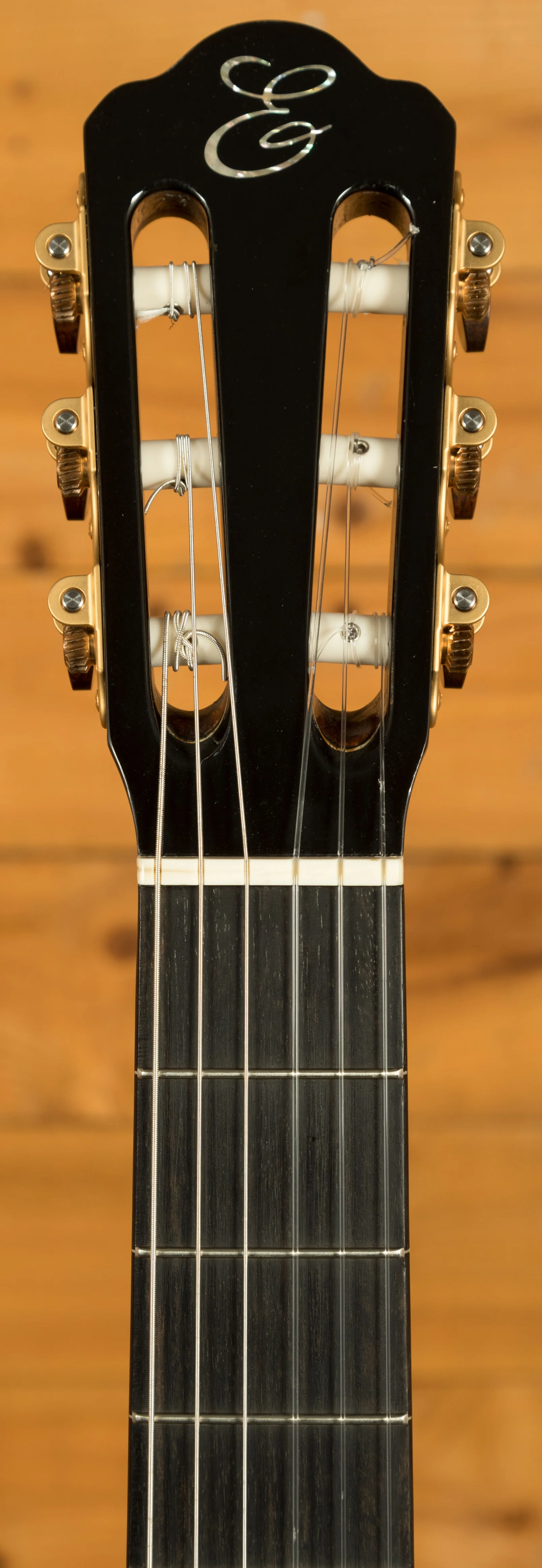 The Eastman Cabaret-JB is a premium classical nylon-string guitar designed for discerning players who demand professional performance and refined craftsmanship. With a solid spruce top and figured maple back and sides, this guitar offers a clear, responsive tonal character with excellent projection and definition. The body measures 14 1/8" wide and 3 3/4" deep, making it compact yet resonant - well-suited for both stage use and detailed studio work.