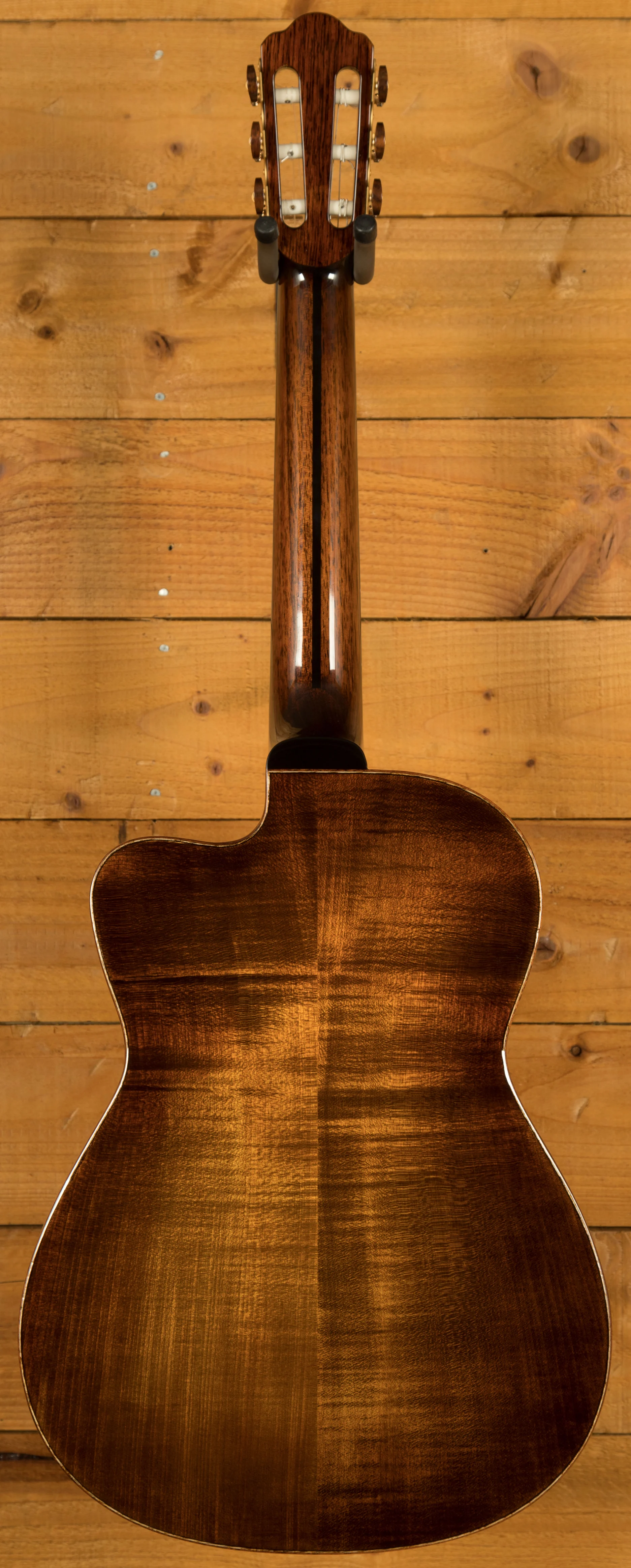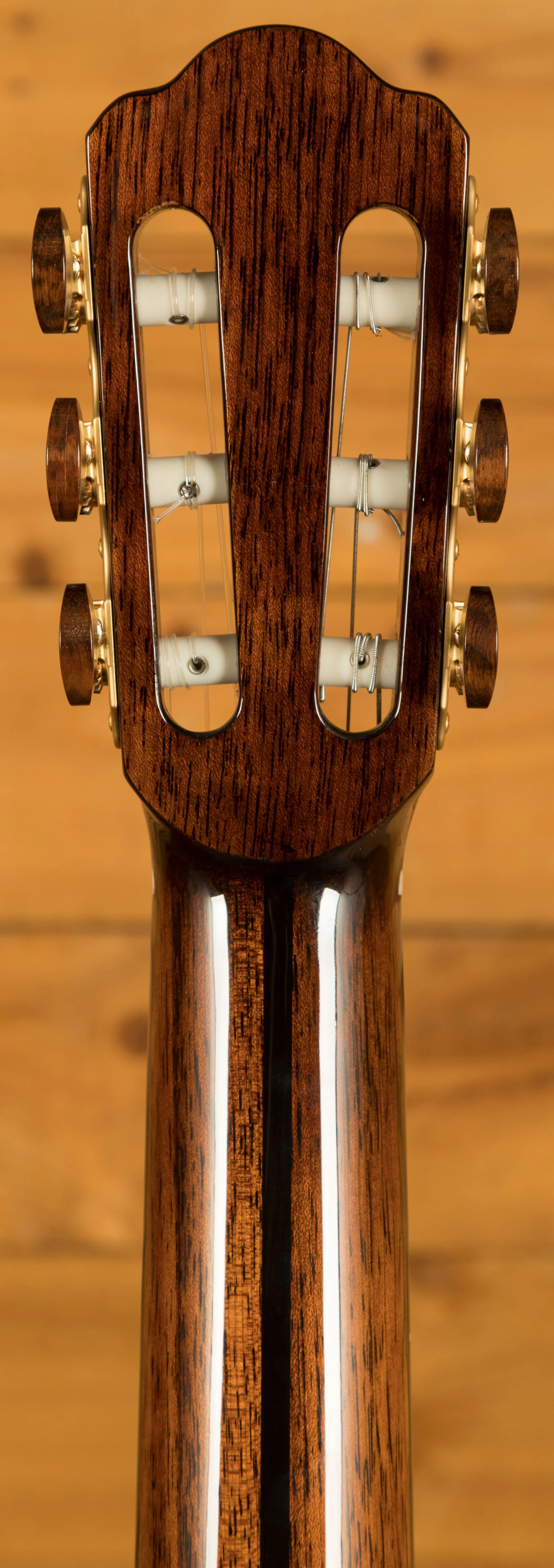 The guitar features a cedar neck with a narrow classical profile, offering a comfortable playing experience for players accustomed to traditional nylon-string instruments. The 647mm scale length supports articulate note definition, while the 30" fingerboard radius and 20 Jescar FW43080-P frets provide smooth playability across the ebony fingerboard. A bone nut measuring 1 15/16" ensures accurate string spacing and optimal tone transmission.