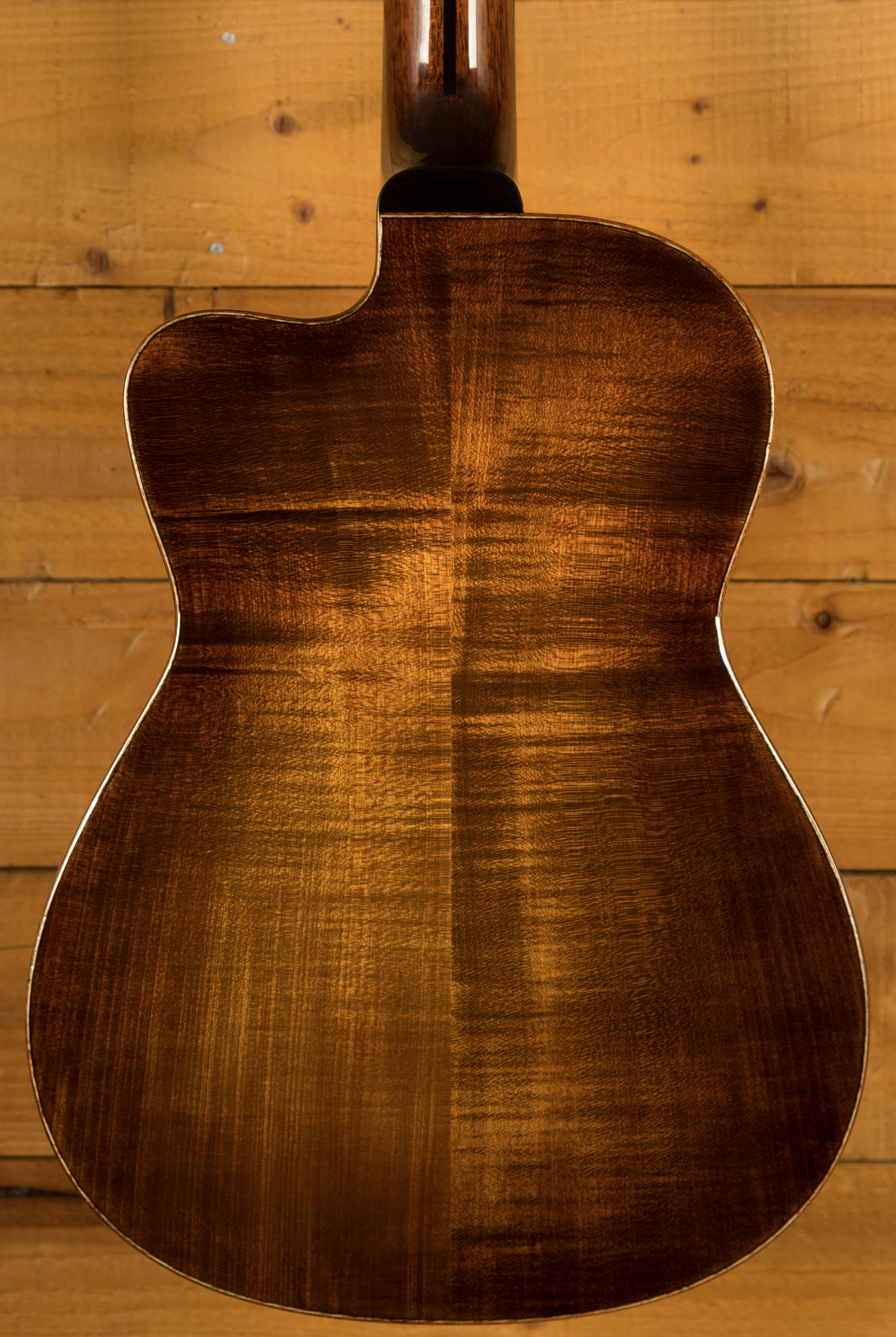 Premium appointments include an ebony bridge with a rope loop inlay, a looping rope rosette, and figured mahogany binding along the top and back. These details not only enhance the instrument's visual appeal but also reflect the high level of craftsmanship throughout. The use of bone for the nut and saddle improves resonance and sustain, offering tonal clarity and a natural acoustic response.