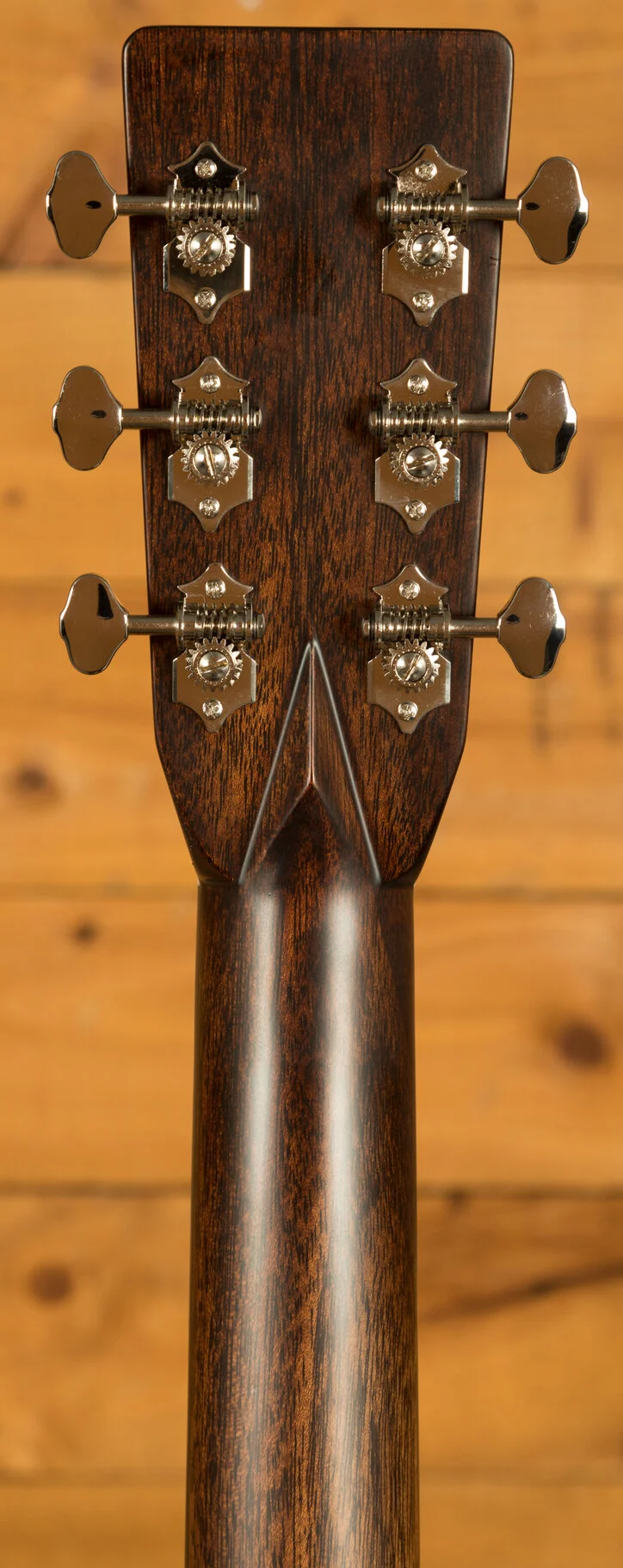 Exquisite herringbone binding adorns the top and back, showcasing the guitar's meticulous craftsmanship. The pearl headstock logo and abalone snowflake inlays add a touch of sophistication and visual allure. The ebony bridge pins with abalone inlay further enhance the guitar's aesthetic appeal.