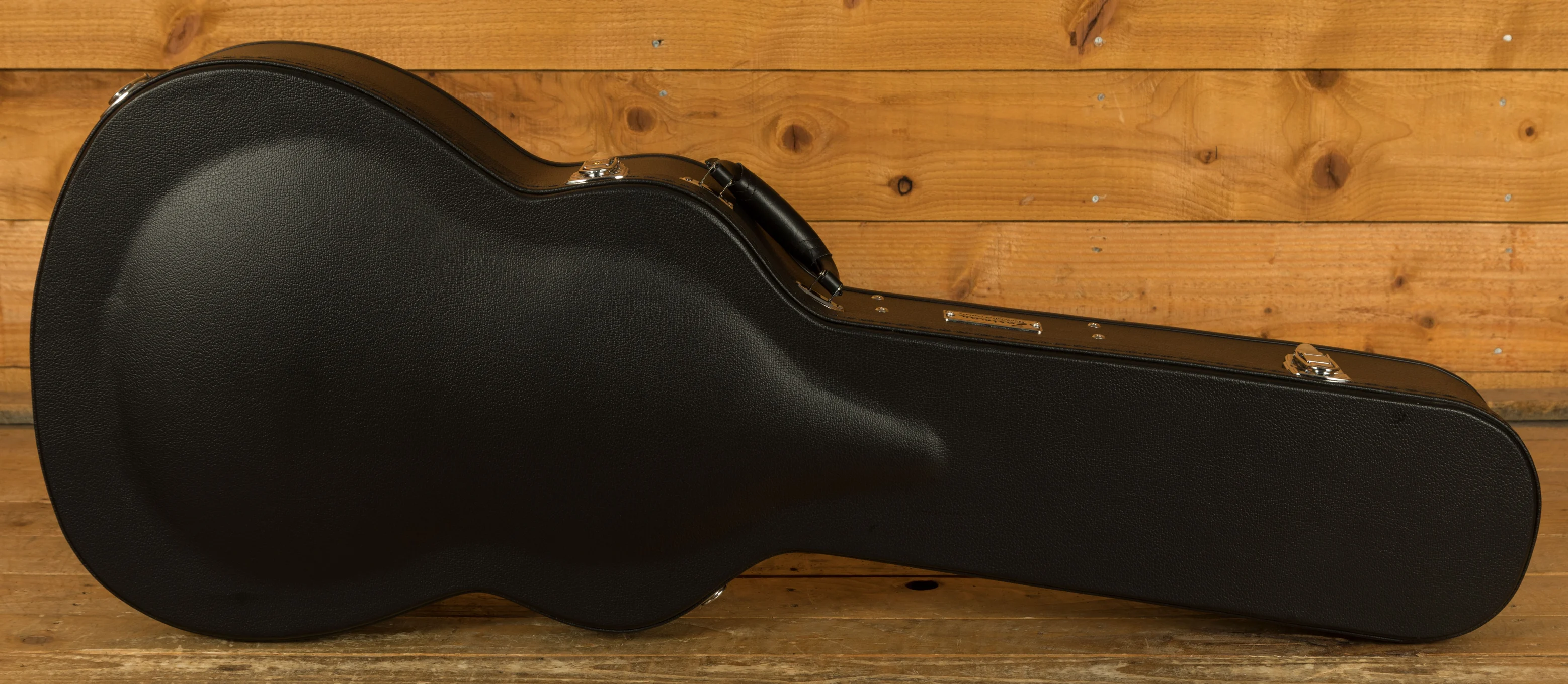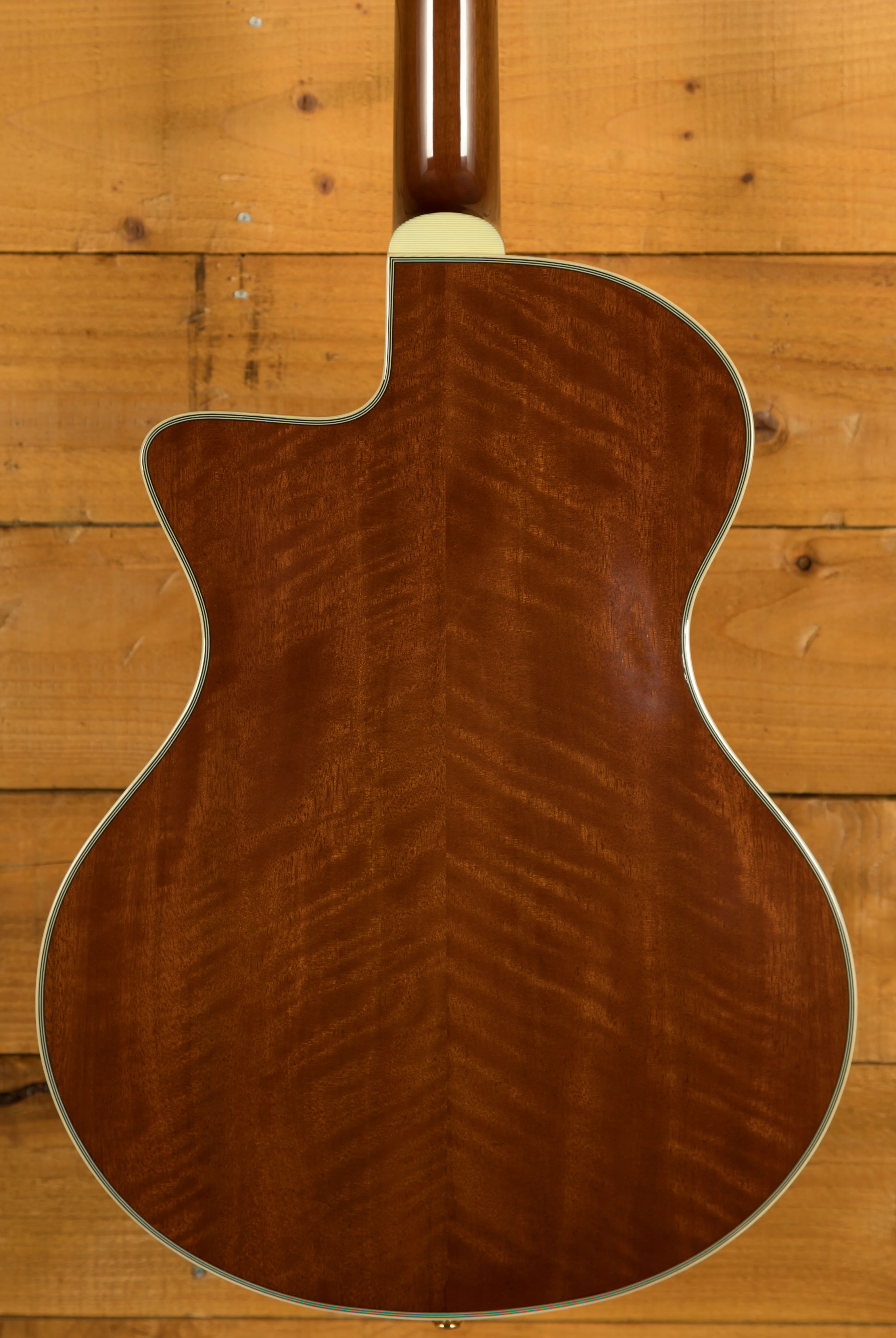 The guitar features a 15" x 3 1/4" body with a AAA tight-grained spruce top and flamed mahogany back and sides, ensuring a warm, resonant tone with excellent projection. The Truetone Gloss finish enhances the wood's natural acoustic properties while providing a durable and visually appealing surface. A 4-ply ivoroid binding adds a refined aesthetic touch, highlighting the instrument's attention to detail.