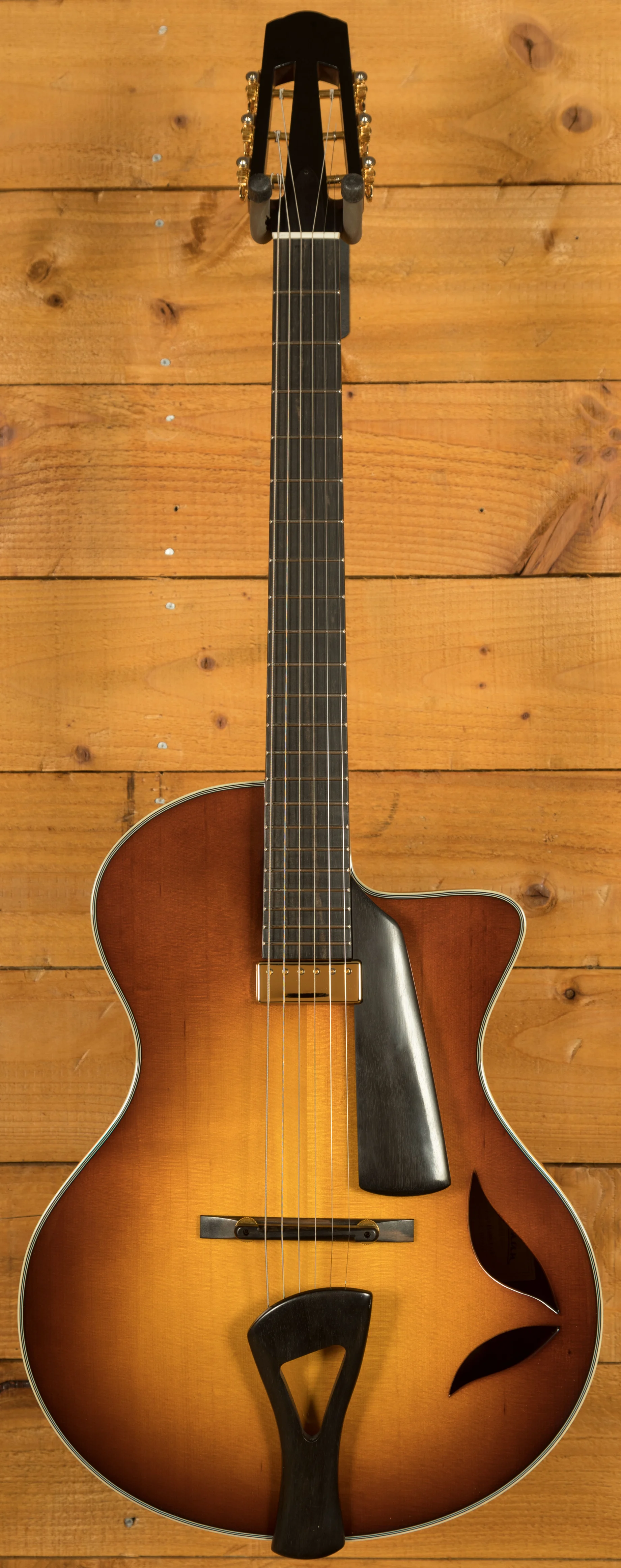 The Eastman Frank Vignola FV680CE is a premium, handcrafted instrument designed to meet the demands of professional musicians. Developed in collaboration with Thorell Guitars, this model is inspired by the gypsy jazz tradition while offering versatility suited for jazz, bluegrass, and beyond. With its high-quality materials, precise craftsmanship, and professional-grade electronics, the FV680CE is built for exceptional tone, playability, and durability.