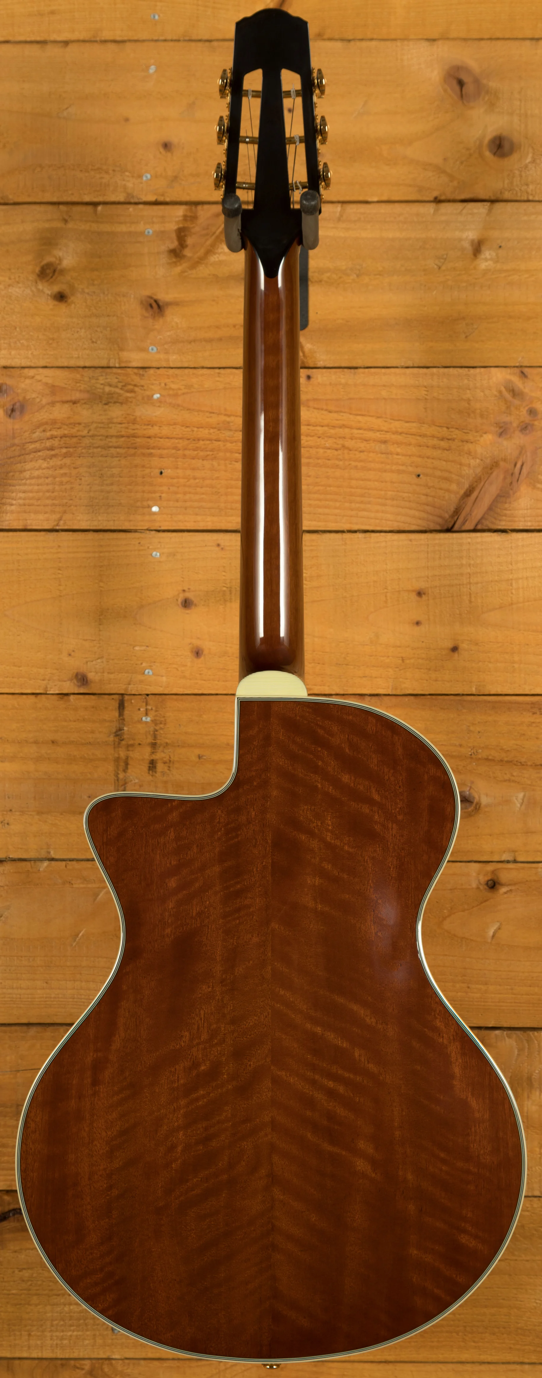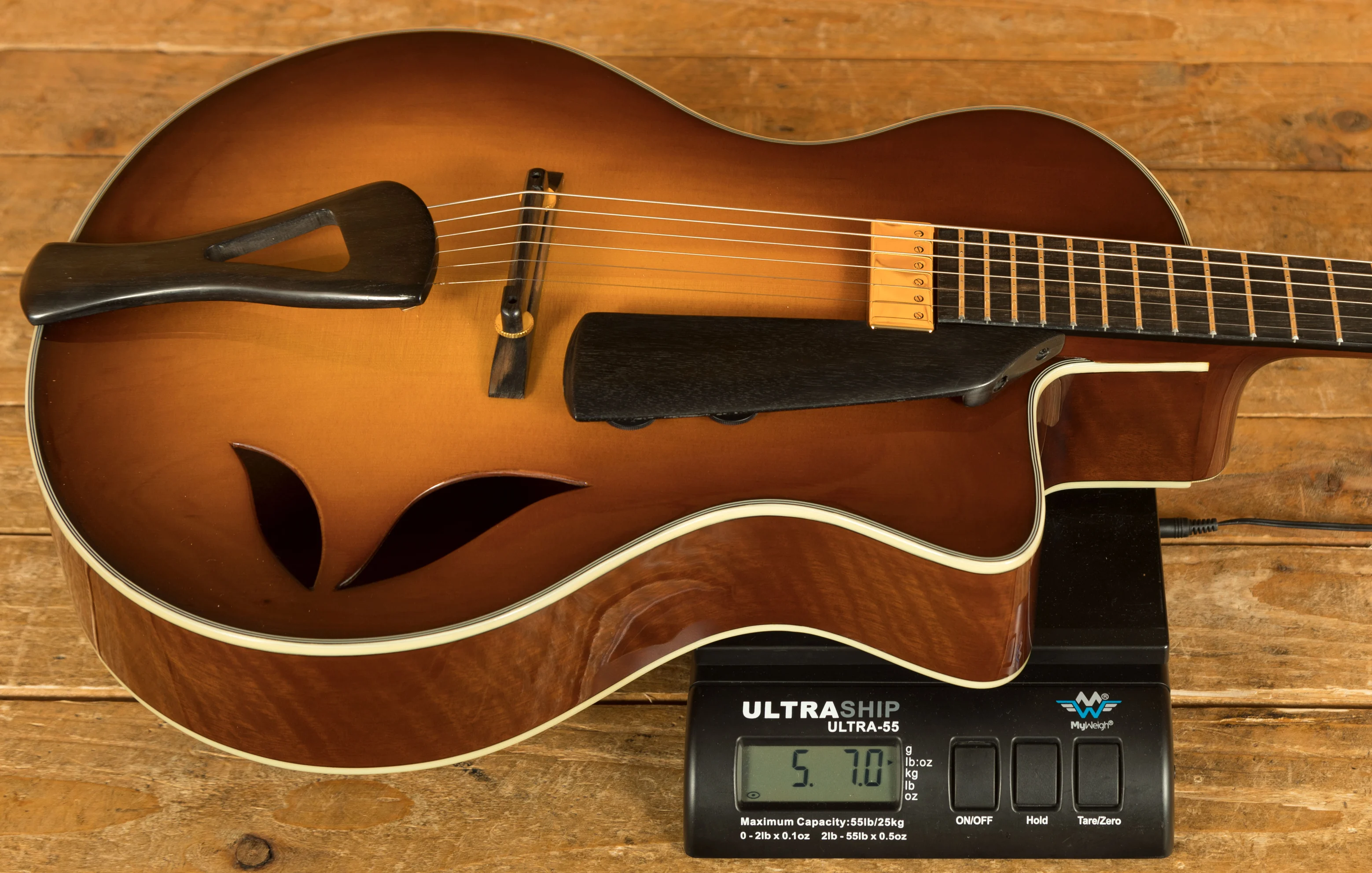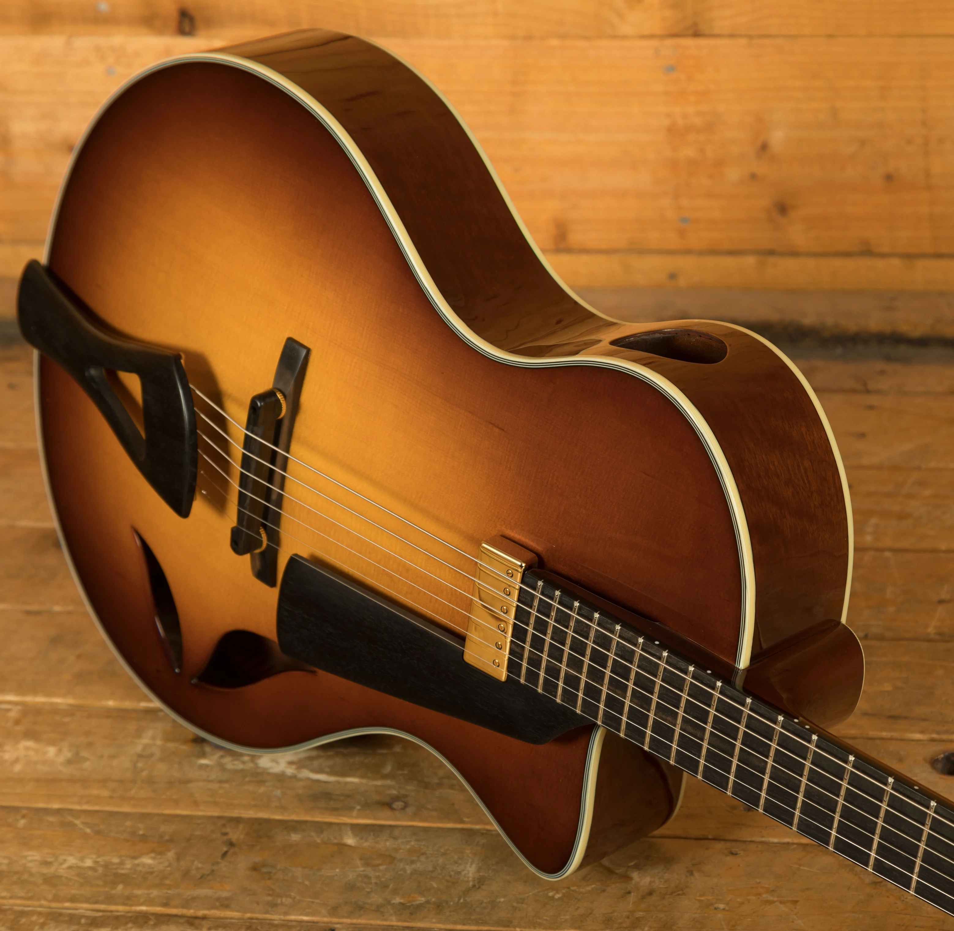 Equipped with a Lollar Johnny Smith neck pickup, the FV680CE delivers a well-balanced tonal profile with clear highs, moderate midrange, and excellent string separation, even when adjusting the guitar's tone controls. This pickup makes the guitar well-suited for a variety of playing styles, from warm jazz comping to articulate soloing. The Thorell-style tailpiece, ebony bridge, and 2 3/32" string spacing further enhance sustain and resonance, providing a rich and expressive tone.