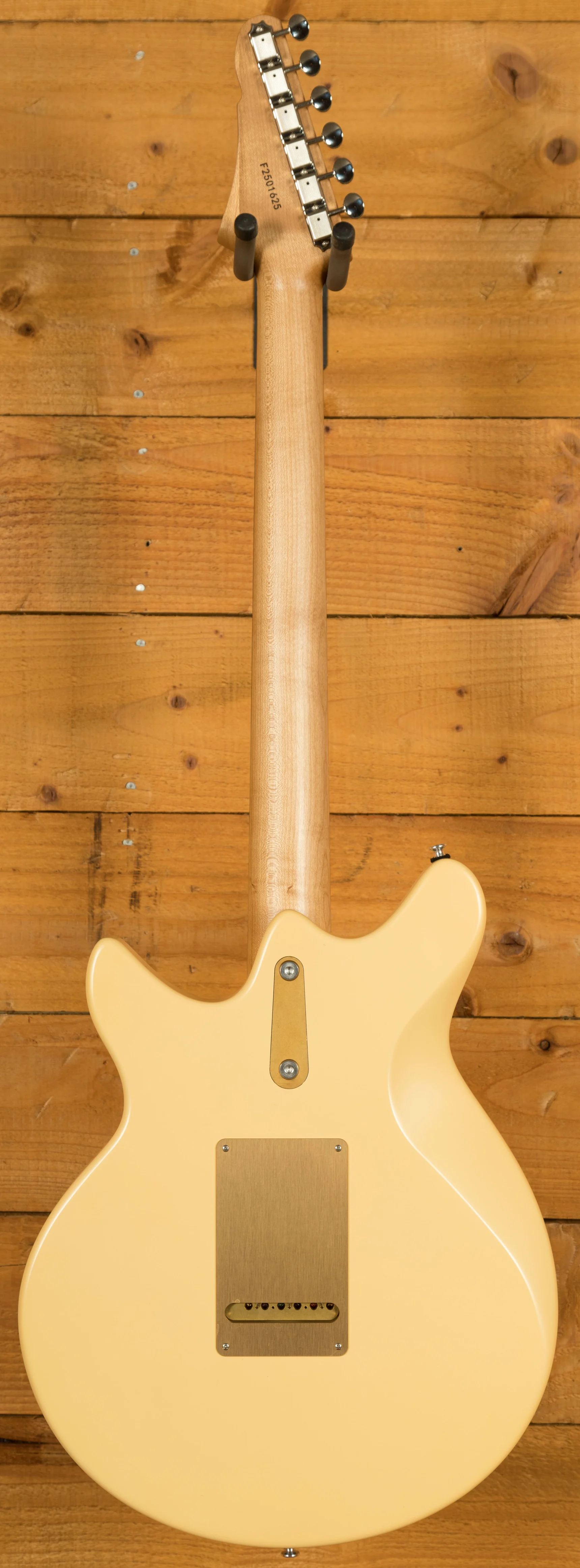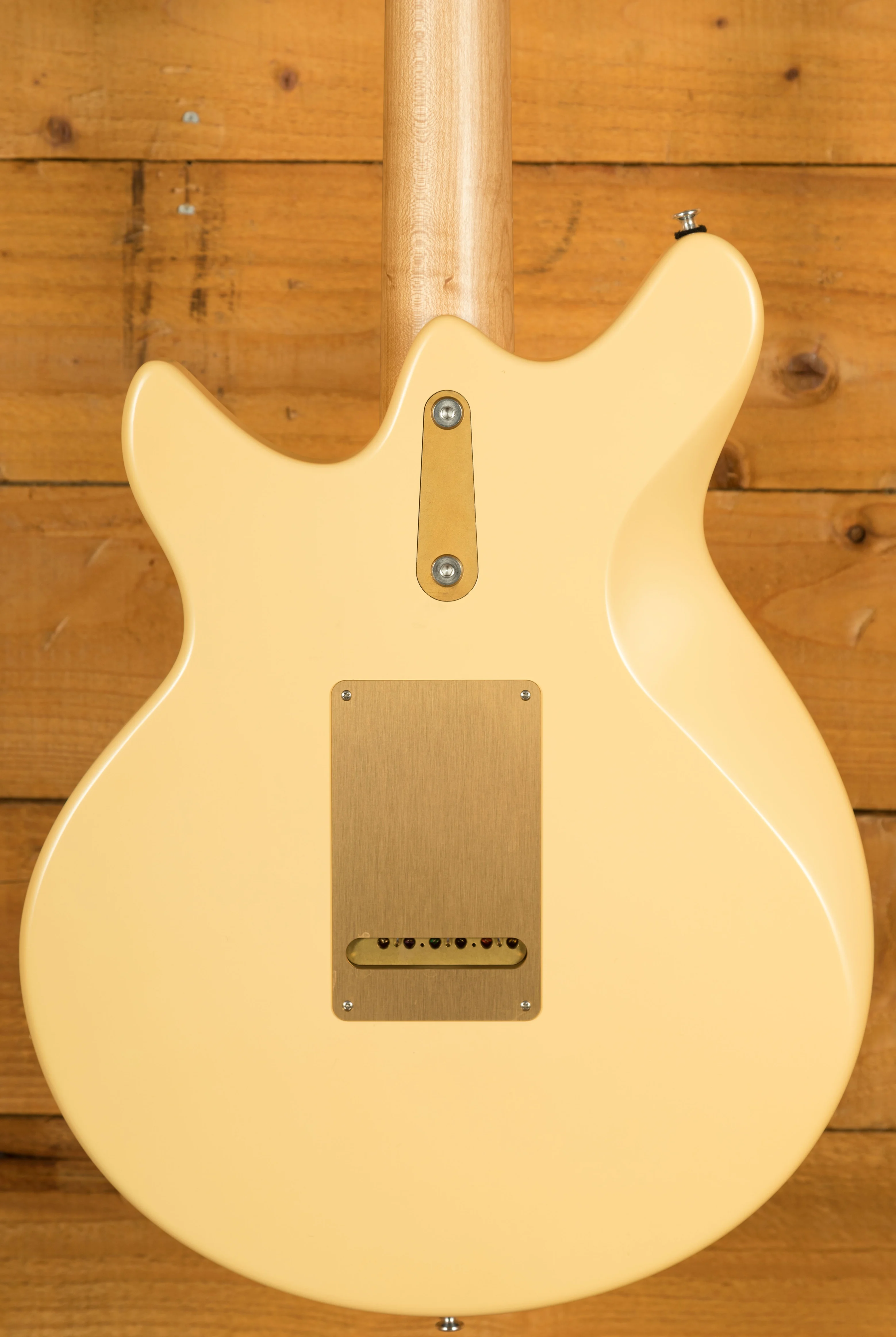 Like the SC'52, the DC'62 is constructed with premium components. The ergonomic double-cutaway body provides easy access to the upper frets, enhancing playability. Premium CTS pots and Orange Drop capacitors offer smooth and precise tone control, while the Aumsen tremolo with a brass block ensures excellent intonation and tuning stability. Custom staggered tuners further enhance tuning stability and create optimal string tension. With brushed aluminum pickguards, the DC'62 is a visually stunning and sonically powerful instrument.