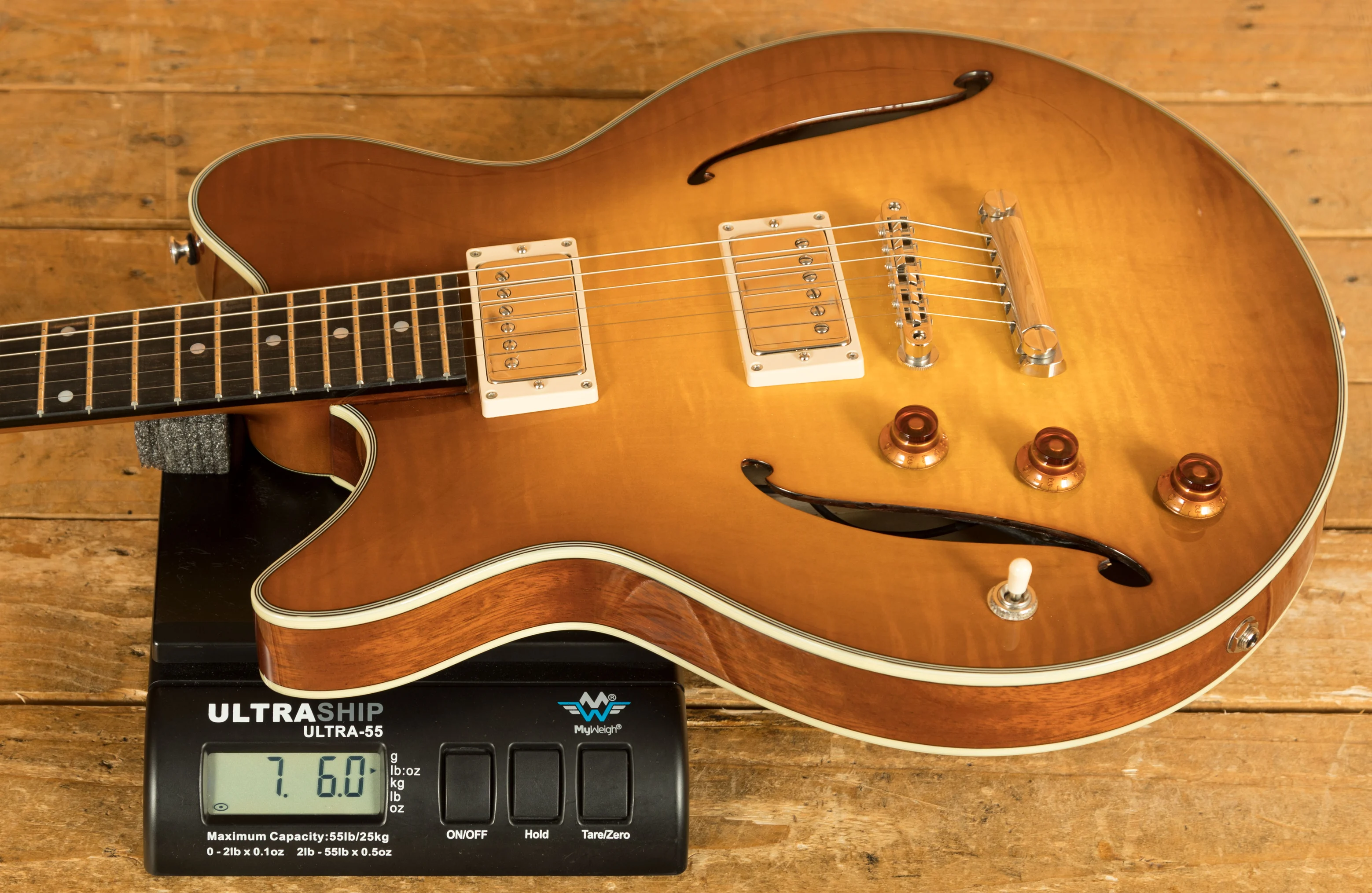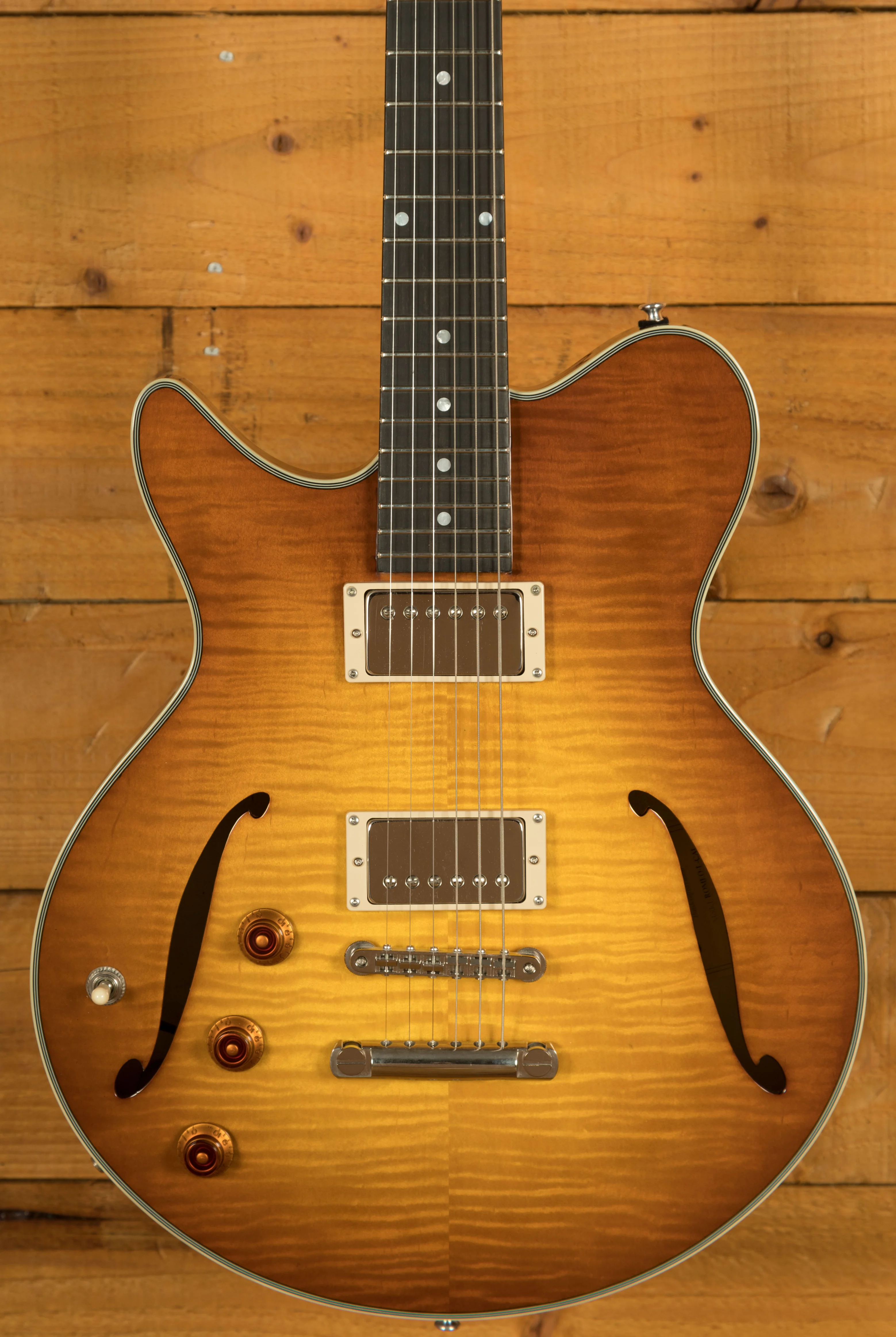 Introducing Romeo California, the latest version of Romeo. Its notable feature is the inclusion of a centre block, setting it apart from its predecessors. While Romeo guitars typically boast a hollow body with a small block beneath the bridge, Romeo California showcases a centre-block design. With a stunning flame maple top and equipped with two Bare Knuckle Old Guard humbuckers, it delivers a classic 335-style tone. The mahogany back and sides further contribute to its unique sound, imbuing it with a rich, woody resonance unlike any other.