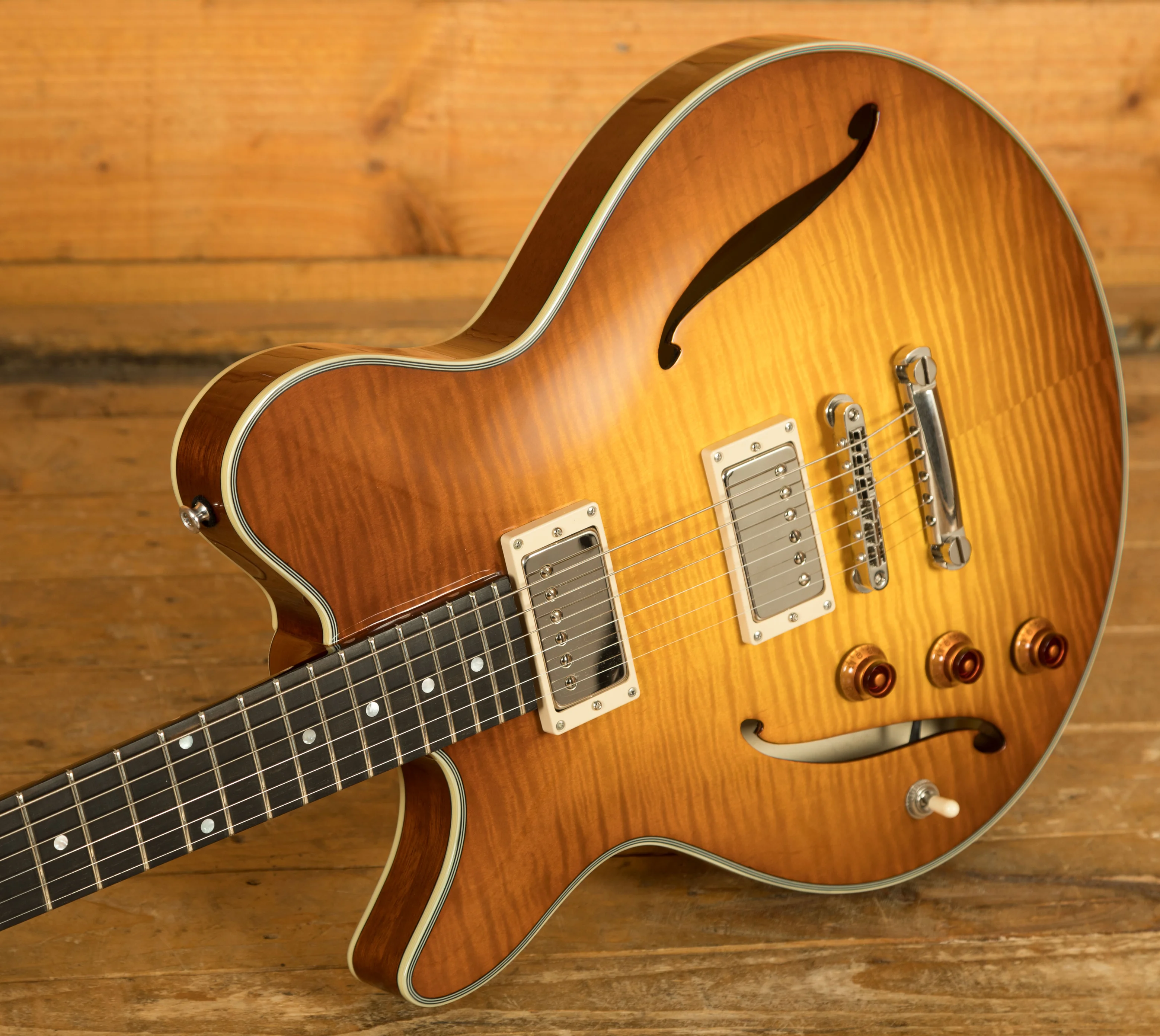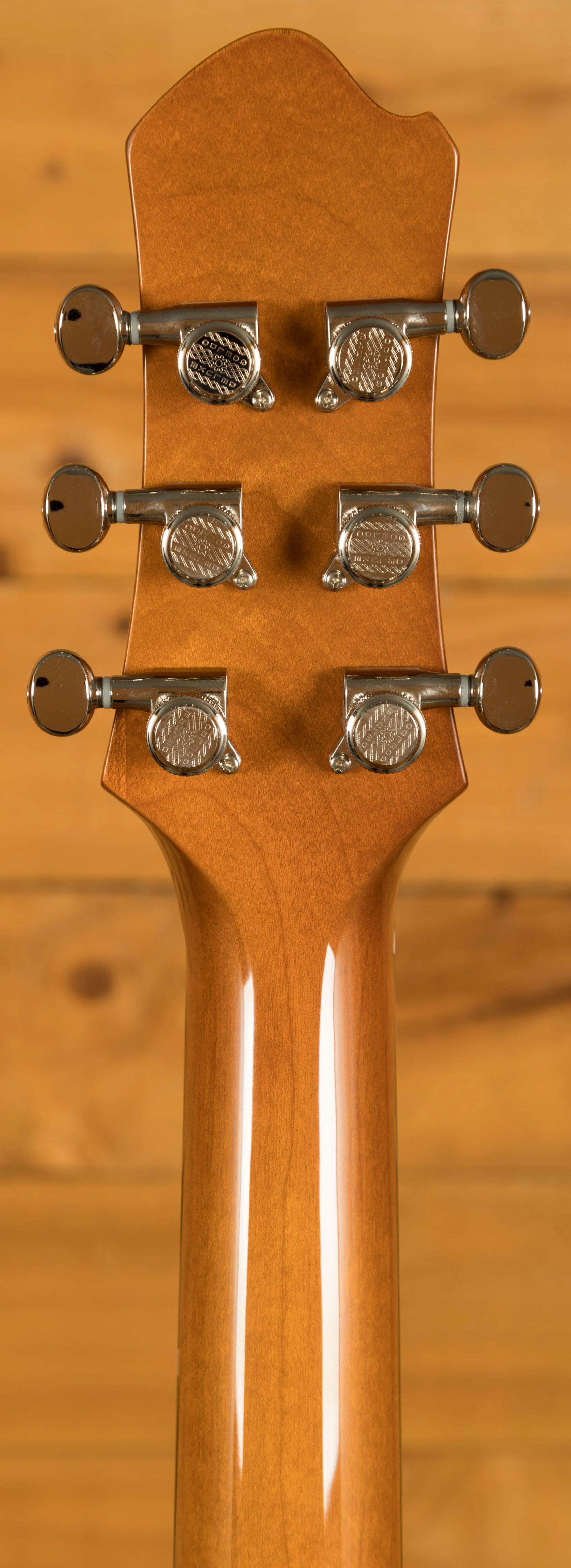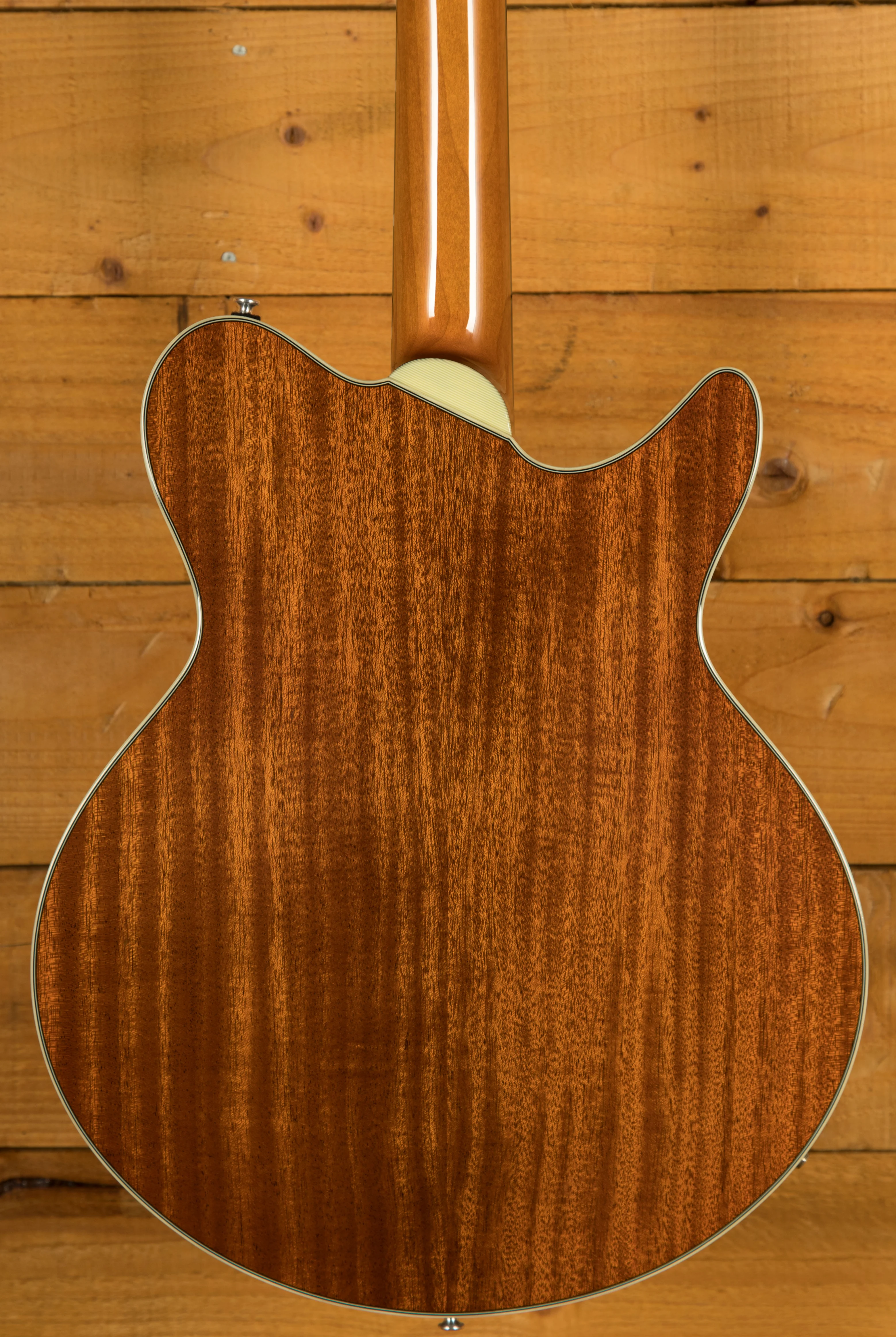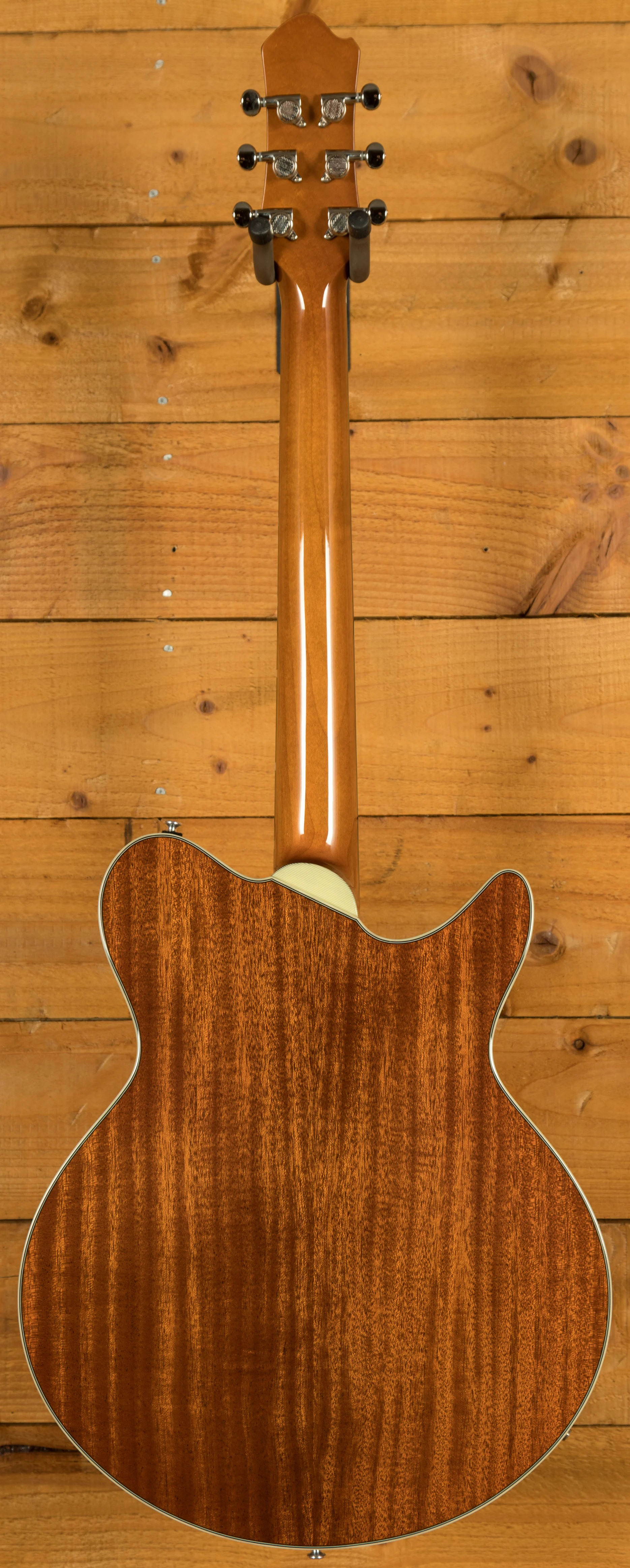 This exceptional instrument is finished with a Truetone Gloss finish, accentuating its beauty while protecting it for years to come. The hardware, including the Gotoh GE101A-NI tailpiece and Gotoh GE-104B-NI bridge, and the Göldo MGDBL33N Back Locking Tuners, combine functionality with a timeless aesthetic. The amber bell knobs and Gotoh EP-A1 strap peg add a touch of vintage charm.