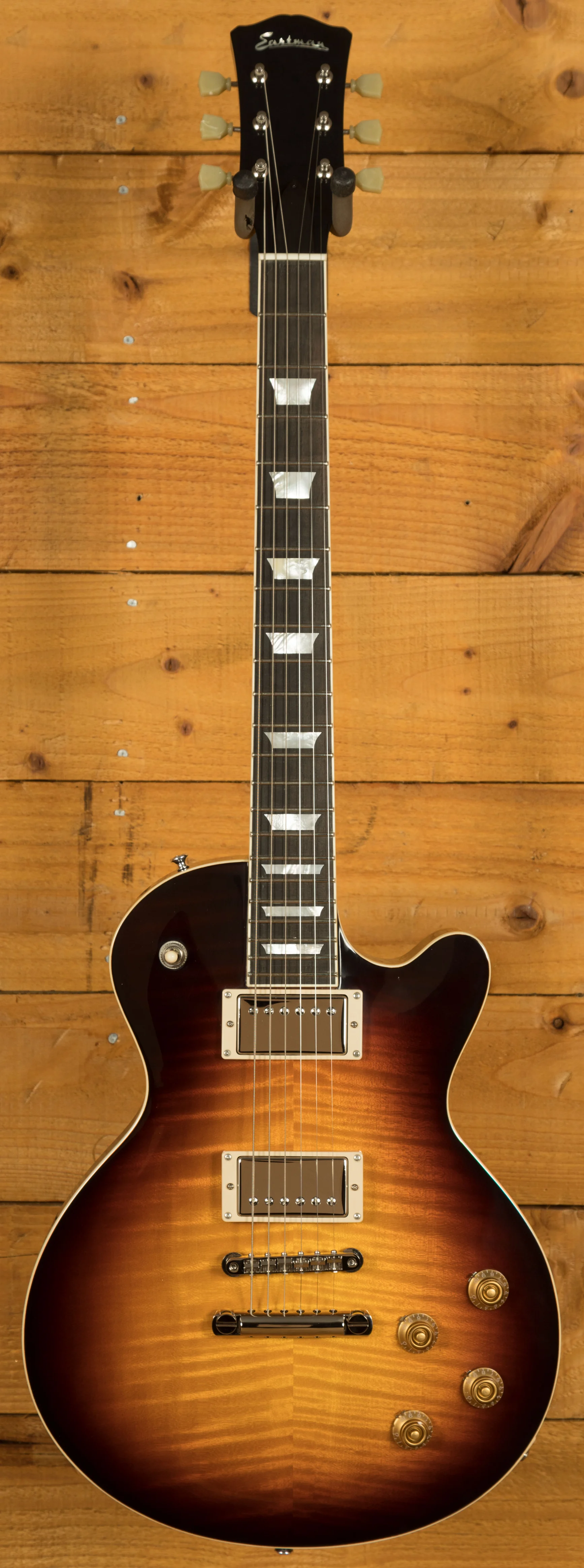 The body of the SB59 boasts a solid flame maple top, a testament to its stunning aesthetics and tonal excellence. Combined with the one-piece mahogany back and sides, this guitar delivers a harmonically rich and resonant sound with excellent sustain. The body dimensions of 13" x 1 7/8" provide a comfortable playing experience without sacrificing tone.