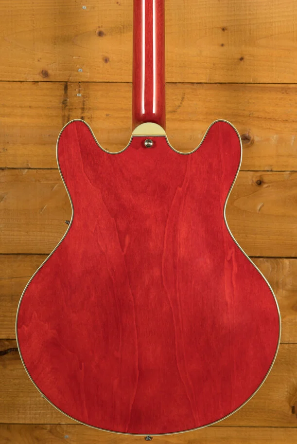 Designed for sonic versatility, the T386 boasts a 16" thinline body with a maple laminate top, back, and sides. This combination delivers a balanced and resonant tone with enhanced sustain, making it suitable for a wide range of musical genres. The body and neck binding in ivoroid add a touch of elegance, while the pearl dot inlays and pearl headstock logo enhance the guitar's visual appeal. The glossy finish provides a sleek and durable coating that protects the instrument and enhances its aesthetic appeal.
