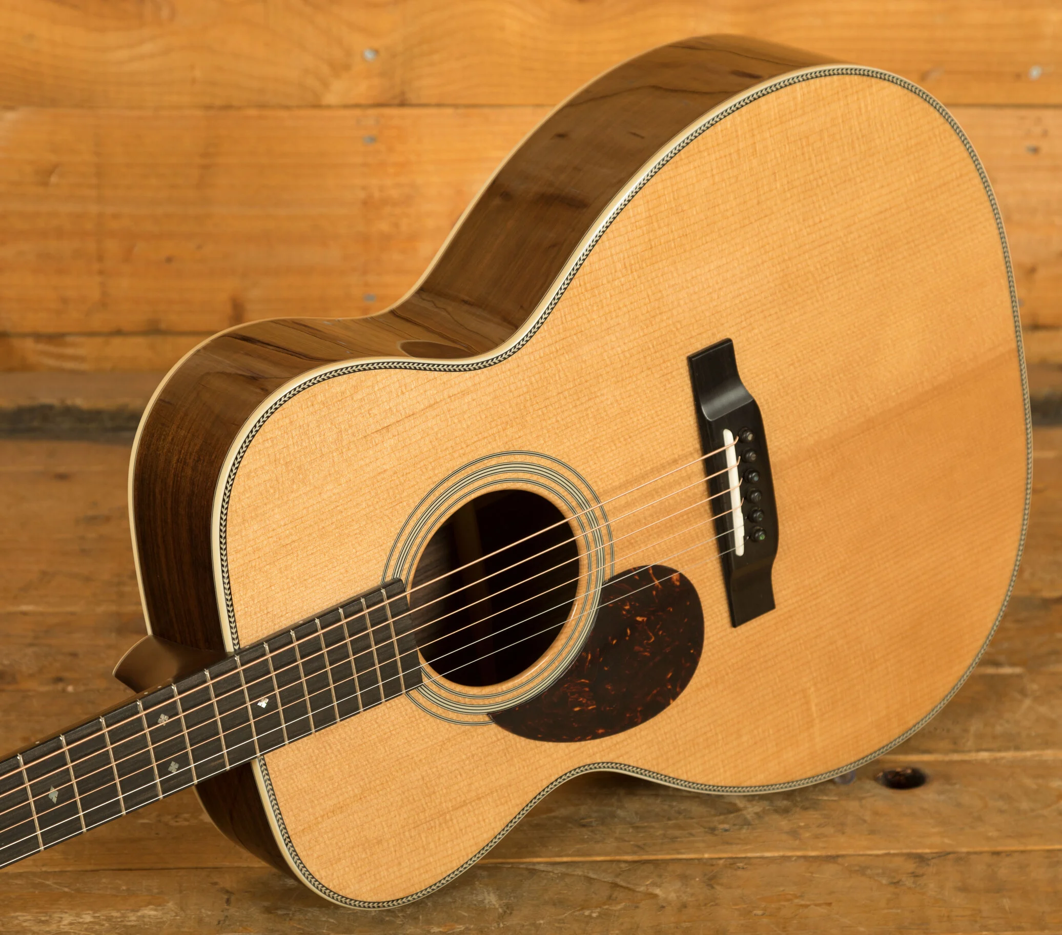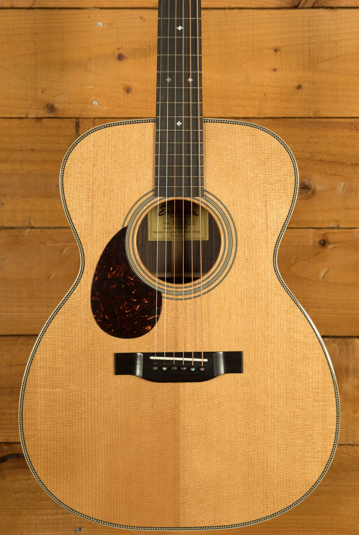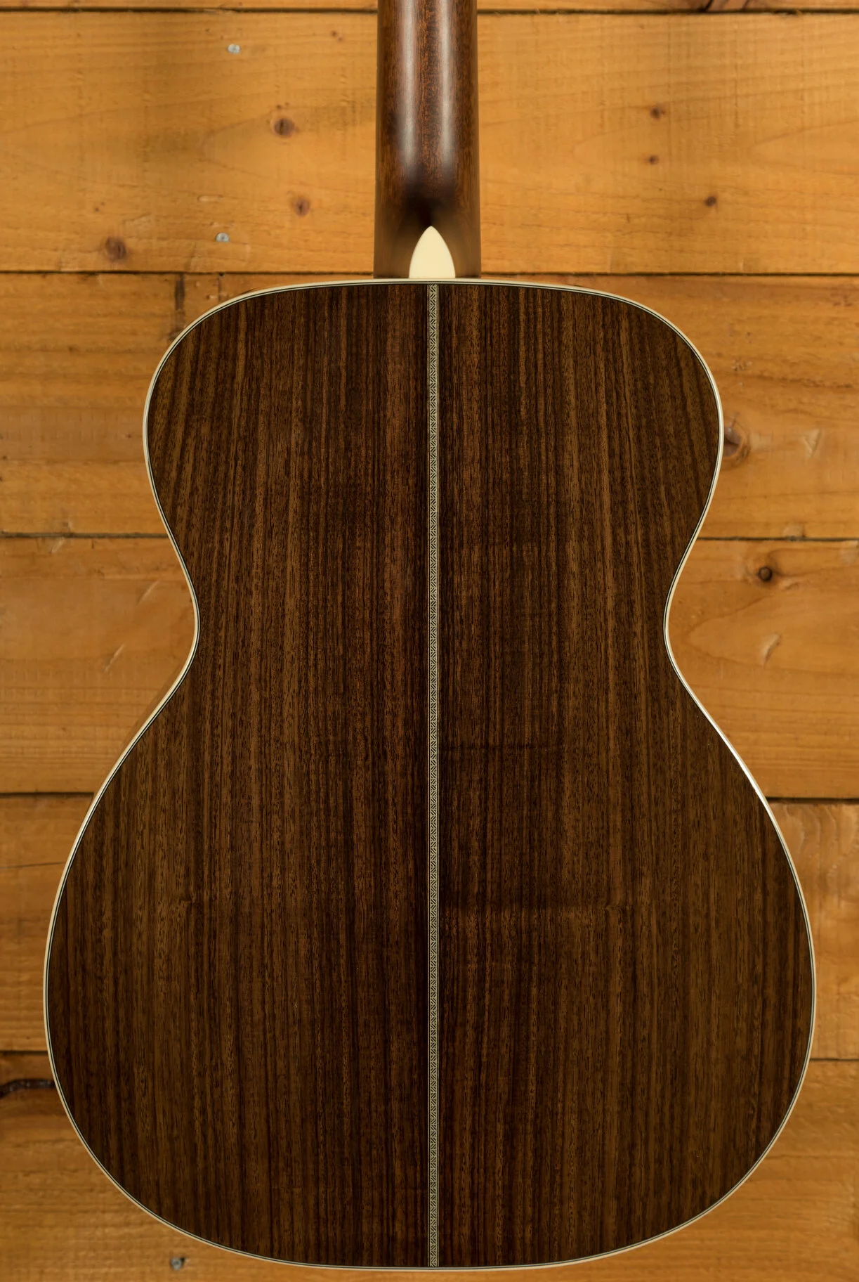 One of the standout features of the E20OM is its hand-carved scalloped X bracing, meticulously crafted to optimise the guitar's tonal response and resonance. The solid Thermo Cured Adirondack spruce top delivers a powerful and dynamic sound, with exceptional projection and tonal clarity. The solid rosewood back and sides contribute to the guitar's rich and resonant tone, adding depth and complexity to your playing.