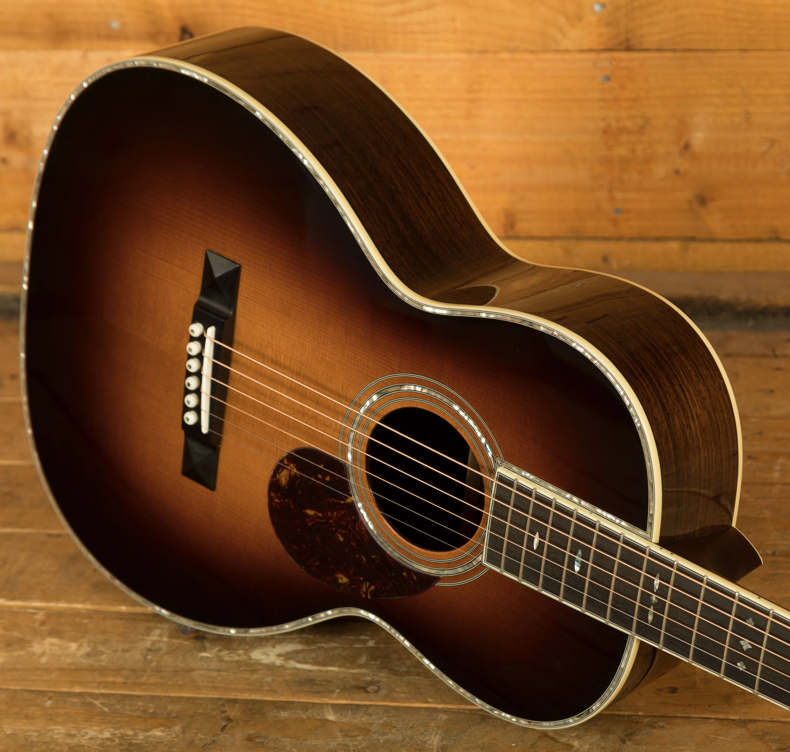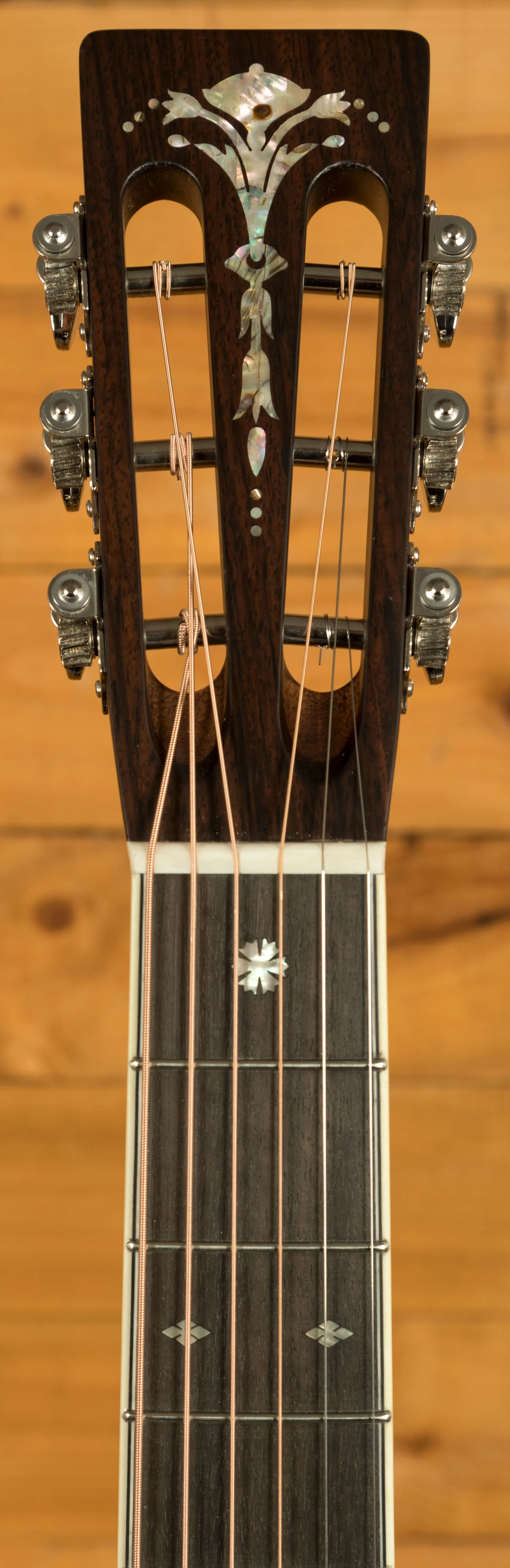 Exuding elegance and sophistication, the E40 OO-TC boasts stunning aesthetic details. The Ebony bridge with Snowflake Inlay and Bone saddle not only provide superior tonal transfer but also add a touch of visual allure. The classic Rosette and Abalone Snowflake inlays on the neck and bridge pins showcase the fine craftsmanship and attention to detail.
