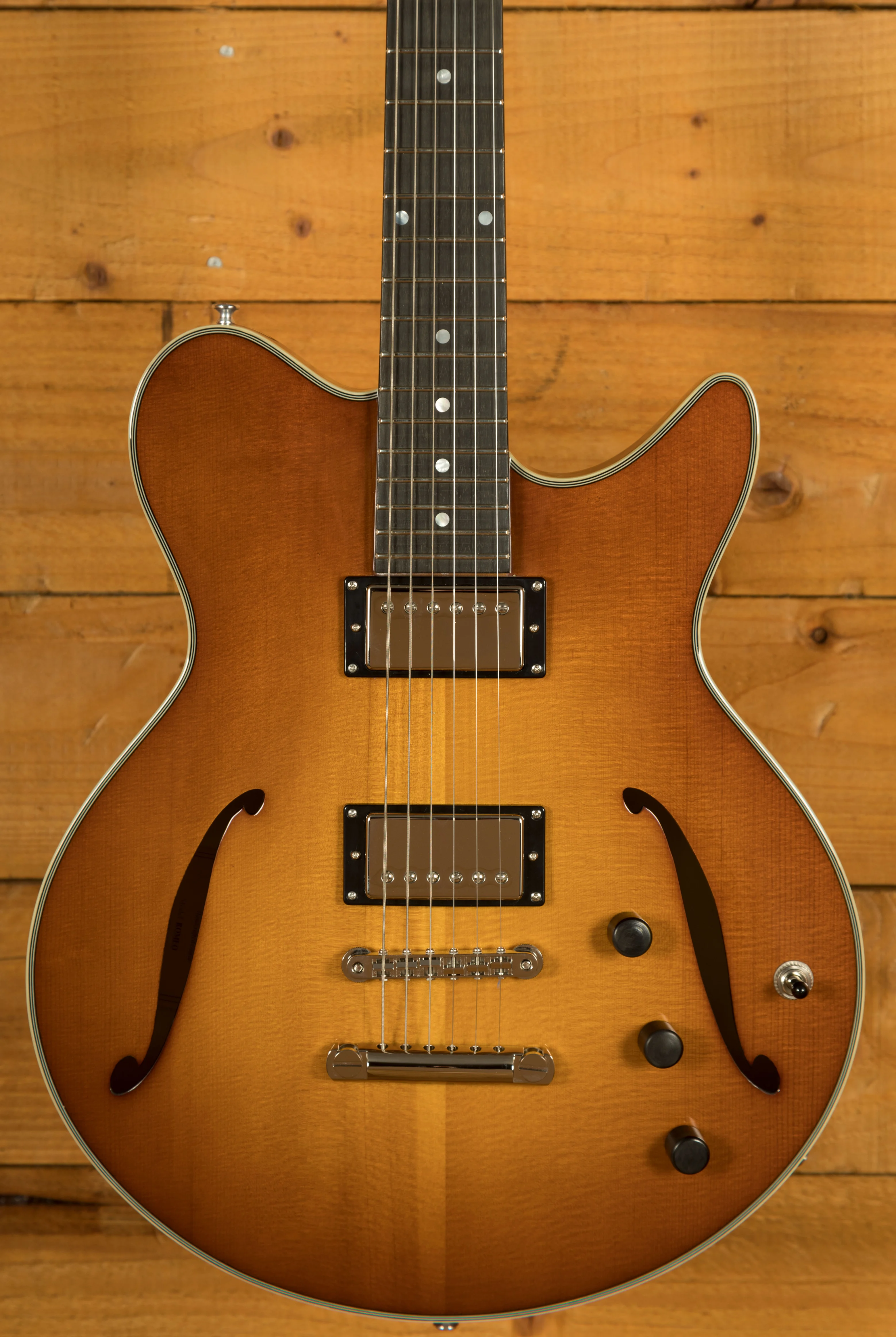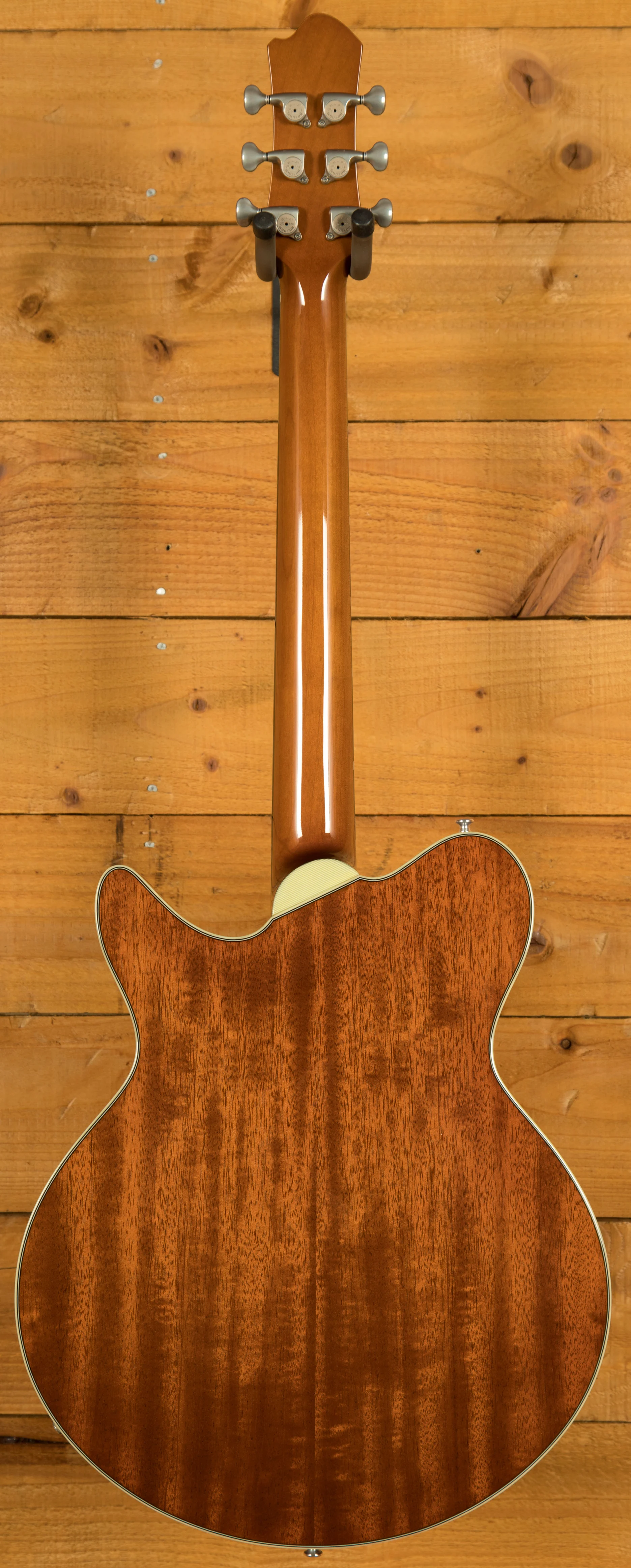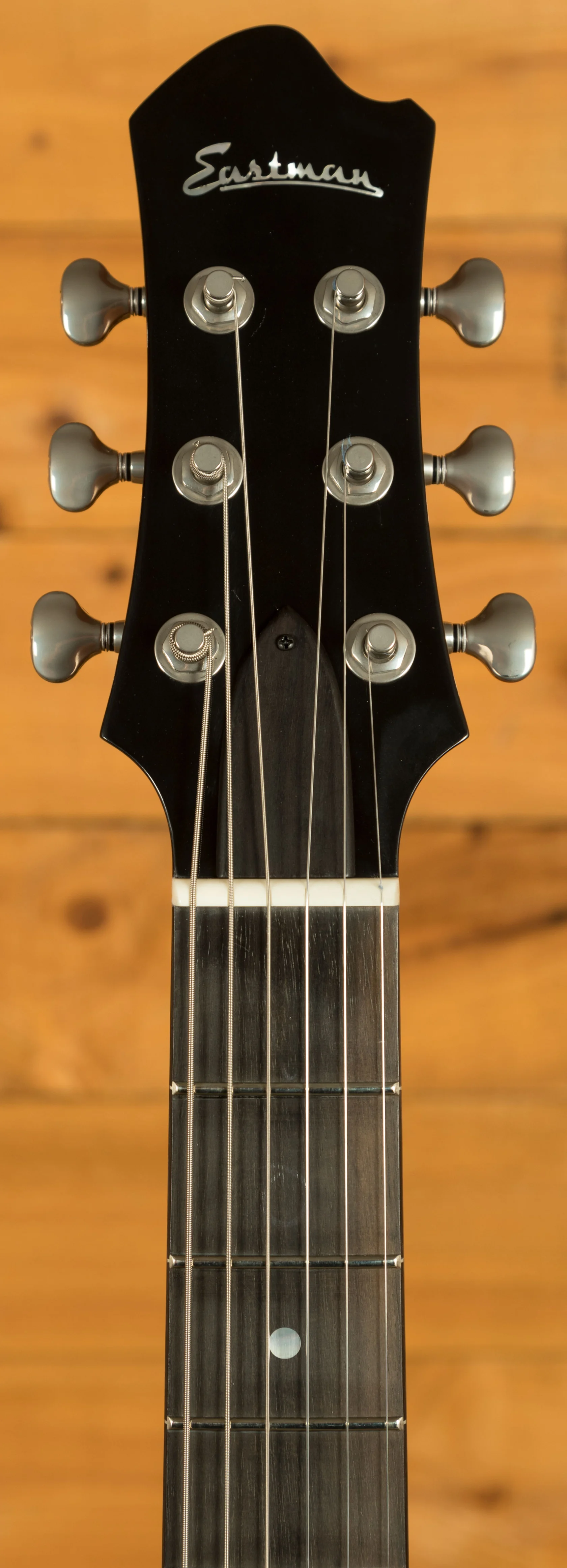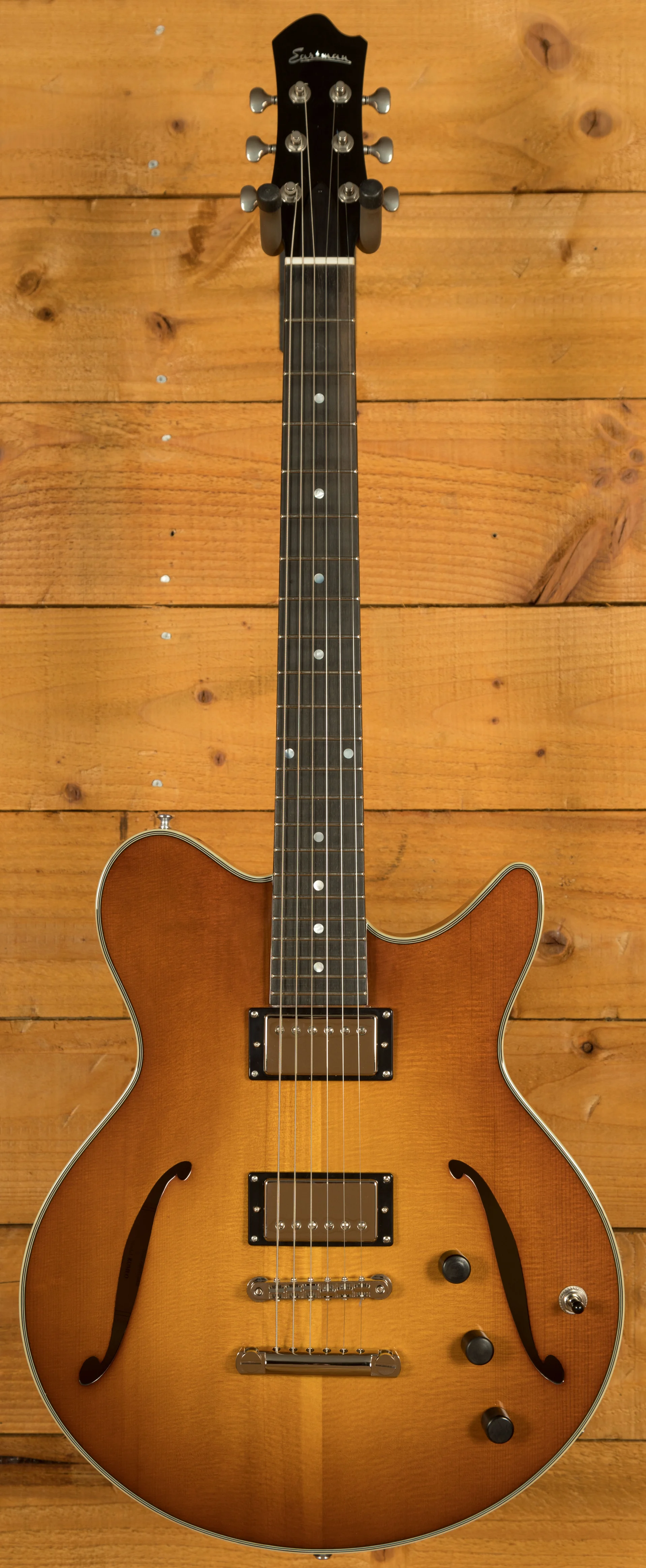 The Eastman Romeo is a guitar that resonates with a timeless allure, showcasing a level of craftsmanship that sets it apart in the world of musical instruments. A Thinline Archtop, it boasts a Solid Spruce top, which has long been revered for its acoustic properties. The choice of Mahogany laminate for the back and sides is not just practical but contributes to the guitar's warm and vibrant tonal character. This construction makes it a versatile instrument that's well-suited for a variety of musical genres, from jazz to blues and beyond.