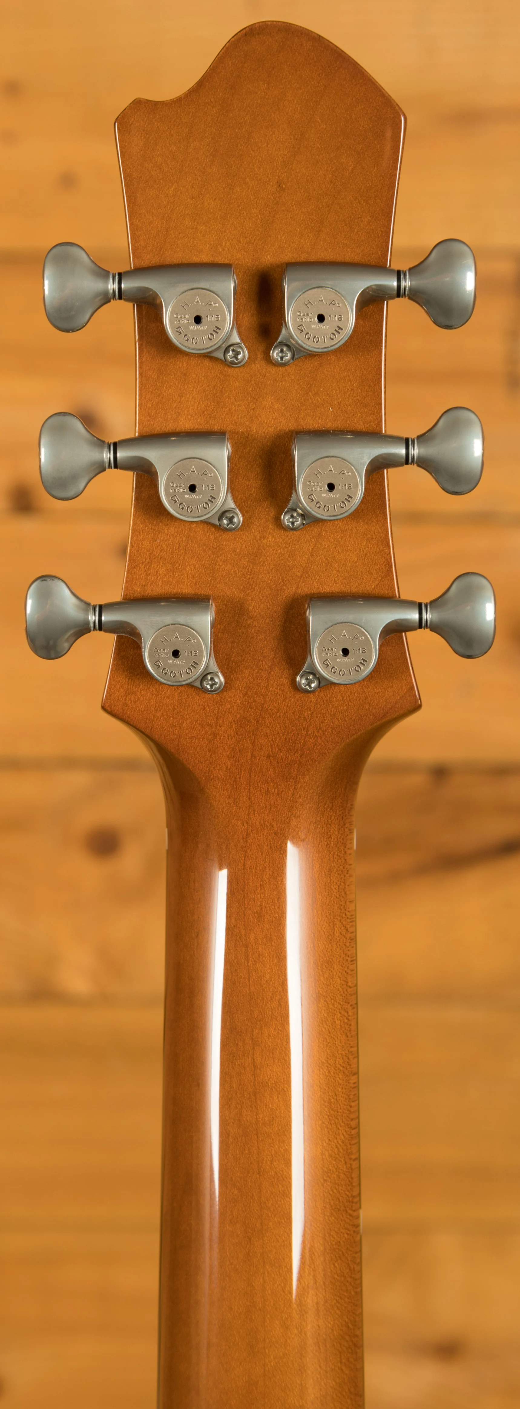 Moving to the Maple neck, we find stability and tonal clarity. The Ebony fingerboard, with its 12" radius, is a pleasure to play on, offering a smooth, comfortable surface for your fingers to glide across. The Traditional Even "C" neck profile is a nod to classic guitar design, providing a familiar feel that's both inviting to newcomers and trusted by seasoned players. Whether you're looking for those warm jazz tones or the grit of blues and rock, the Romeo is a versatile partner. With a scale length of 24.75 inches, it's incredibly comfortable to play, allowing for effortless string bending and chord transitions. The Bone nut enhances sustain and note clarity, ensuring every note you play is crisp and articulate. Pearl Dot inlays on the fingerboard add a subtle touch of elegance.
