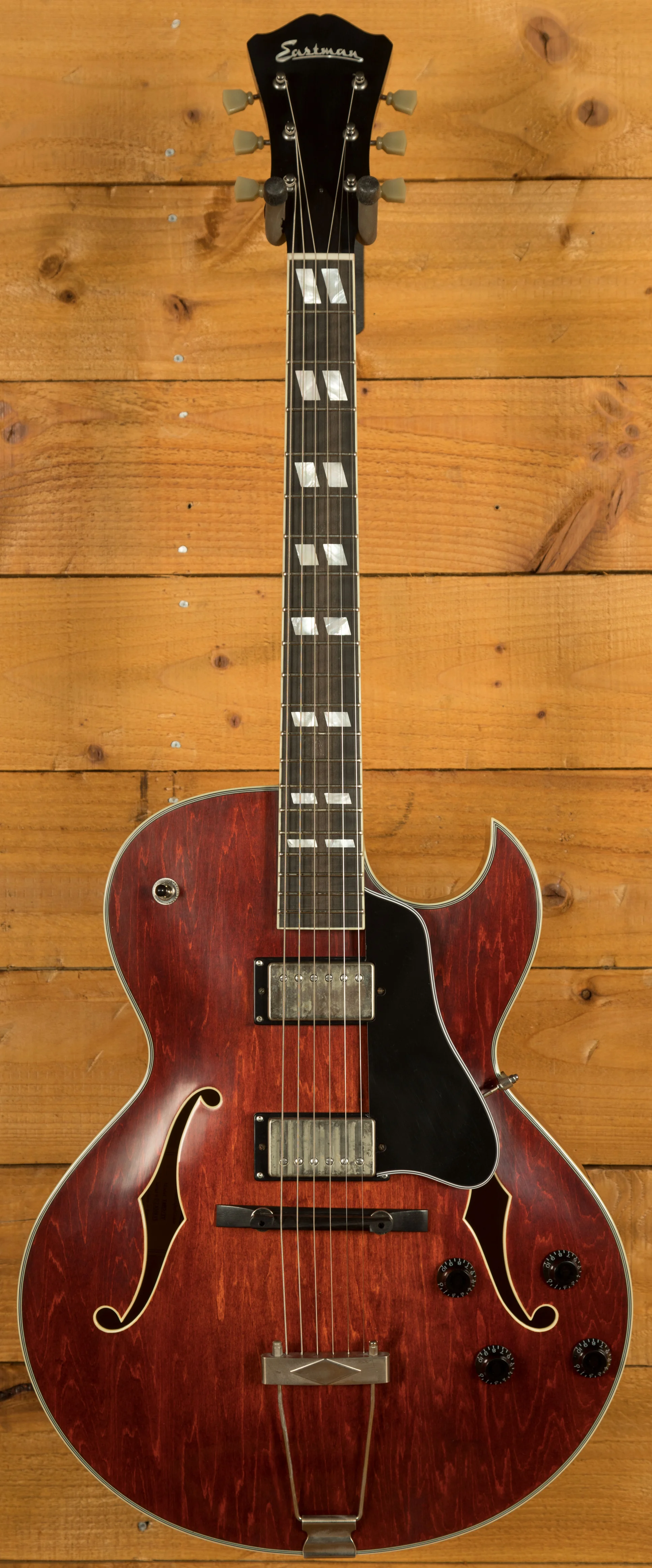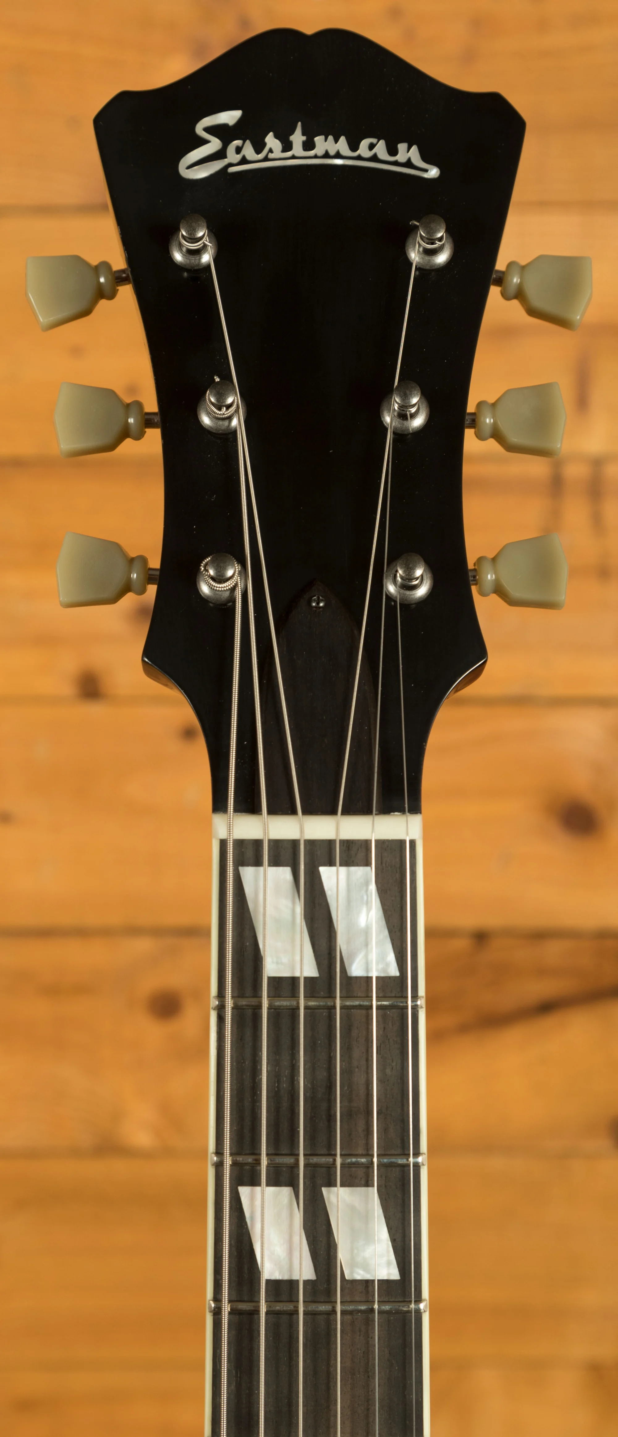 Introducing Eastman's Truetone Vintage Gloss - a perfect blend between a relic and a non-relic instrument. It boasts the same vintage vibe as the hand-aged Antique Varnish series, but without heavy wear and tear. The thin poly finish, inspired by Dana Bourgeois, allows players to naturally create their own marks over time. With top-notch aged hardware and pickups, the Truetone Vintage Gloss offers boutique quality at a great value. It's a quicker and more accessible option compared to the limited Antique Varnish series, making it an exciting choice for vintage guitar enthusiasts.