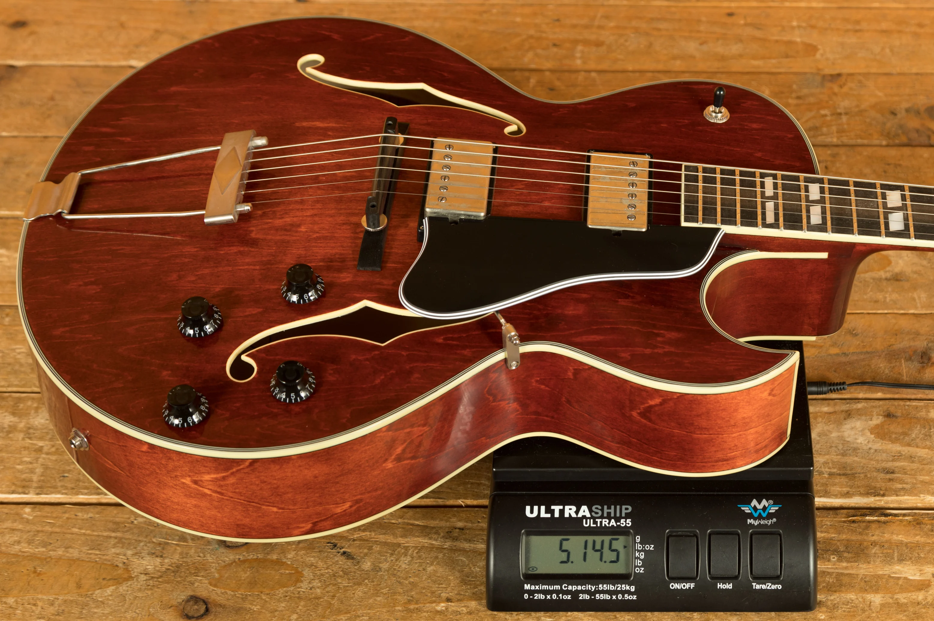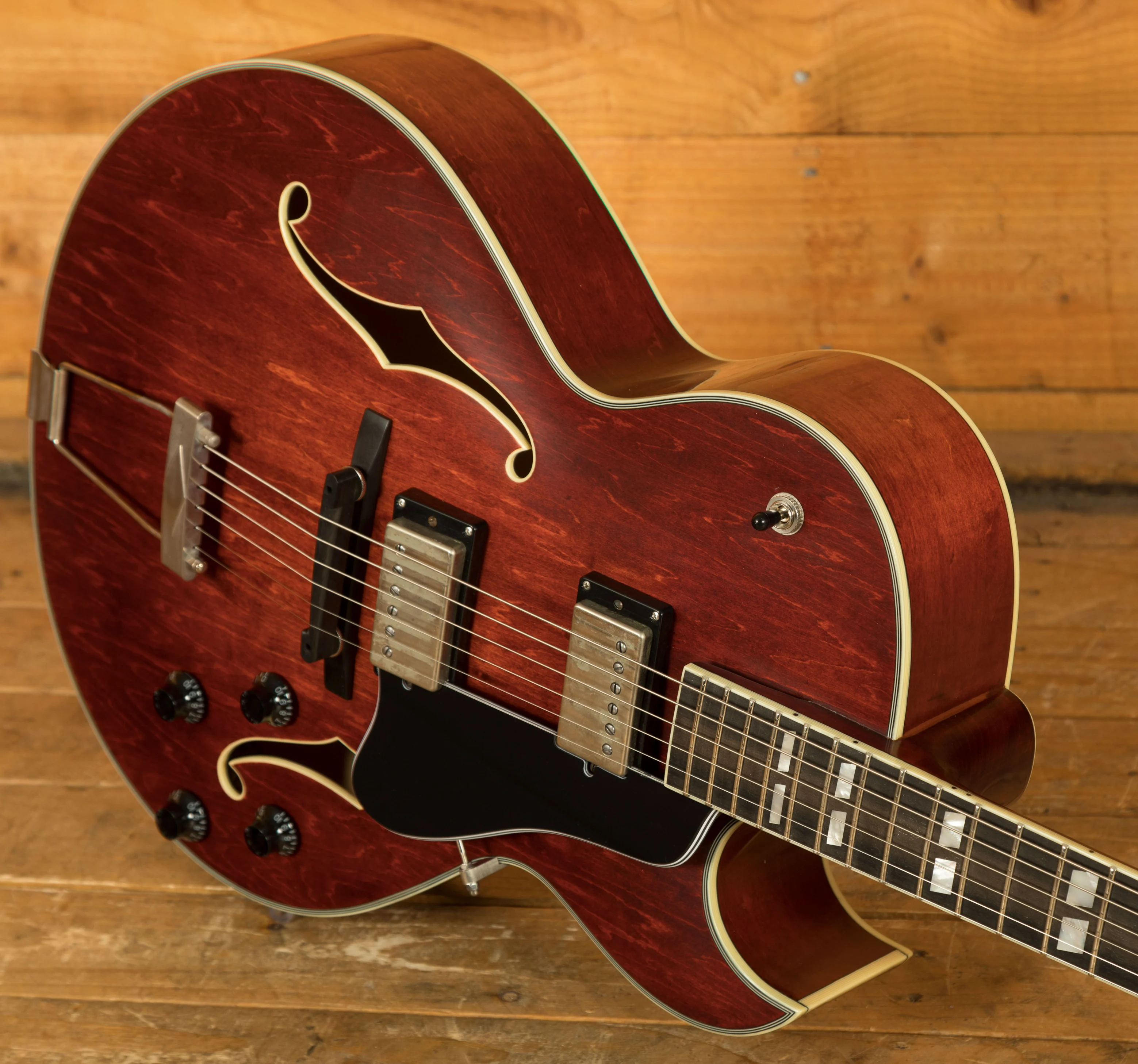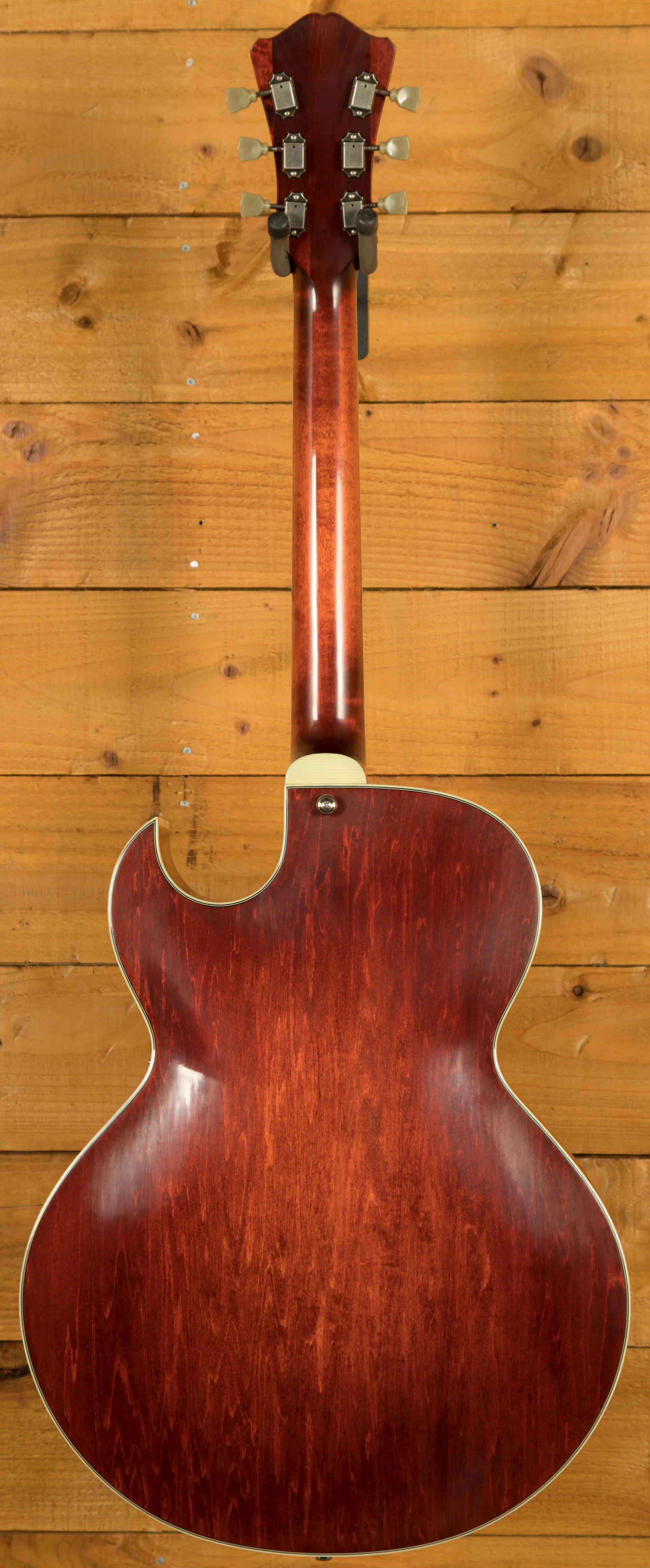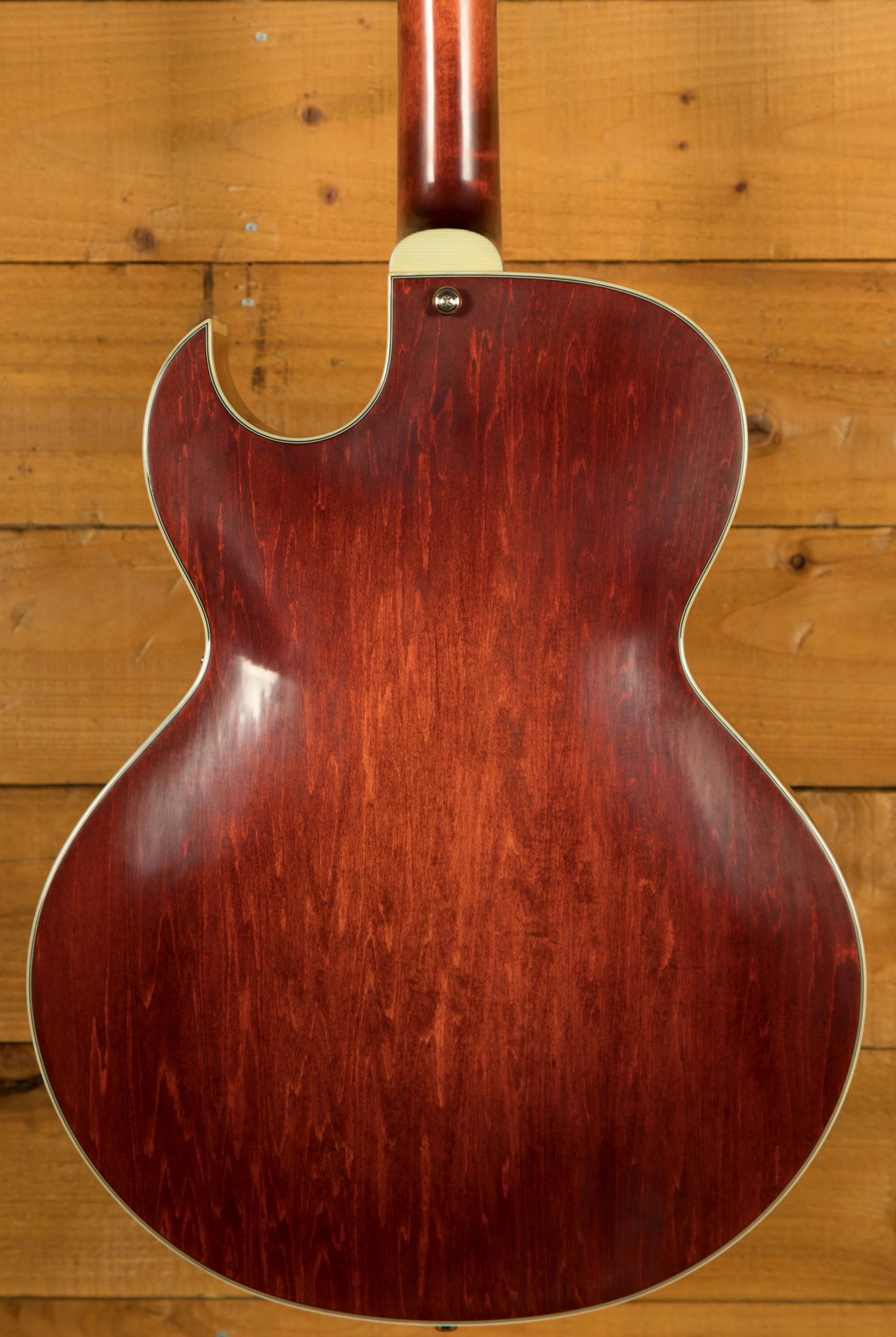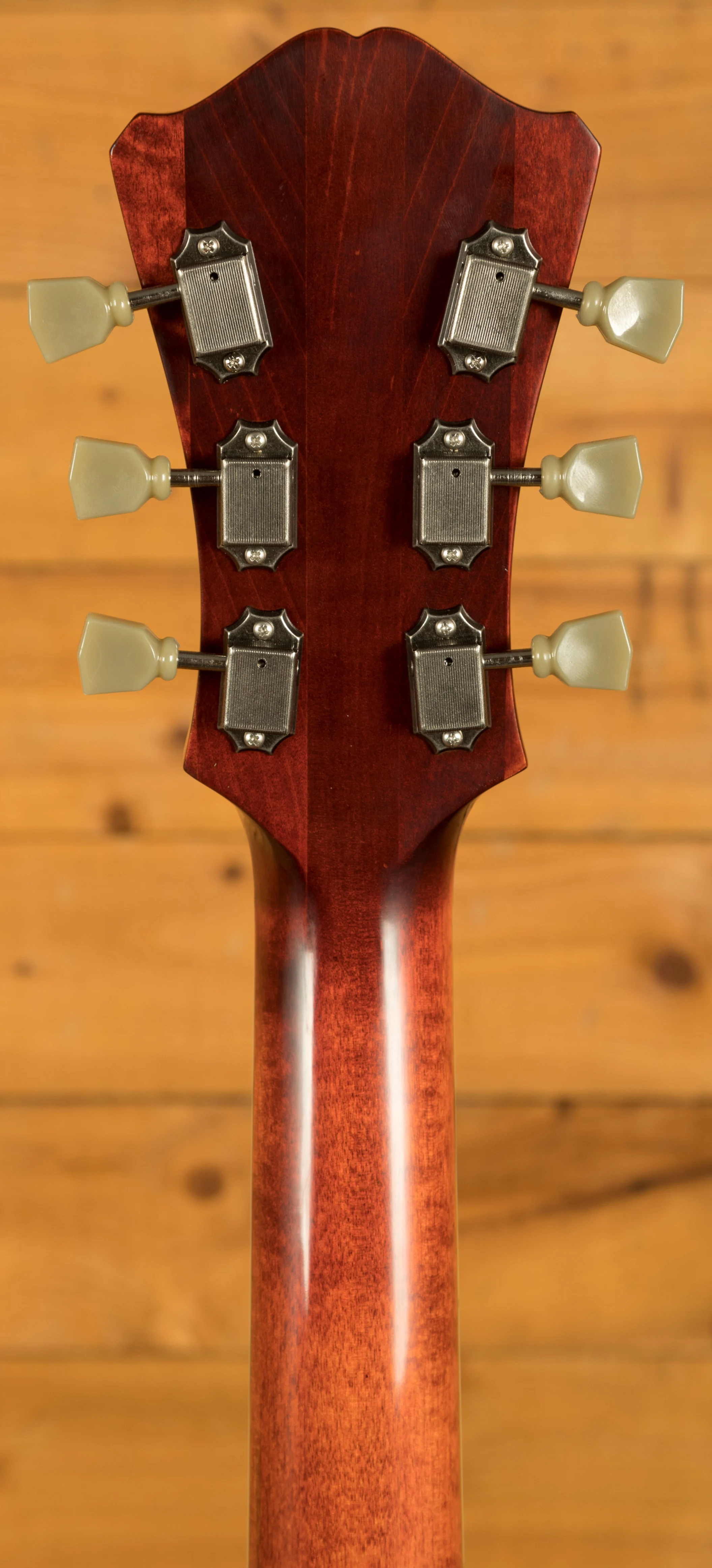 The body of the T49D/TV boasts a classic Florentine design, exuding elegance and style. Crafted from laminated maple, it delivers a balanced tone with superb projection. The body dimensions of 16" x 3 9/32" strike the perfect balance between comfort and resonance, making this guitar a joy to play both in the studio and on stage. The Truetone Vintage Gloss finish adds a touch of vintage allure, while the ivoroid binding and pearl split block inlays enhance the guitar's visual appeal.