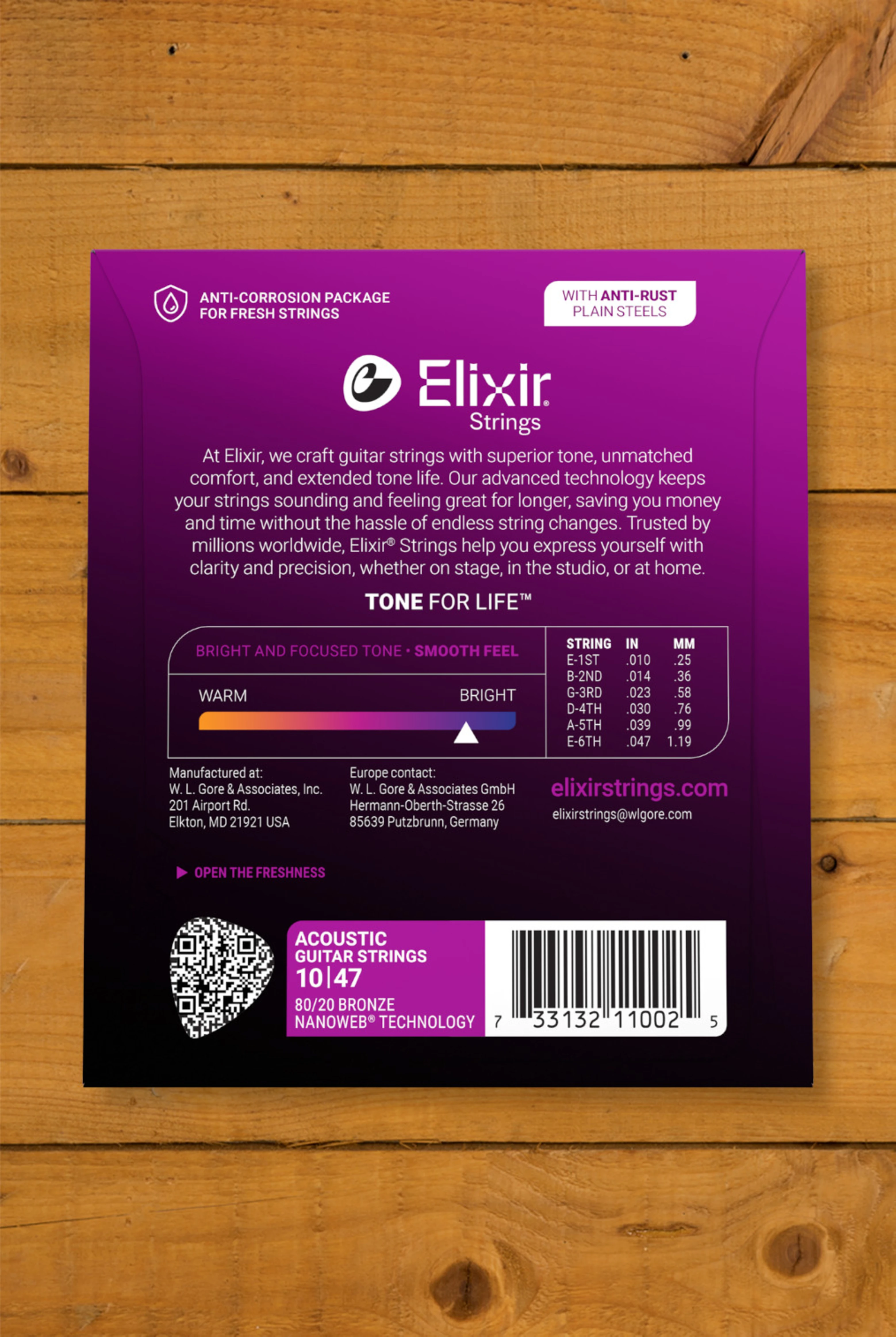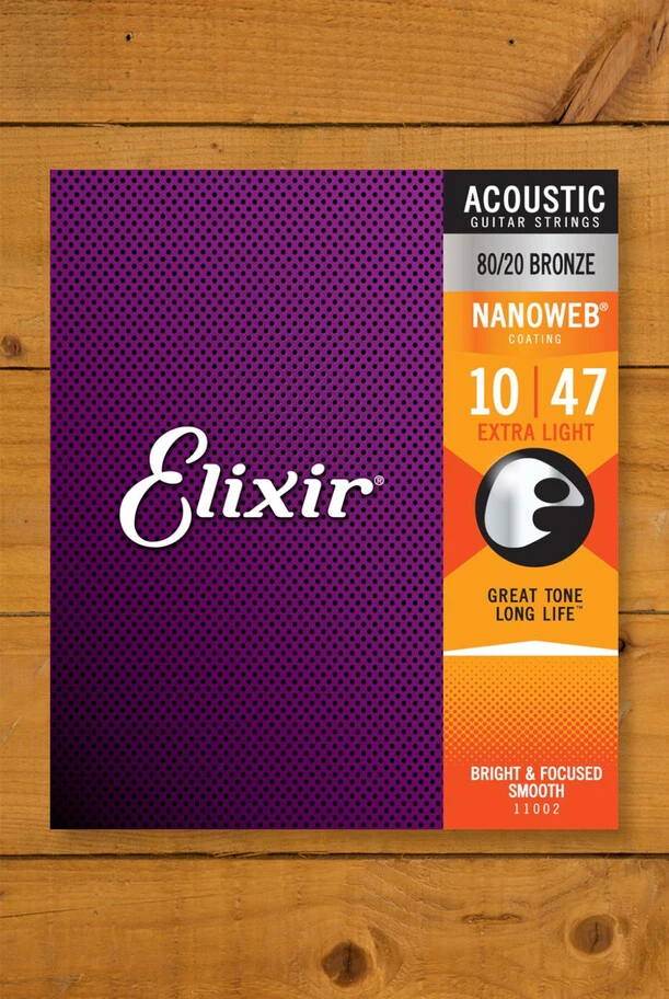 Elixir Acoustic 80/20 Bronze with NANOWEB Coating deliver a bright, lively together with the extended life that players have come to expect from Elixir Strings.