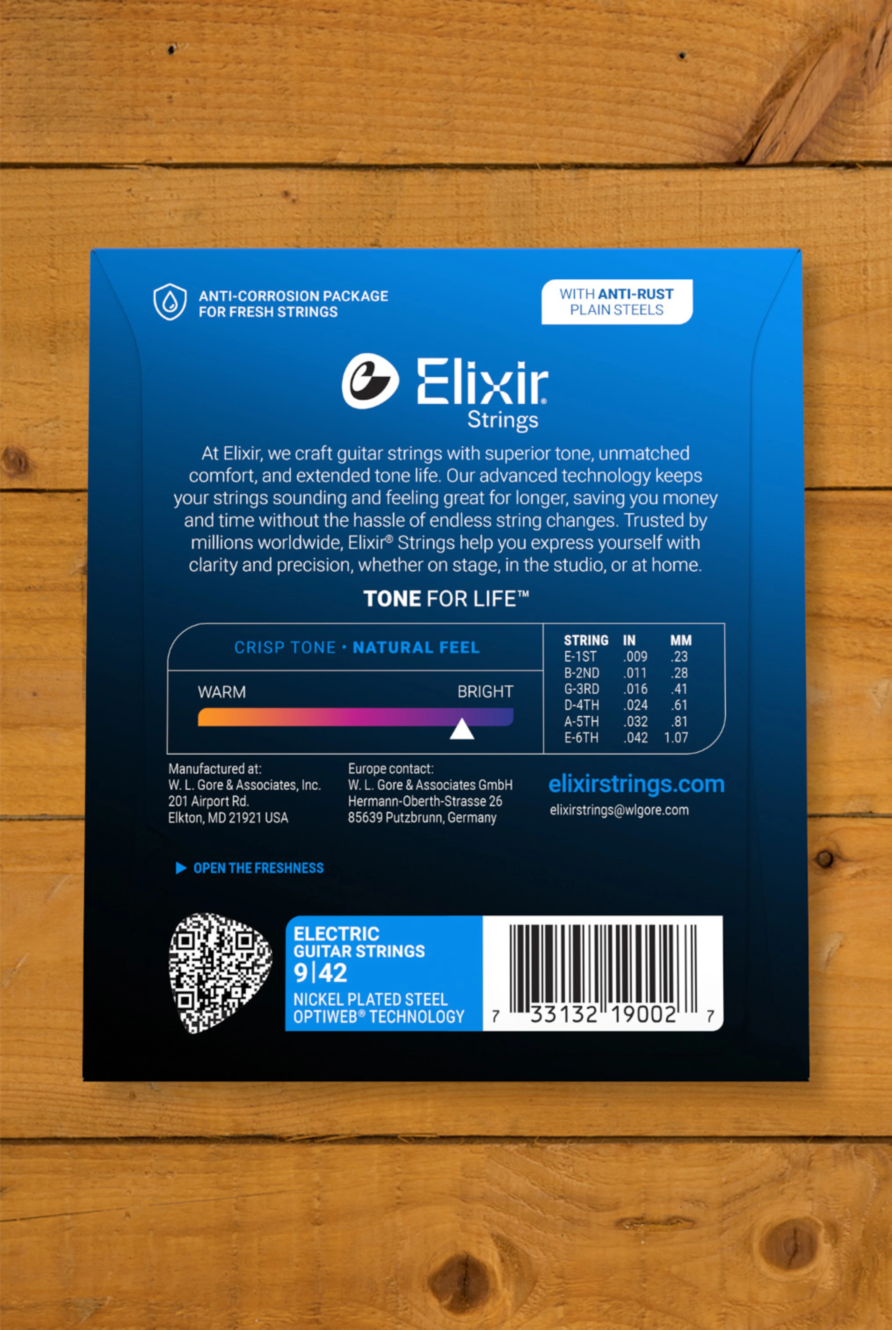 Elixir Electric Nickel Plated Steel Strings with OPTIWEB Coating give you the performance of a natural string - that crisp tone, natural feel and playable grip you know and love - without sacrificing the signature long-lasting tone life of Elixir Strings.