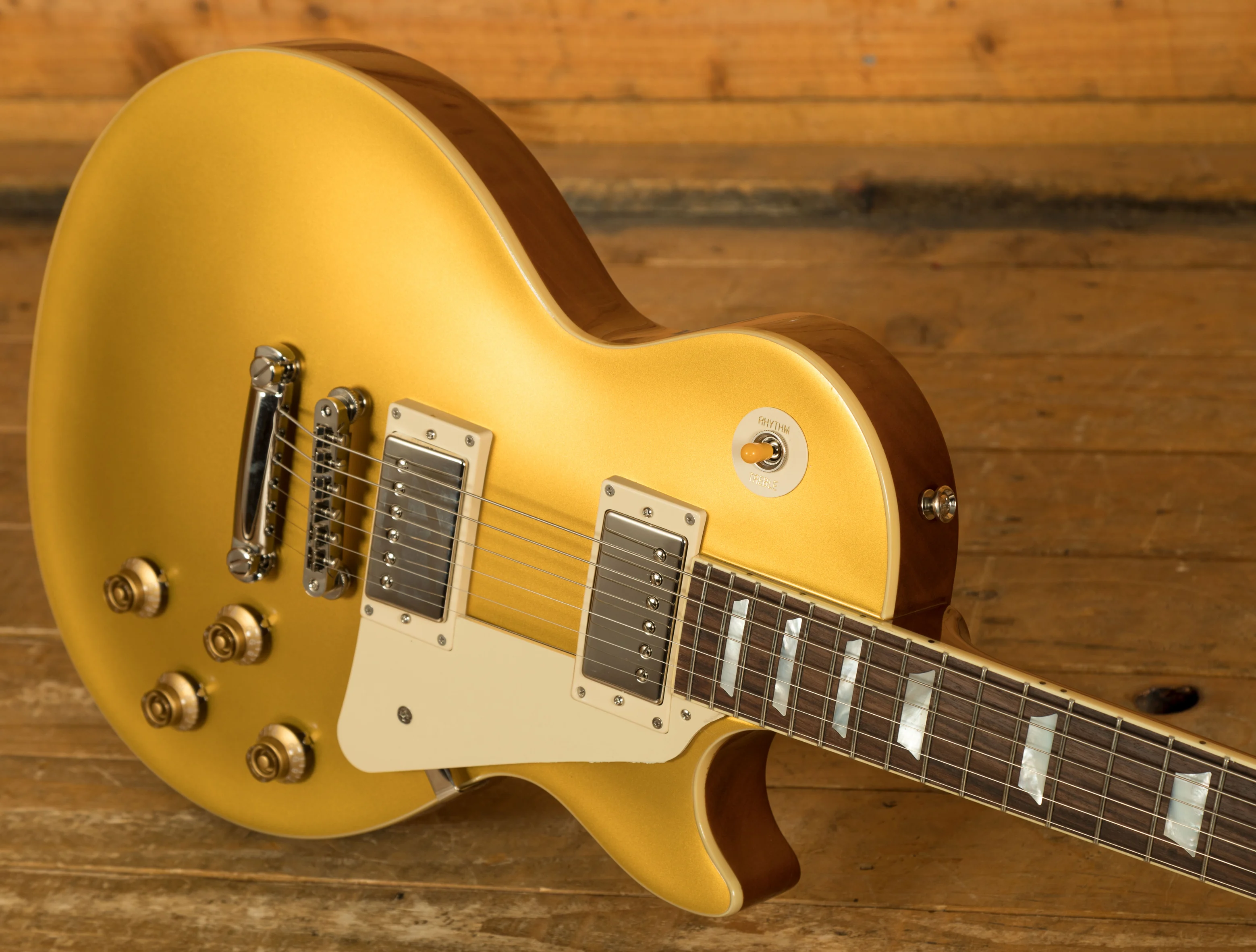 Electronics are a standout feature of the 1957 Goldtop Reissue. The guitar is equipped with two USA-made Gibson Custombucker pickups featuring Alnico 3 magnets. These pickups are known for their warm, vintage tone and dynamic response, capturing the essence of early humbucker sound. They are hand-wired to high-quality CTS potentiometers, Luxe "Bumblebee" paper-in-oil capacitors, a Switchcraft pickup selector toggle, and a Switchcraft 1/4" output jack - all premium components selected to preserve tonal integrity and ensure long-term reliability.