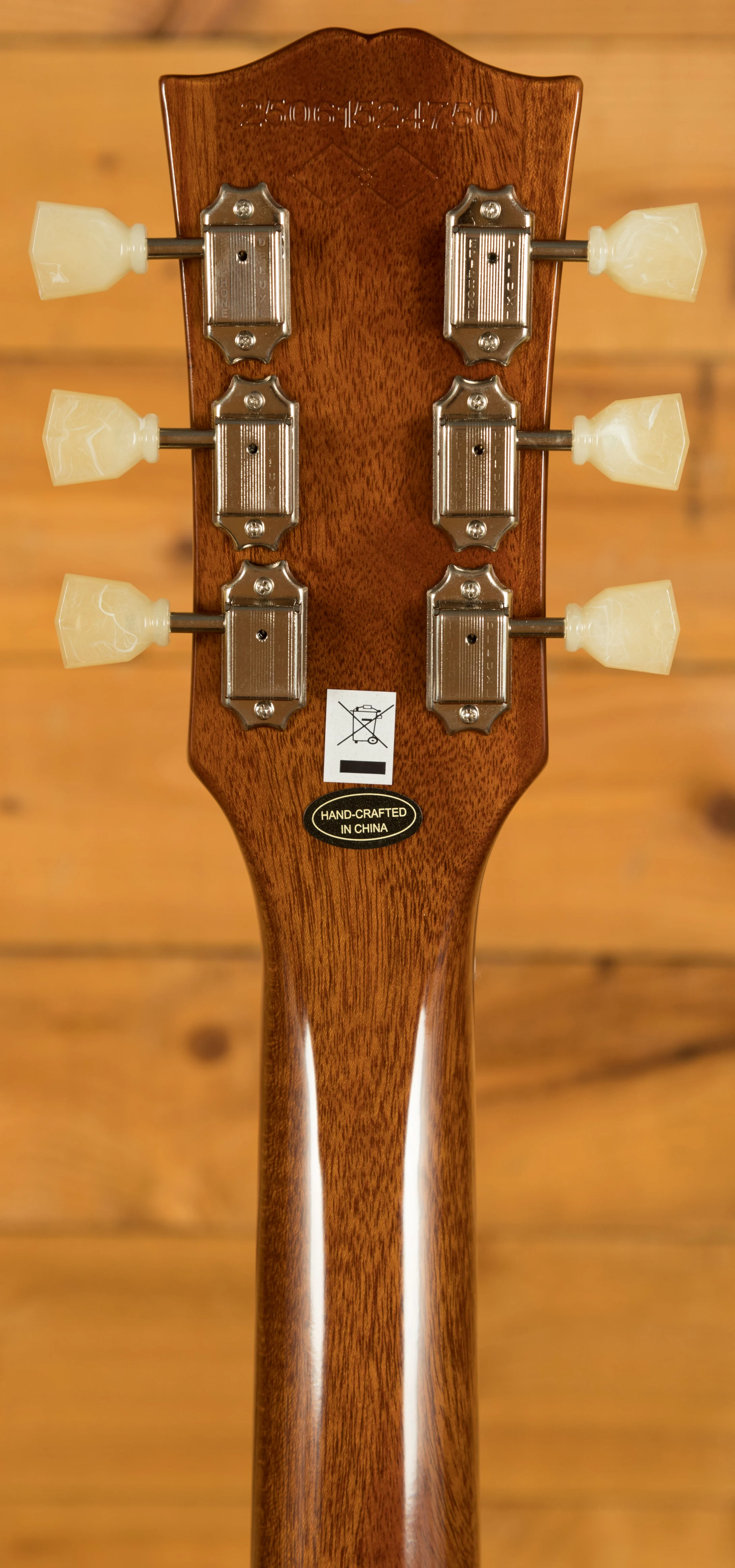 The neck is a one-piece mahogany design with a long tenon joint and a 1950s Rounded Medium C profile, offering excellent sustain, structural integrity, and a familiar feel for players who prefer a more substantial grip. The rosewood fretboard is adorned with mother-of-pearl trapezoid inlays and features 22 medium jumbo frets, ideal for both smooth bending and accurate intonation. Additional vintage-accurate features include historically sized side dot markers and a Gibson-style open-book headstock with an aged Epiphone logo and "Les Paul Model" silkscreened in gold.