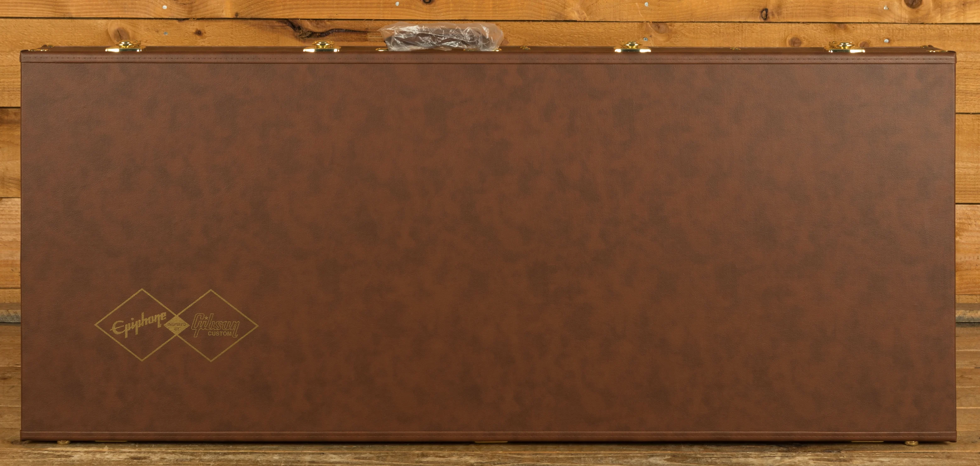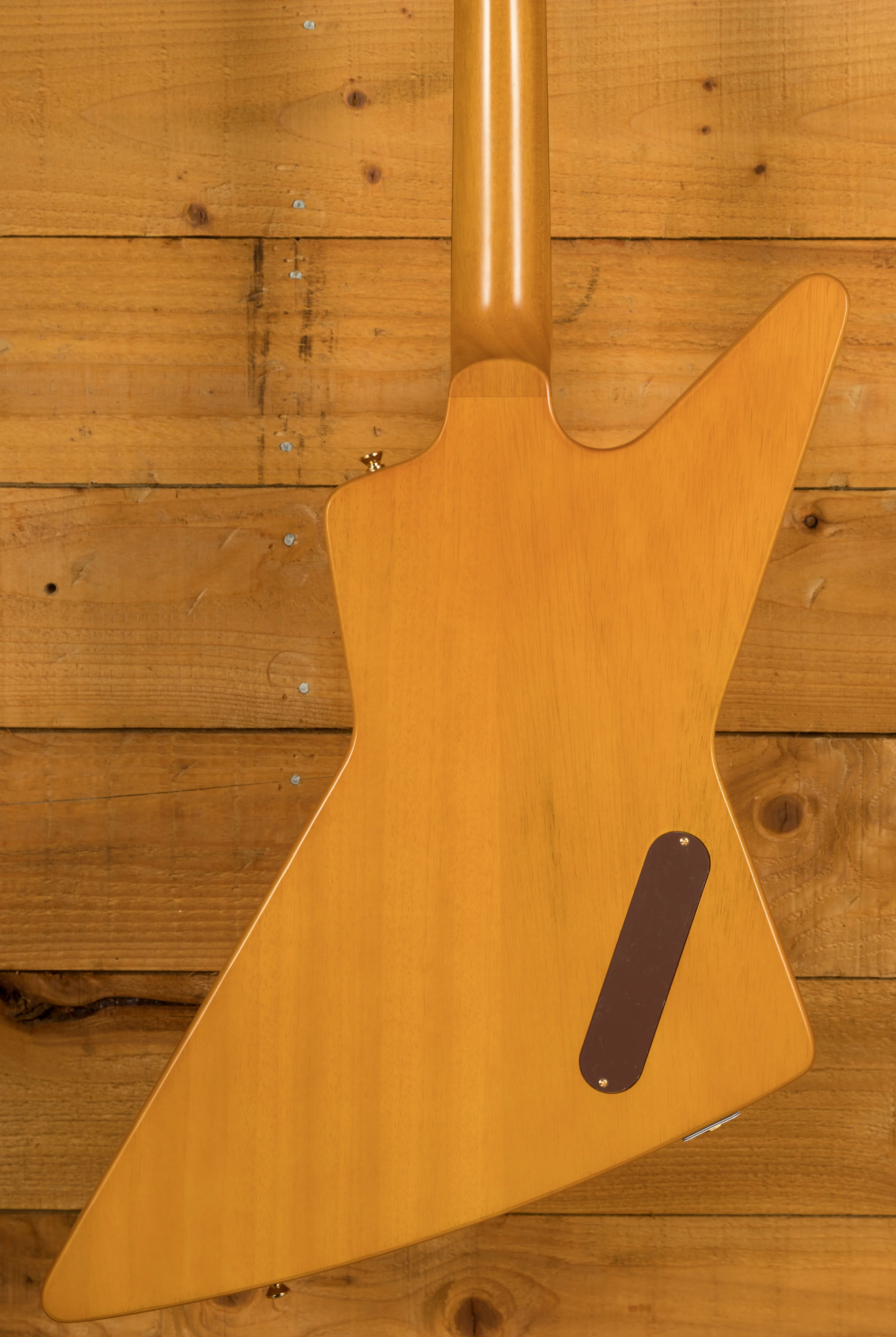 Emblazoned on the back of the headstock, an Epiphone x Gibson Custom logo proudly signifies the collaboration between two iconic brands, assuring you of the instrument's exceptional quality and authenticity. To safeguard your cherished investment, an included hardshell case offers superior protection during transportation and storage, ensuring your Epiphone 1958 Korina Explorer remains pristine and ready for every musical endeavour.