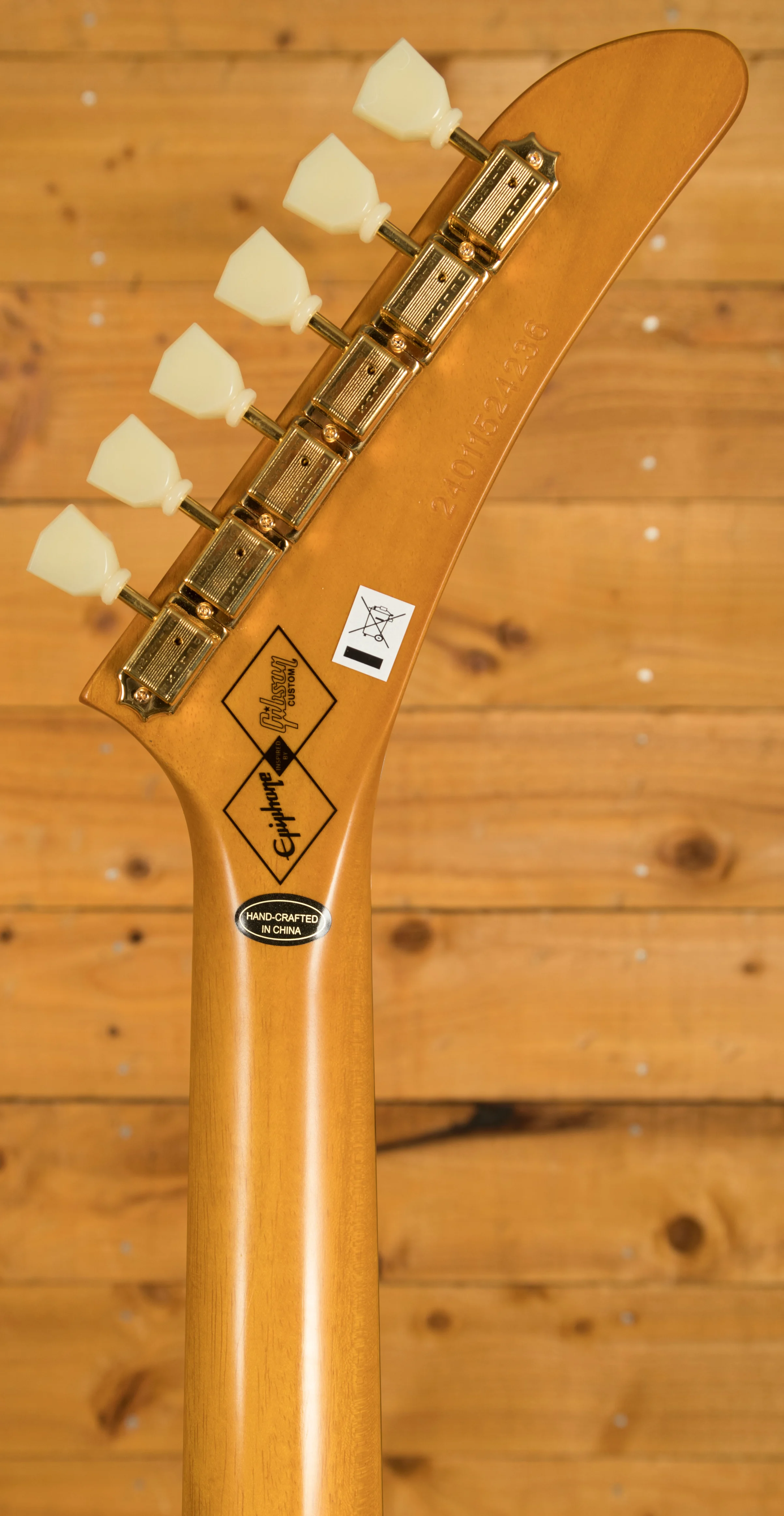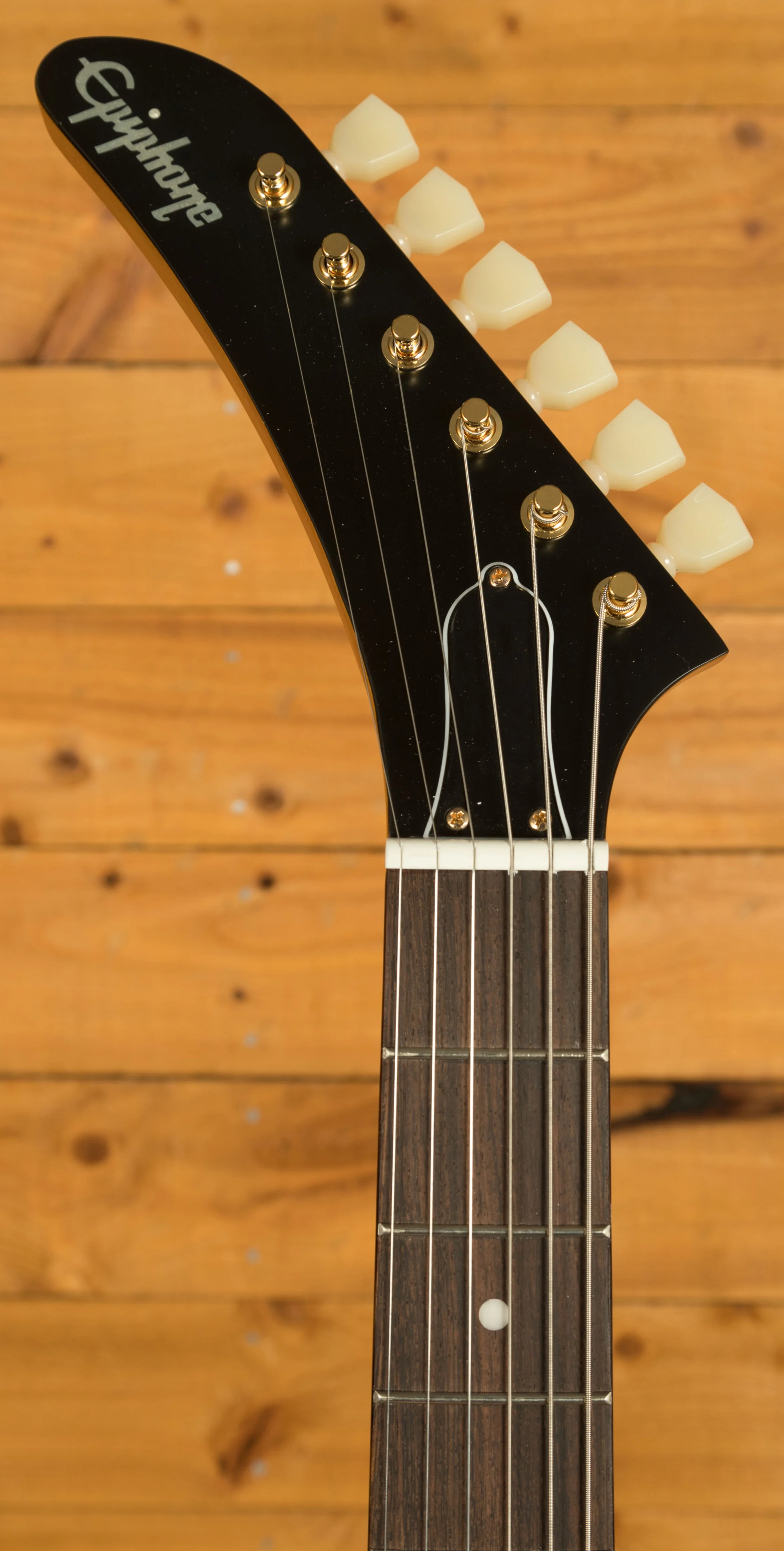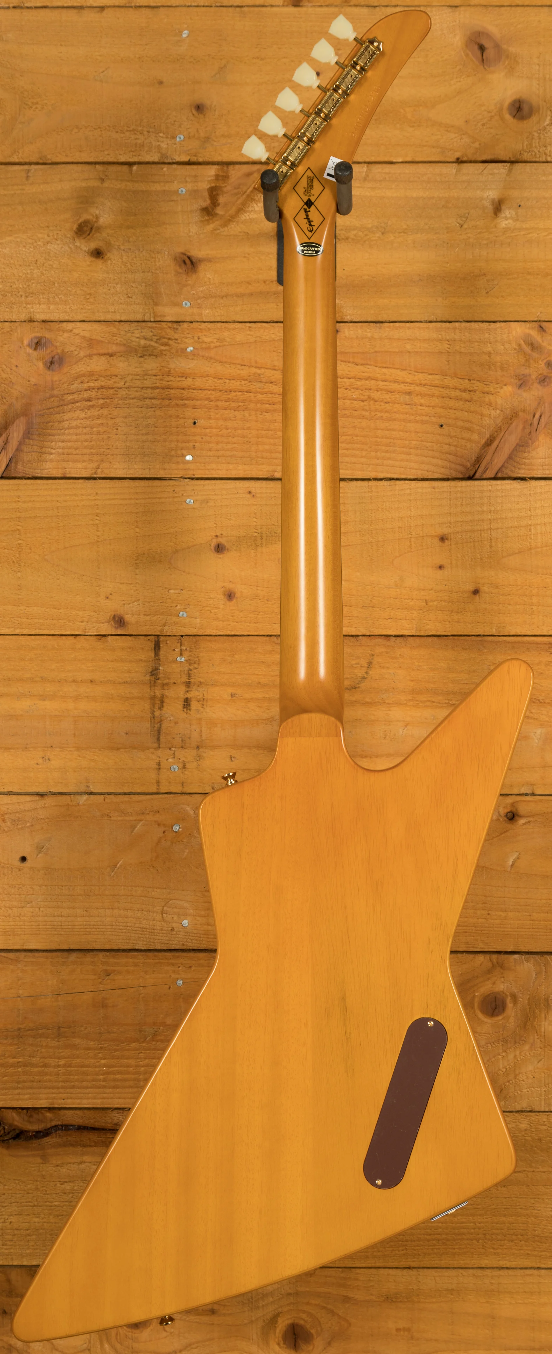 To further elevate its appeal, the Epiphone 1958 Korina Explorer is adorned with exquisite appointments. The Indian laurel fretboard exudes elegance and smoothness, providing the perfect platform for your fingers to effortlessly glide across the 22 medium jumbo frets. The Graph Tech nut ensures precise string spacing and impeccable tuning stability, allowing you to explore the full spectrum of your musical expression without compromise.