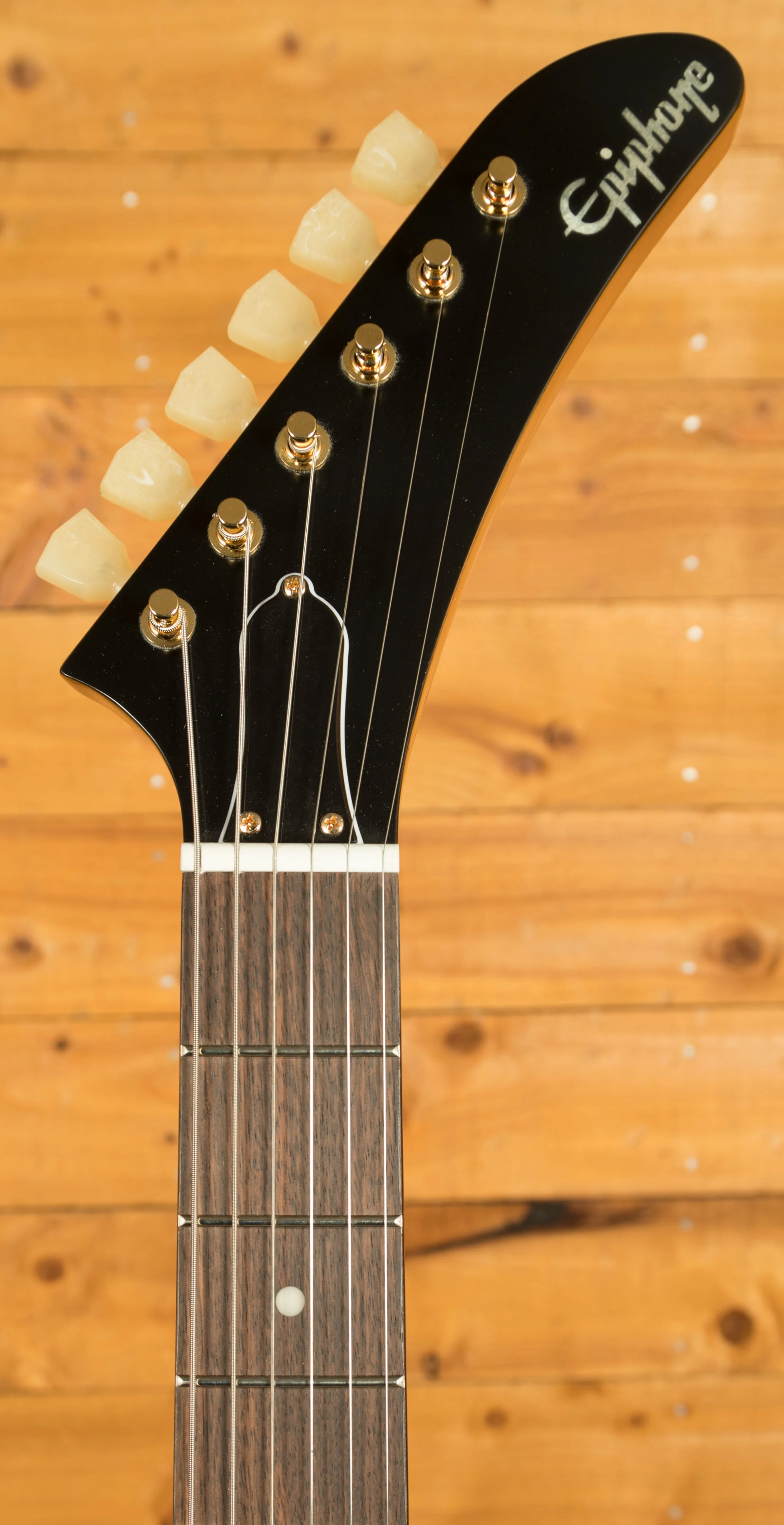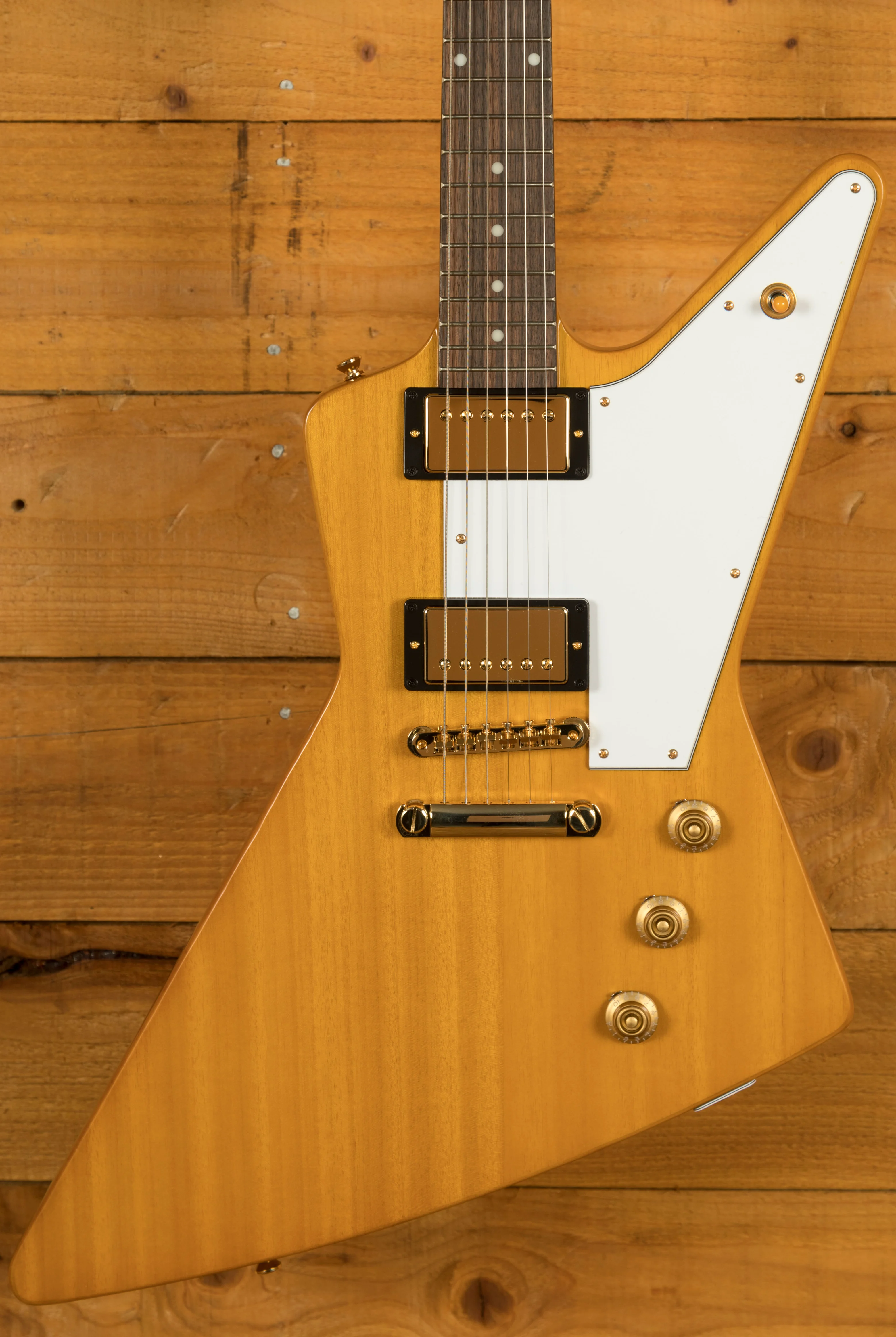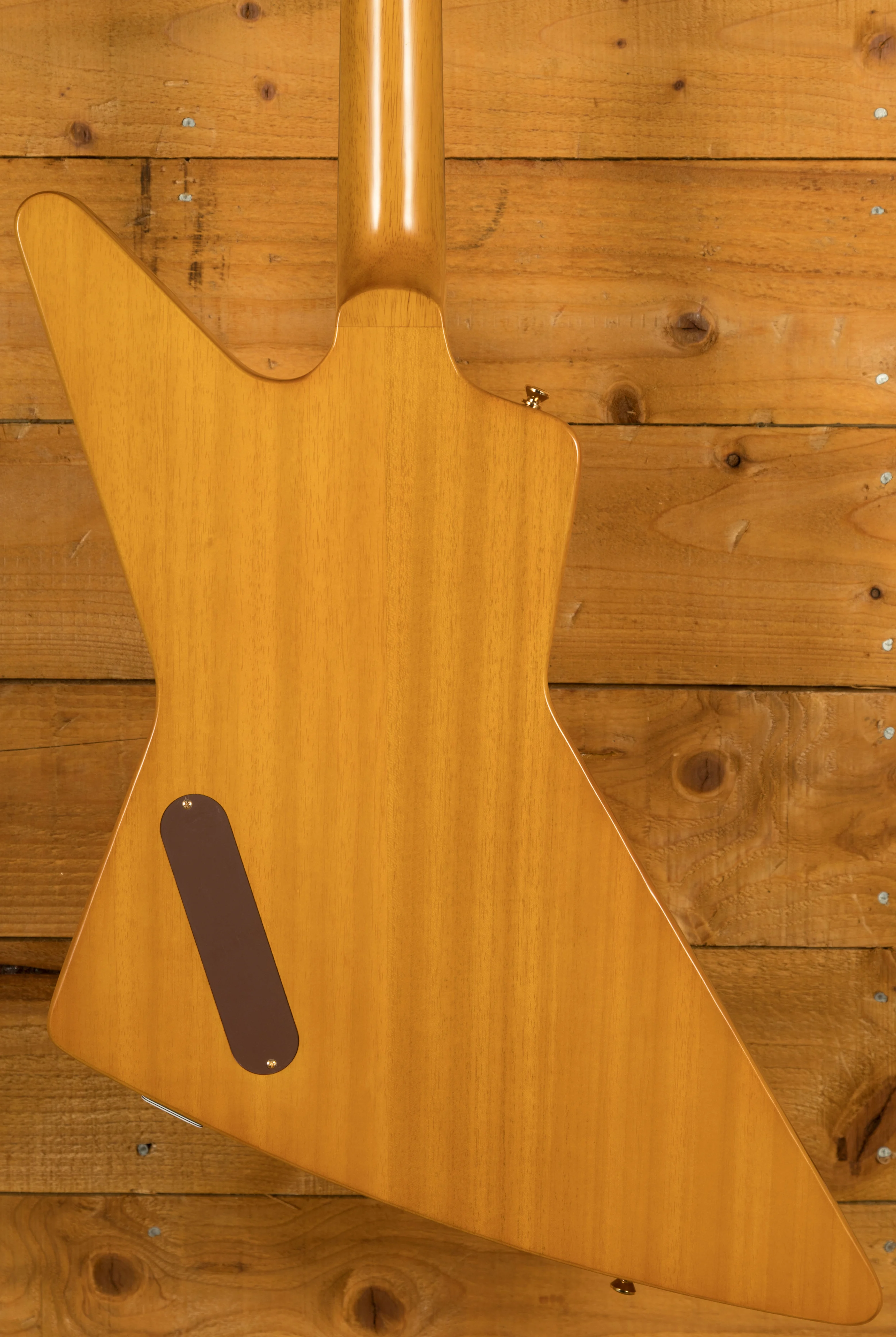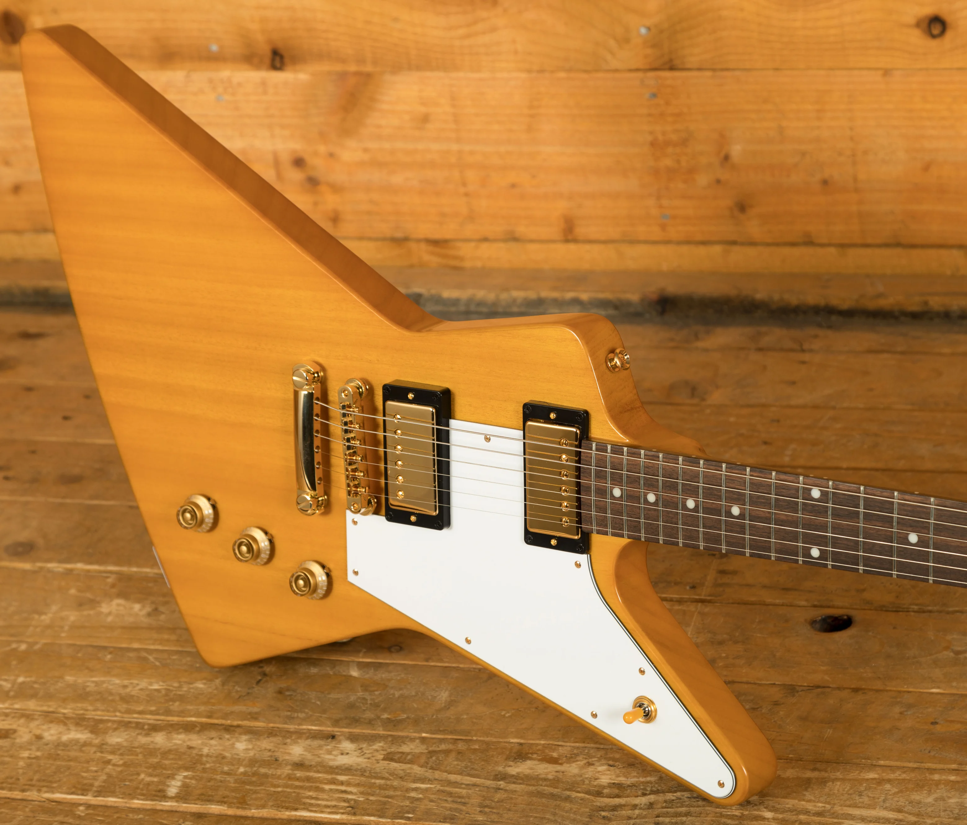 To further elevate its appeal, the Epiphone 1958 Korina Explorer is adorned with exquisite appointments. The Indian laurel fretboard exudes elegance and smoothness, providing the perfect platform for your fingers to effortlessly glide across the 22 medium jumbo frets. The Graph Tech nut ensures precise string spacing and impeccable tuning stability, allowing you to explore the full spectrum of your musical expression without compromise.