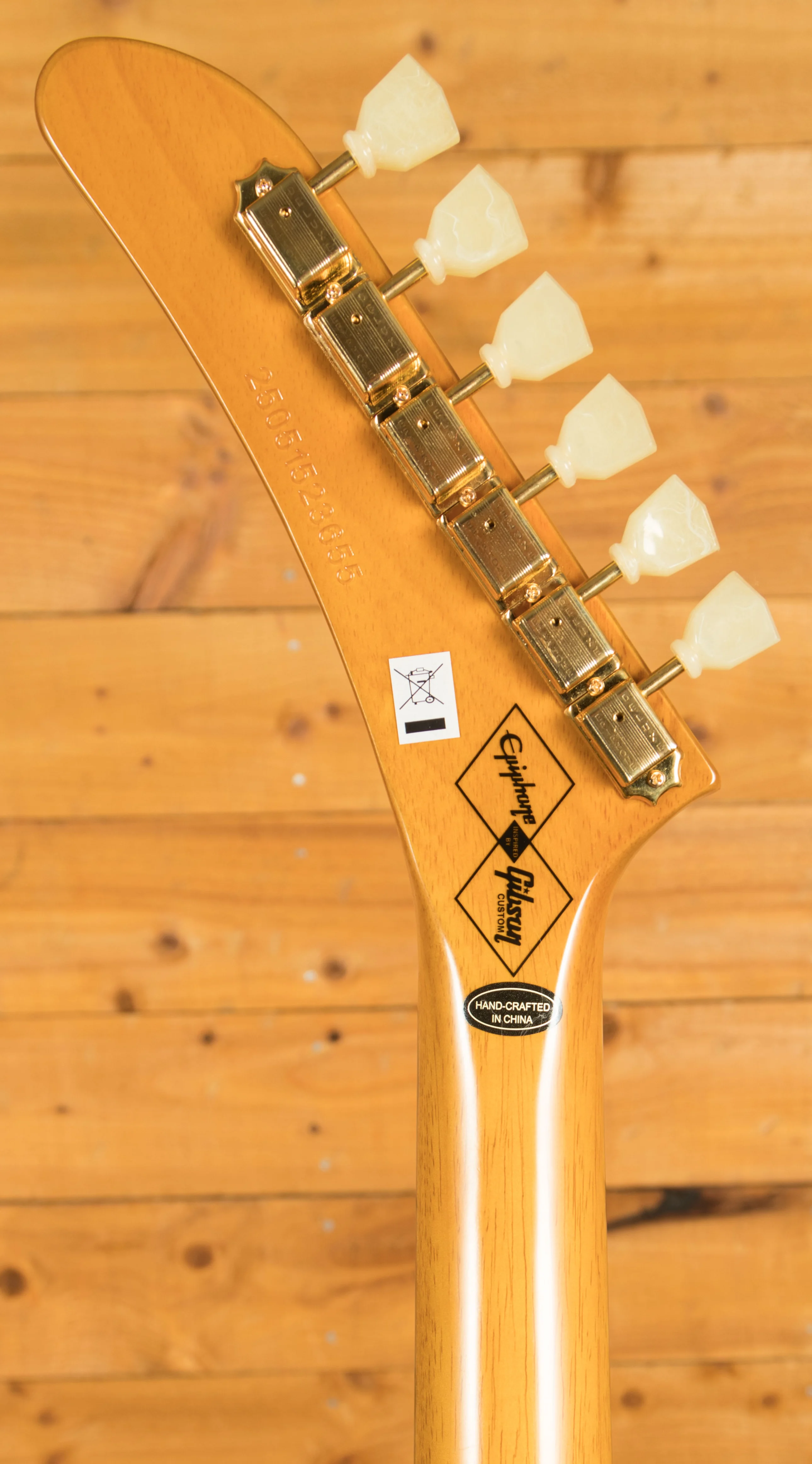 Emblazoned on the back of the headstock, an Epiphone x Gibson Custom logo proudly signifies the collaboration between two iconic brands, assuring you of the instrument's exceptional quality and authenticity. To safeguard your cherished investment, an included hardshell case offers superior protection during transportation and storage, ensuring your Epiphone 1958 Korina Explorer remains pristine and ready for every musical endeavour.