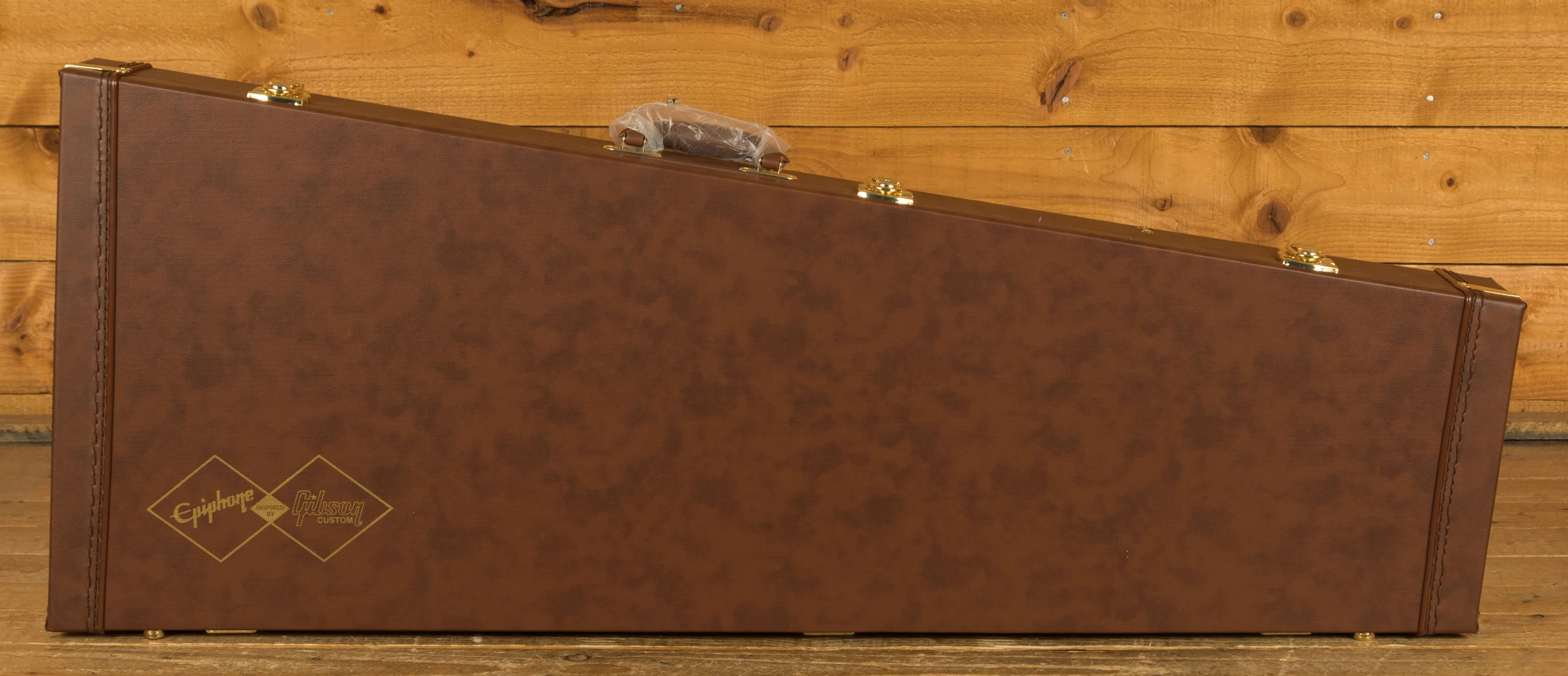 Proudly displaying the Epiphone x Gibson Custom logo on the back of the headstock, this exquisite instrument bears the mark of a true collaboration between two giants of the guitar world. It stands as a testament to Epiphone's commitment to delivering exceptional craftsmanship and unmatched quality. To ensure its safekeeping, a hardshell case is thoughtfully included, providing optimal protection for your prized possession during travel or storage.