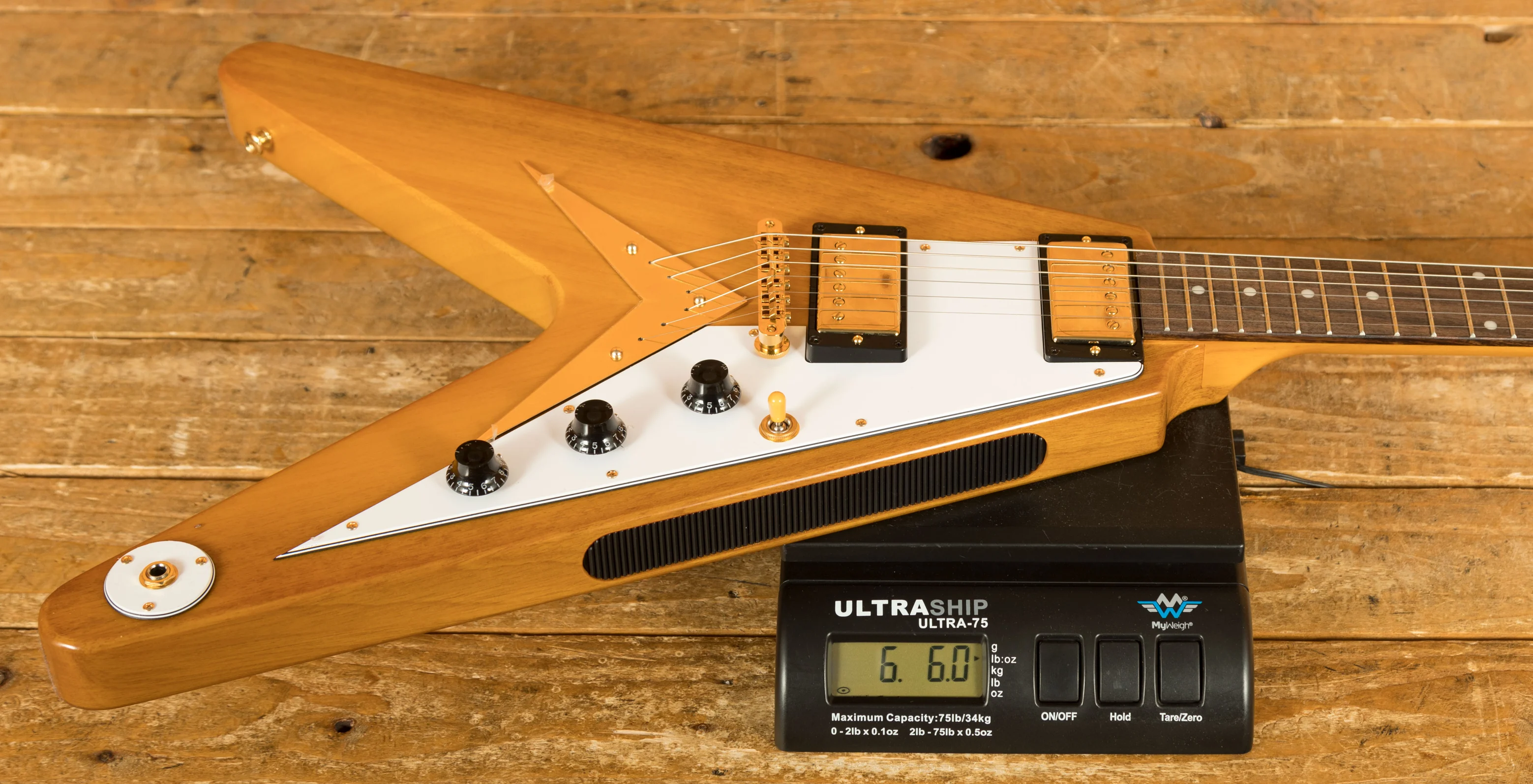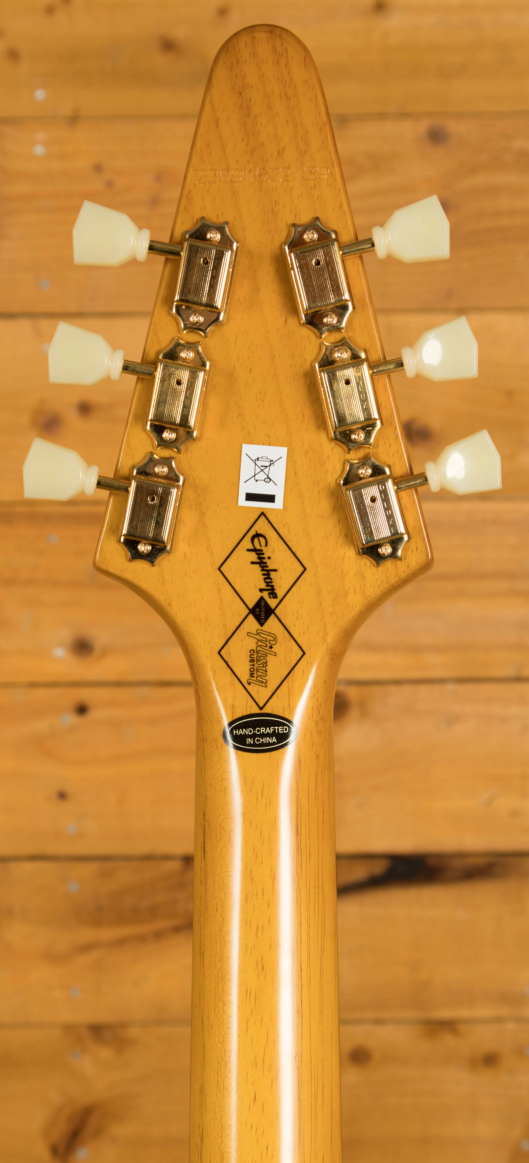 Introducing the Epiphone 1958 Flying V, a marvel of craftsmanship and musical history brought to life in collaboration with the renowned Gibson Custom Shop. This extraordinary instrument stands as an impeccable recreation of one of the most revered and sought-after vintage guitars ever made. Prepare to be captivated by its mesmerising beauty, unparalleled playability, and a tonal palette that will elevate your musical expression to new heights.