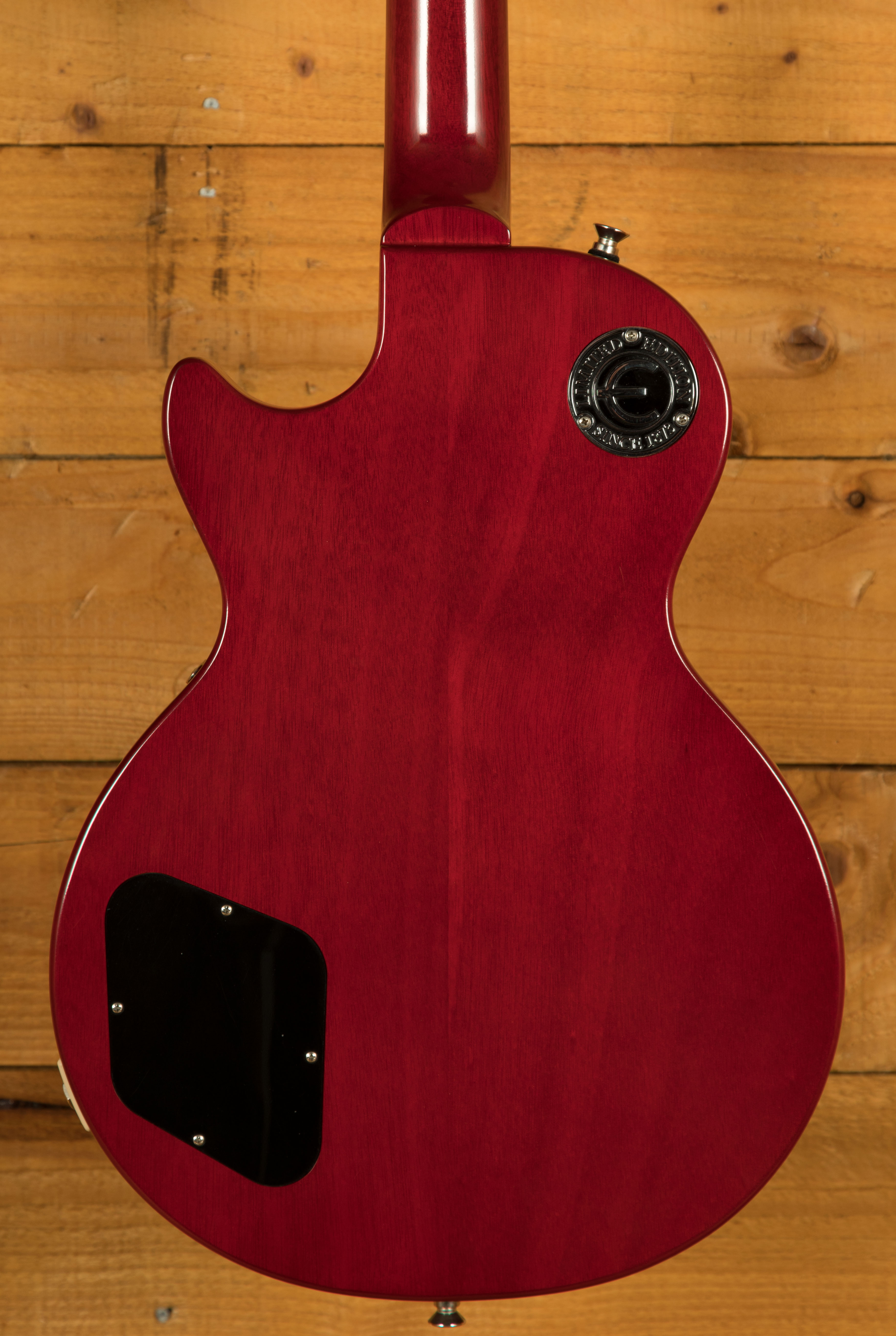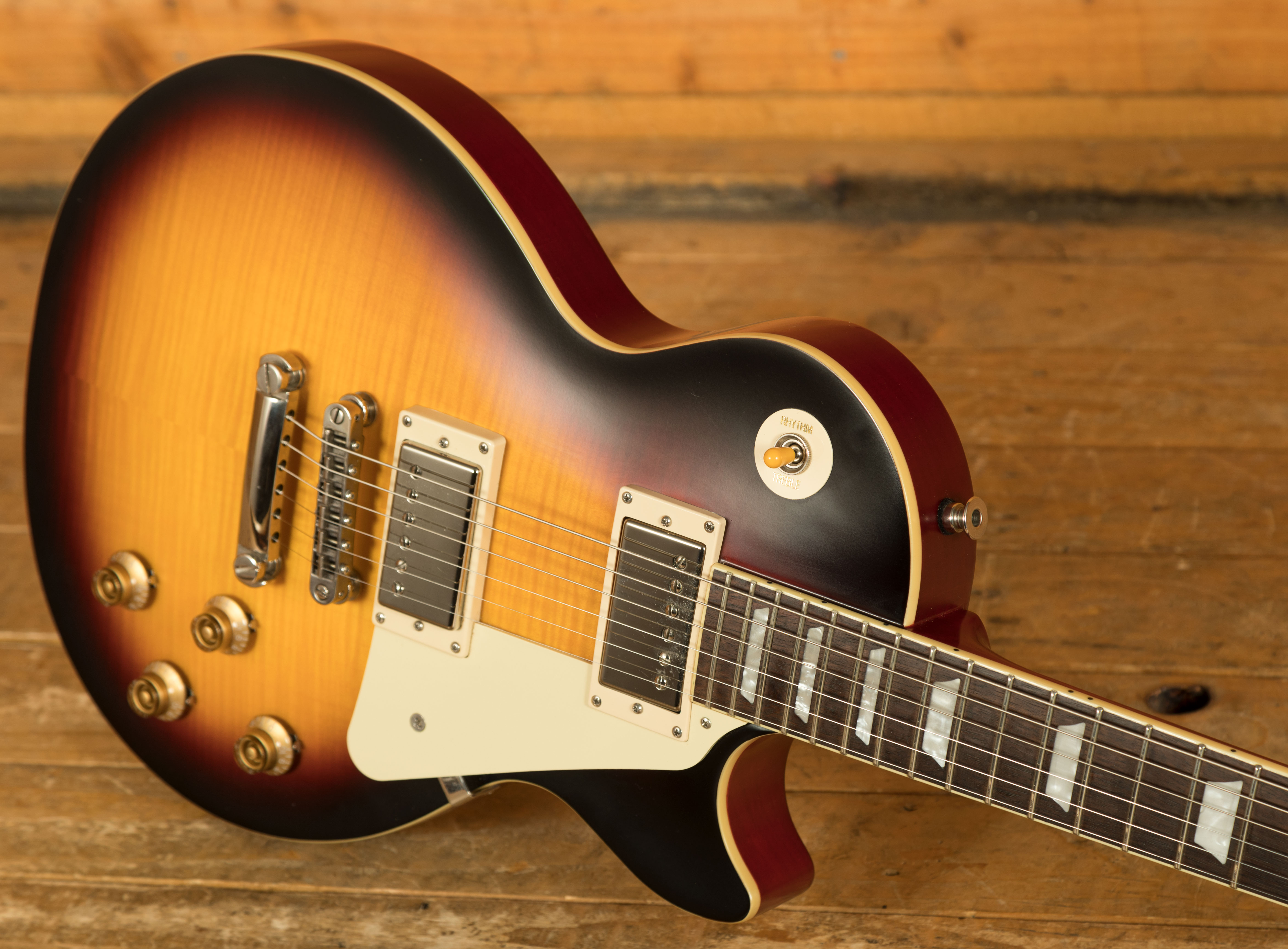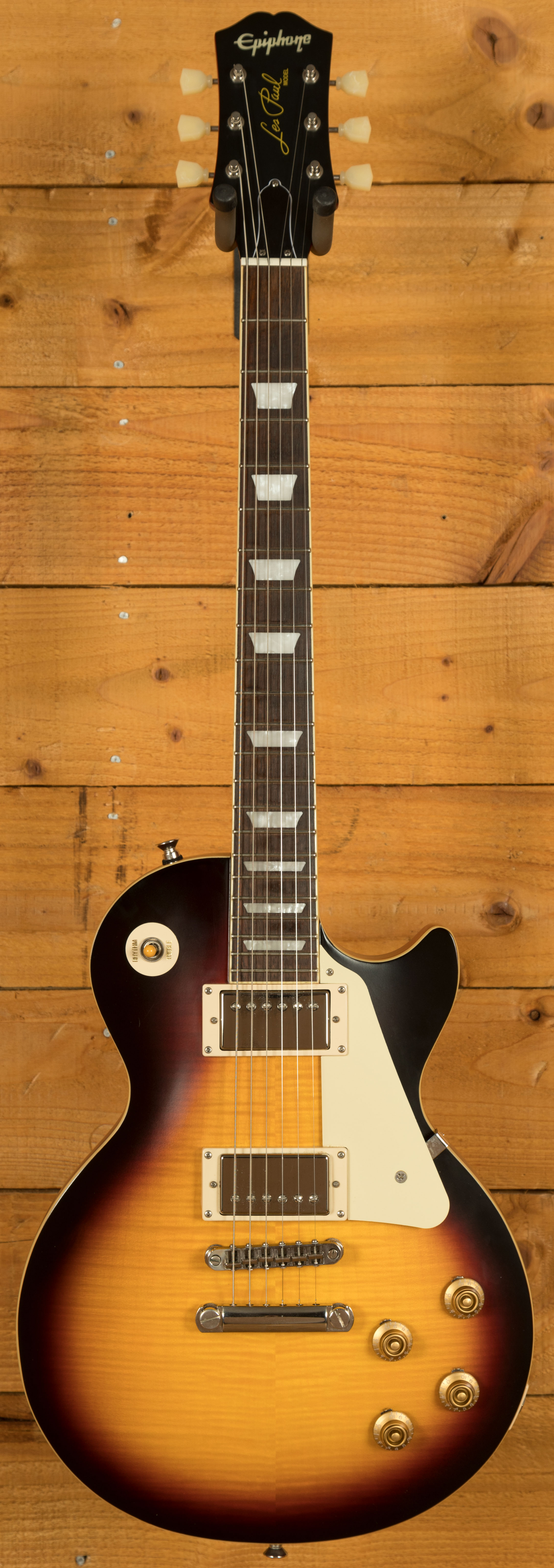 The Epiphone 1959 Les Paul Standard comes equipped with Gibson USA BurstBucker 2 and 3 humbuckers, known for their vintage-accurate tone and dynamic range. These pickups capture the essence of classic PAF humbuckers, providing clear, powerful output suited to both clean and overdriven tones. Supporting components such as CTS pots, 50s-style wiring, Mallory capacitors, and Switchcraft electronics ensure reliable performance and precise tonal control. Each guitar includes a vintage-style brown hard case for protection and an exclusive Epiphone Limited Edition medallion toggle switchplate, highlighting its premium status within the Epiphone lineup.
