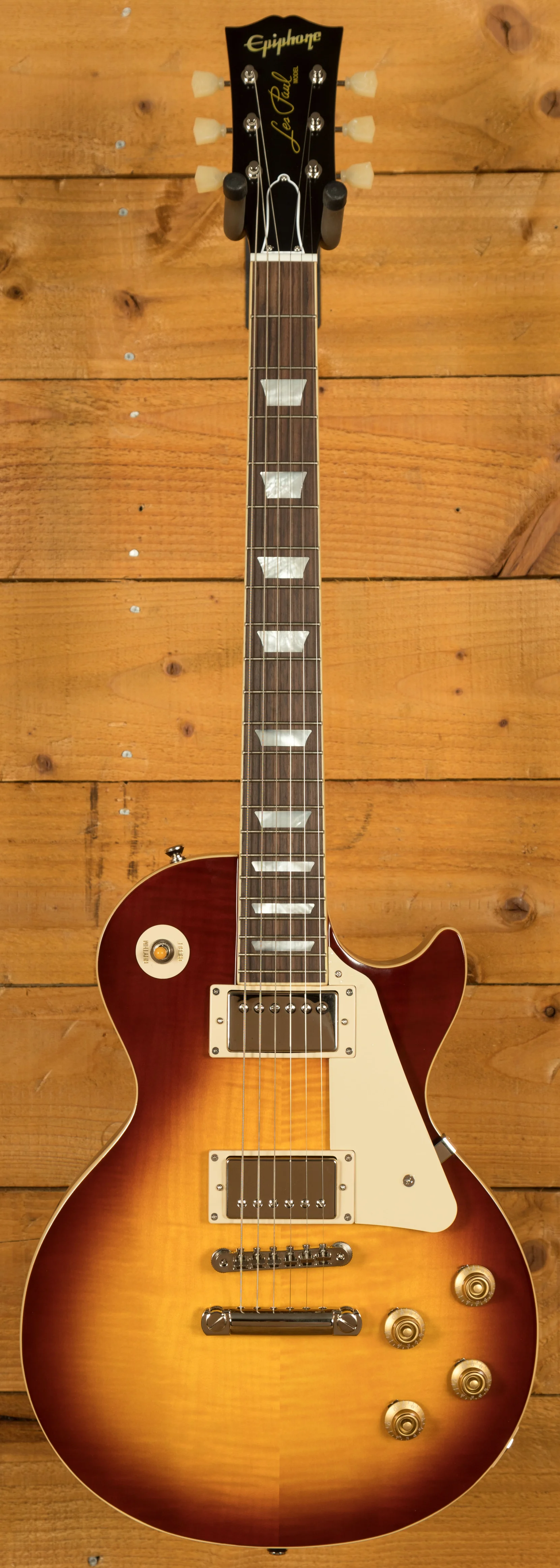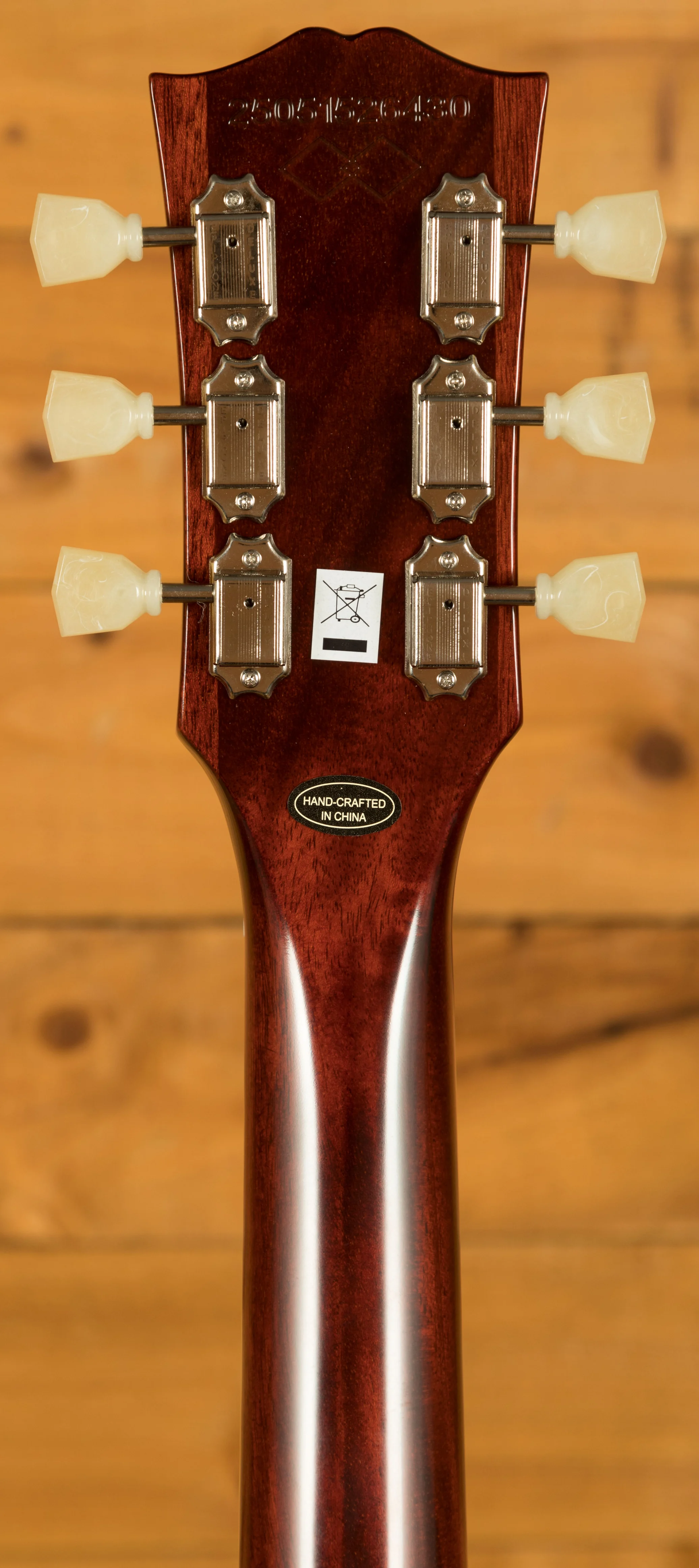 Additional features include an ABR-1 Tune-O-Matic bridge and historical aluminium tailpiece for enhanced tuning stability and sustain, along with nickel-plated Epiphone Deluxe tuners featuring Single Ring Keystone buttons. The guitar comes with a hardshell case that features a brown exterior, pink plush-lined interior, and Inspired by Gibson Custom graphics - offering protection and vintage styling for transport and storage. This model is ideal for players who want classic looks, professional performance, and a connection to the most legendary era of the Les Paul.