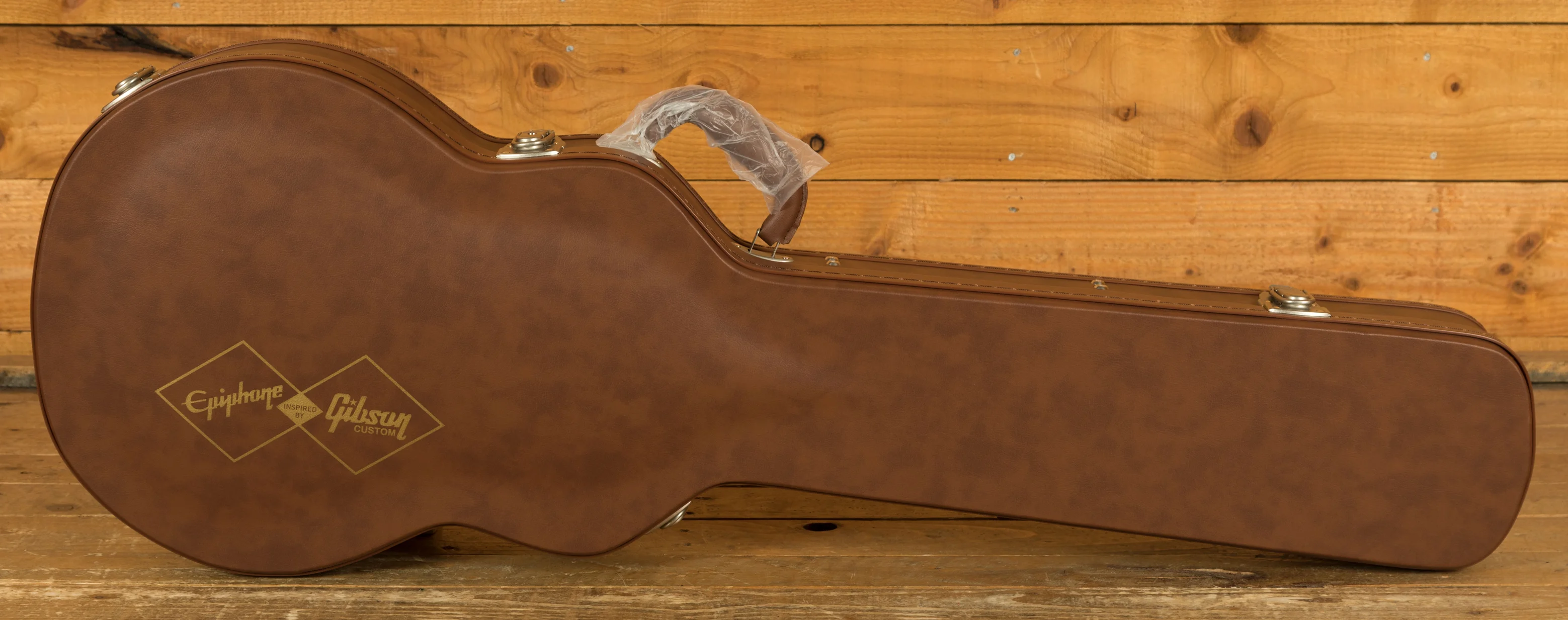 The 1960 Les Paul Special Double Cut Reissue features a Wraparound bridge, Epiphone Deluze Three on a Plate tuners, and comes in a vintage-style case with a brown exterior and pink plush interior, featuring Inspired by Gibson Custom graphics on the outside.