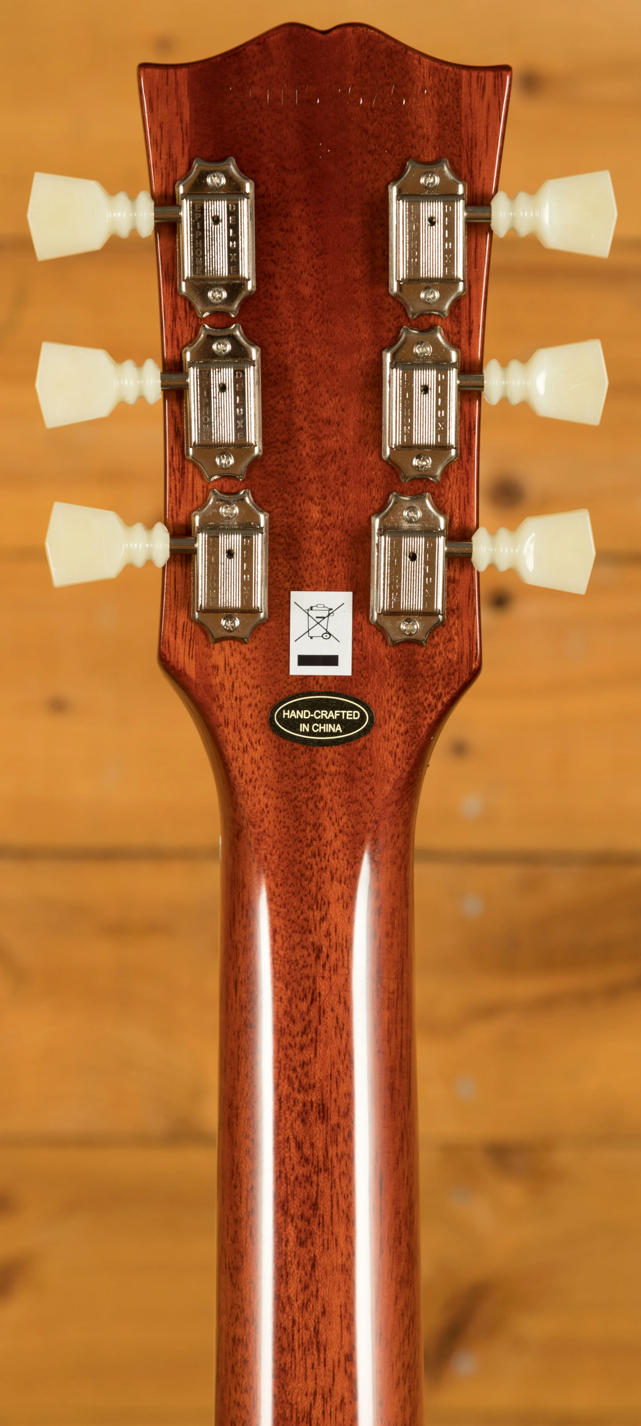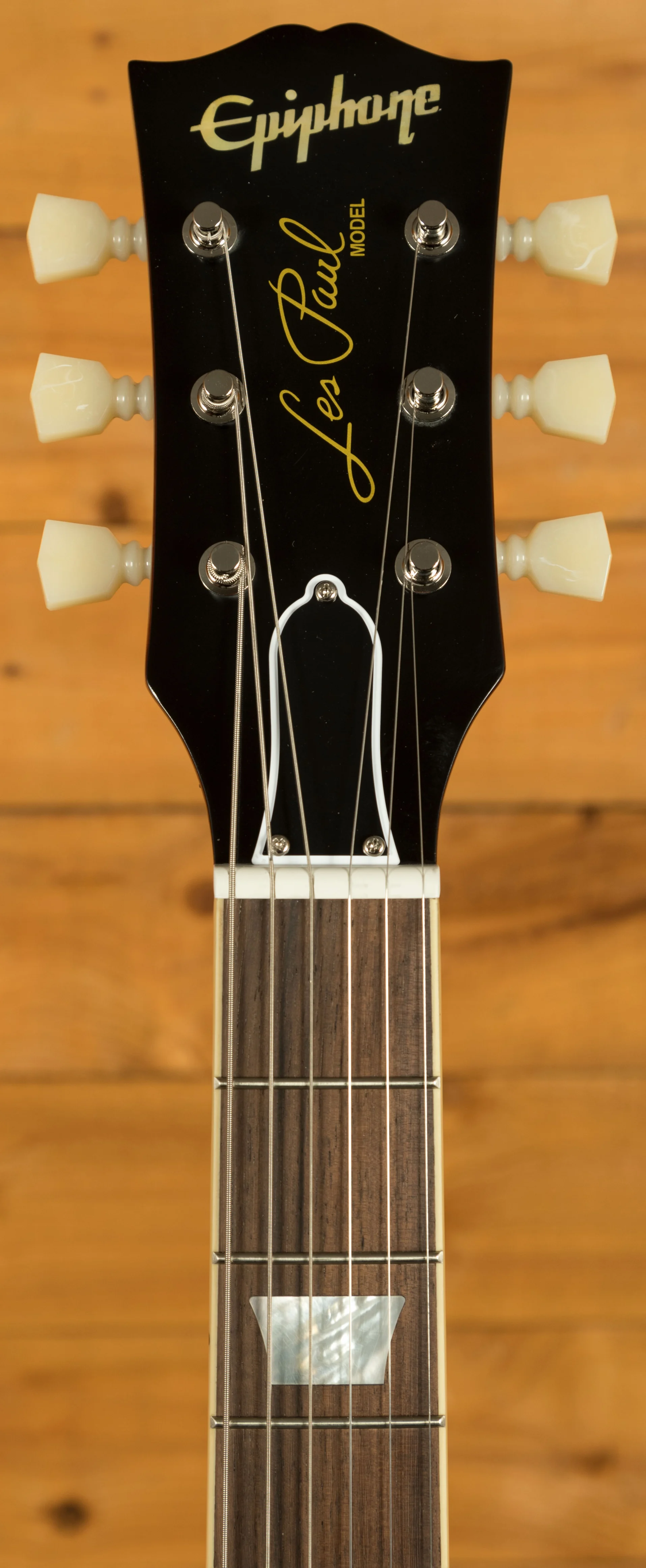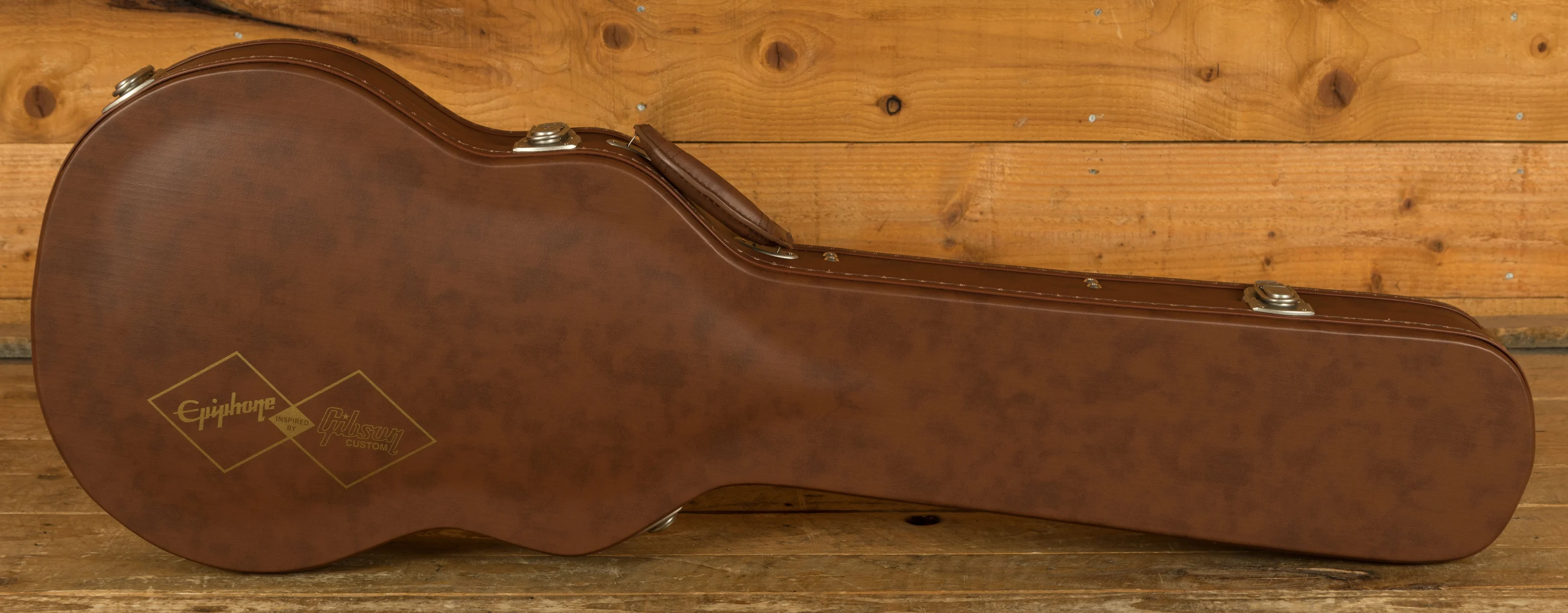 Hardware appointments include an ABR-1 Tune-O-Matic bridge and a lightweight aluminium tailpiece, both finished in nickel for a vintage-correct aesthetic. The Epiphone Deluxe tuners feature single-ring Keystone buttons, offering precise tuning and period-correct styling. The guitar comes in a Vintage Gloss finish, which provides a lightly aged look without excessive wear, and it is supplied with a brown Epiphone hardshell case lined in pink plush, complete with "Inspired by Gibson Custom" graphics.