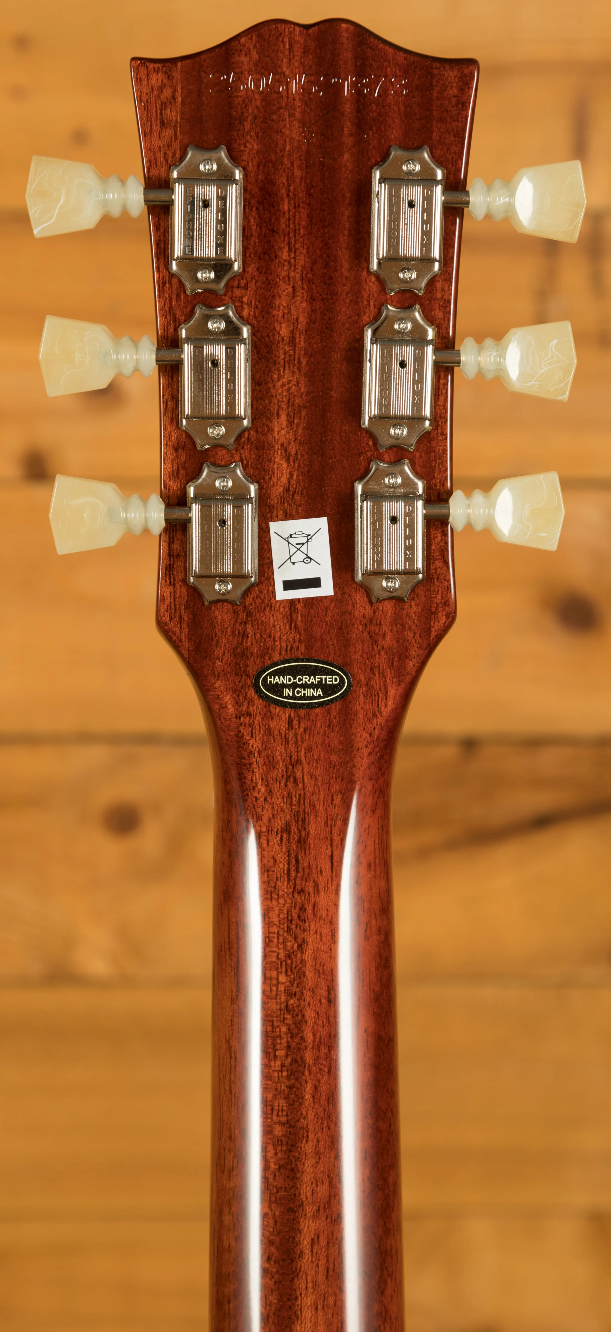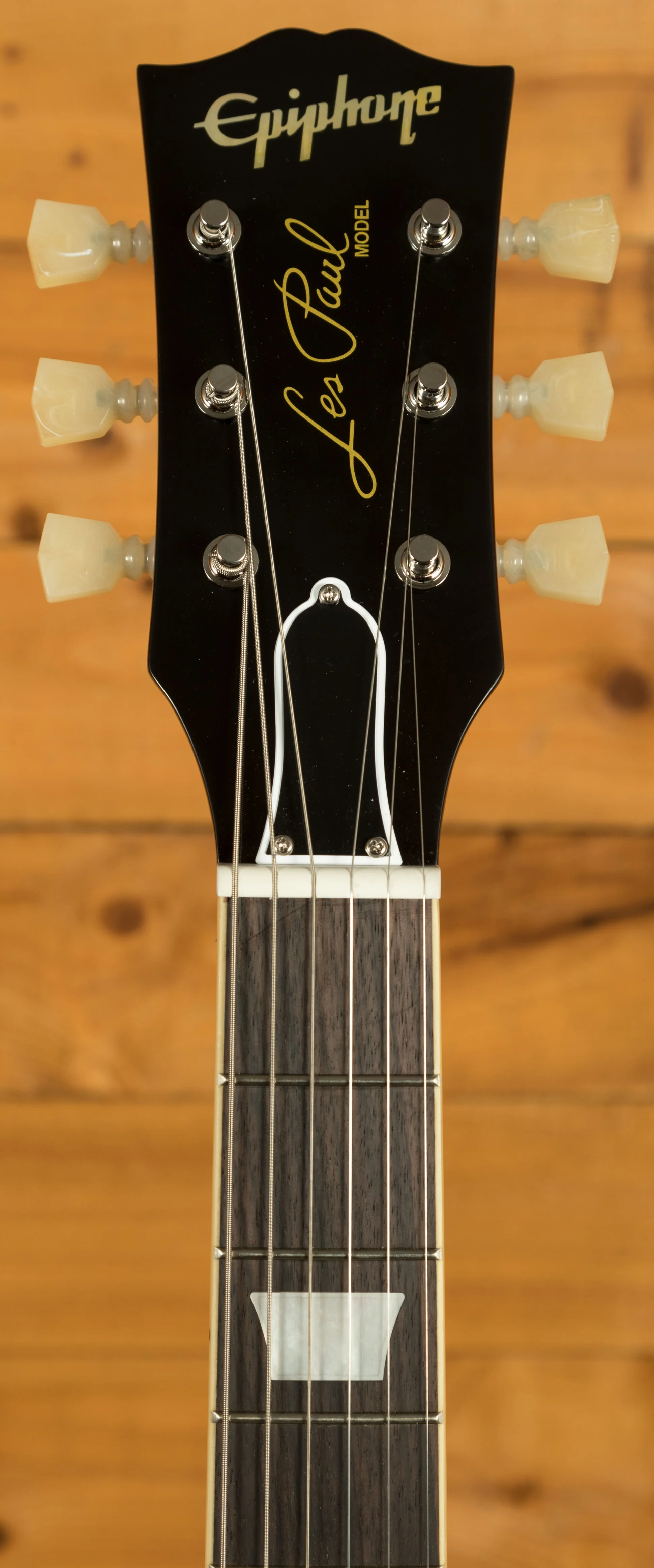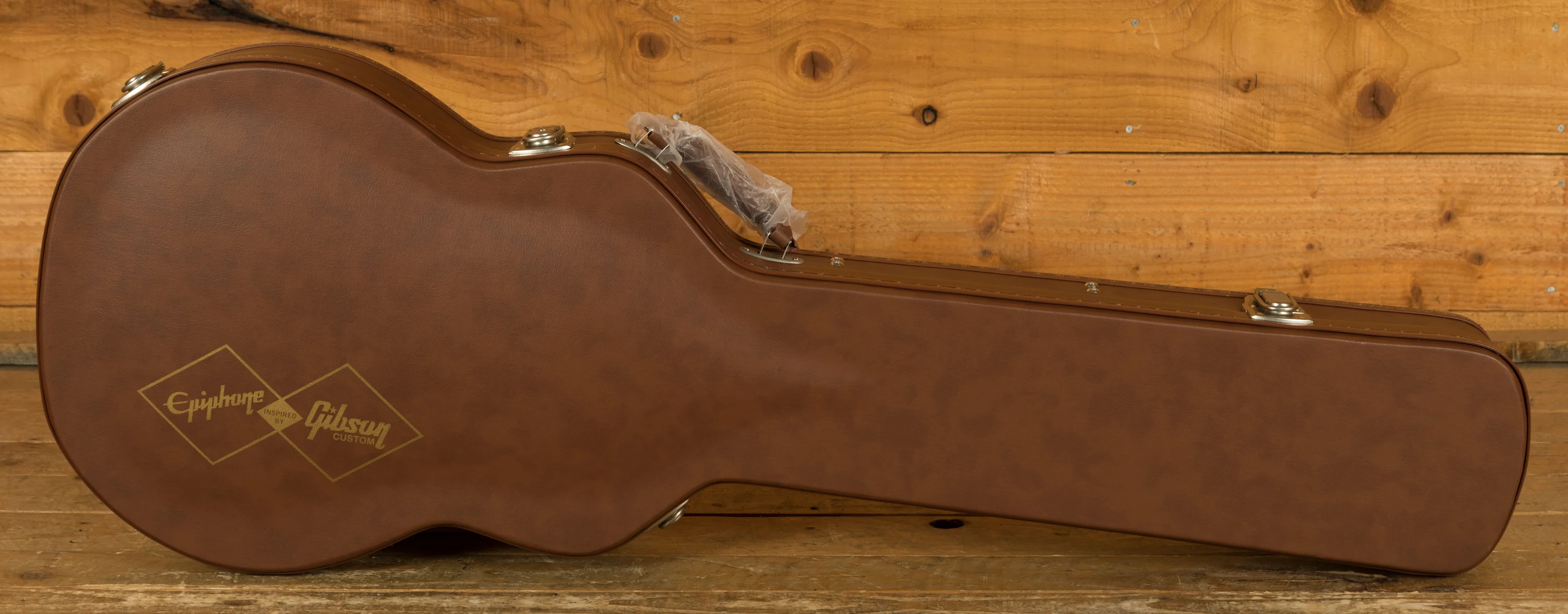 Hardware appointments include an ABR-1 Tune-O-Matic bridge and a lightweight aluminium tailpiece, both finished in nickel for a vintage-correct aesthetic. The Epiphone Deluxe tuners feature single-ring Keystone buttons, offering precise tuning and period-correct styling. The guitar comes in a Vintage Gloss finish, which provides a lightly aged look without excessive wear, and it is supplied with a brown Epiphone hardshell case lined in pink plush, complete with "Inspired by Gibson Custom" graphics.