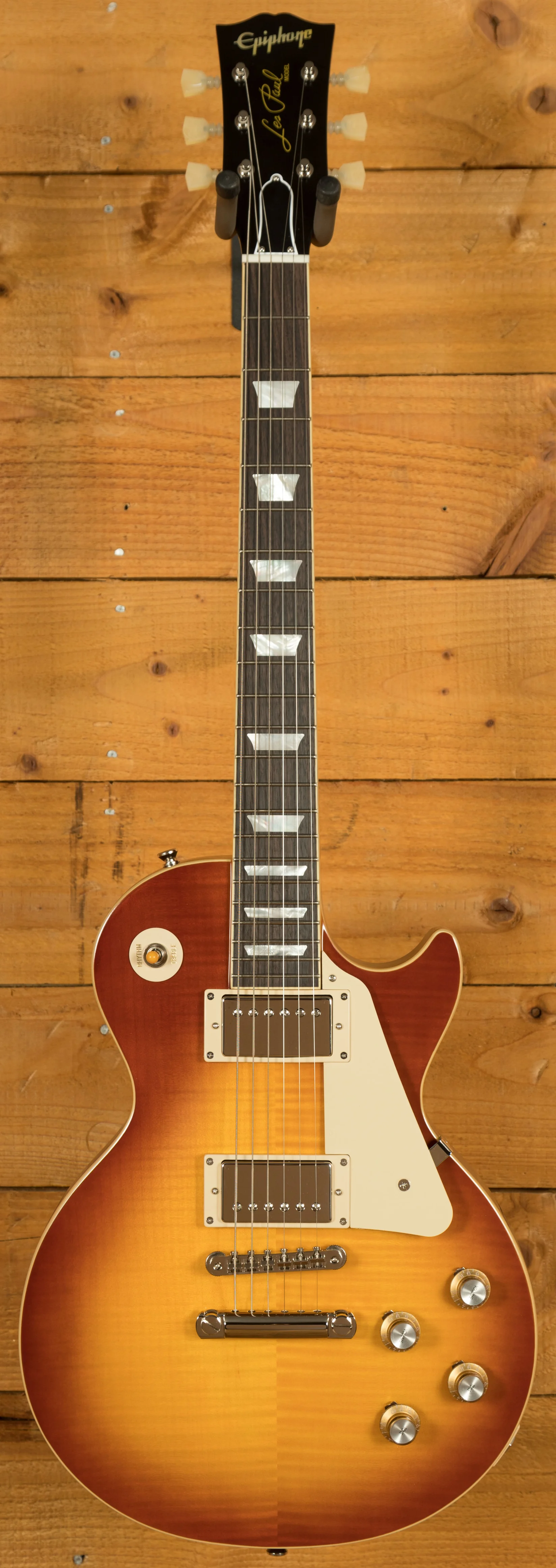 The Epiphone 1960 Les Paul Standard Reissue is a detailed and accurate recreation of one of the most iconic electric guitars in history. Developed in collaboration with Gibson Custom, this model offers the look, feel, and tone of the original 1960 Les Paul Standard at a more accessible price point. It features a solid mahogany body topped with a carved maple cap and AAA flamed maple veneer, delivering the resonant warmth and brightness that define the classic Les Paul tone.