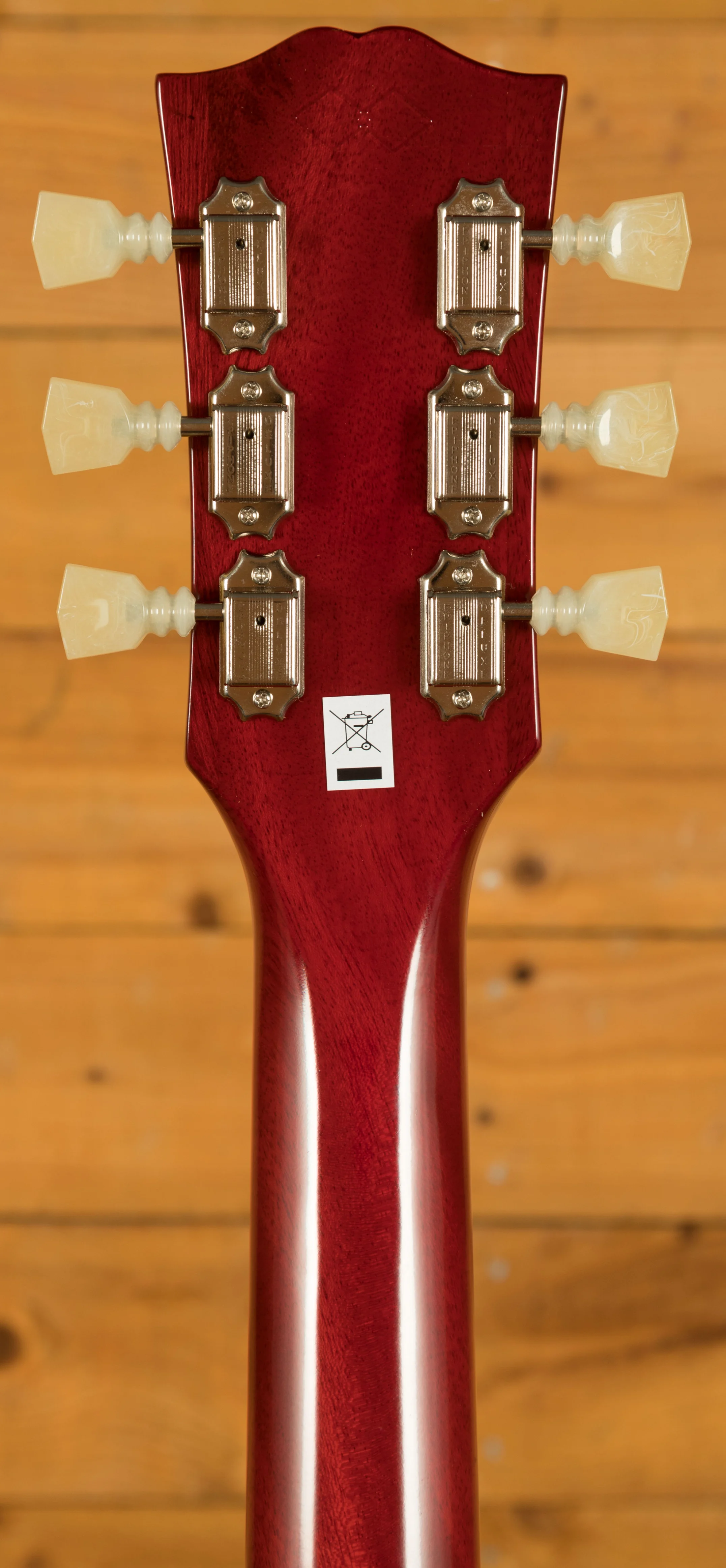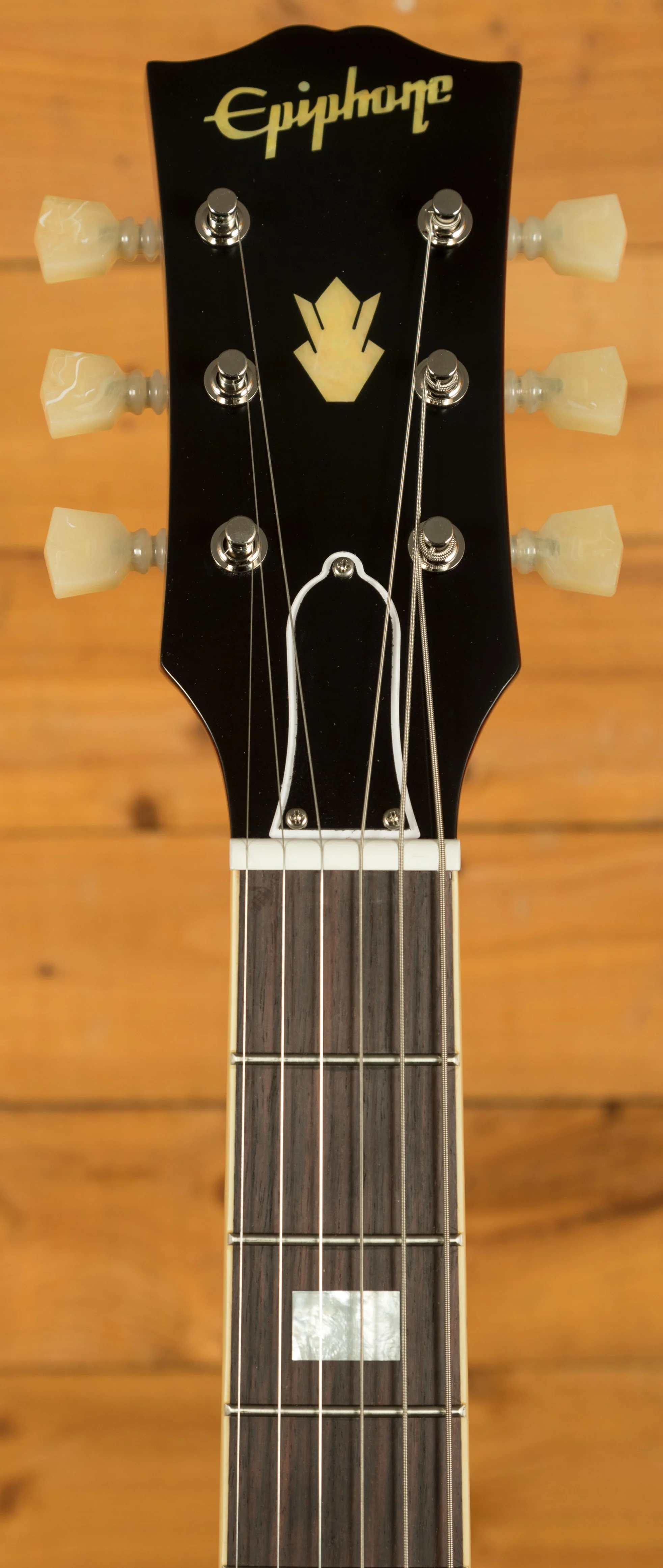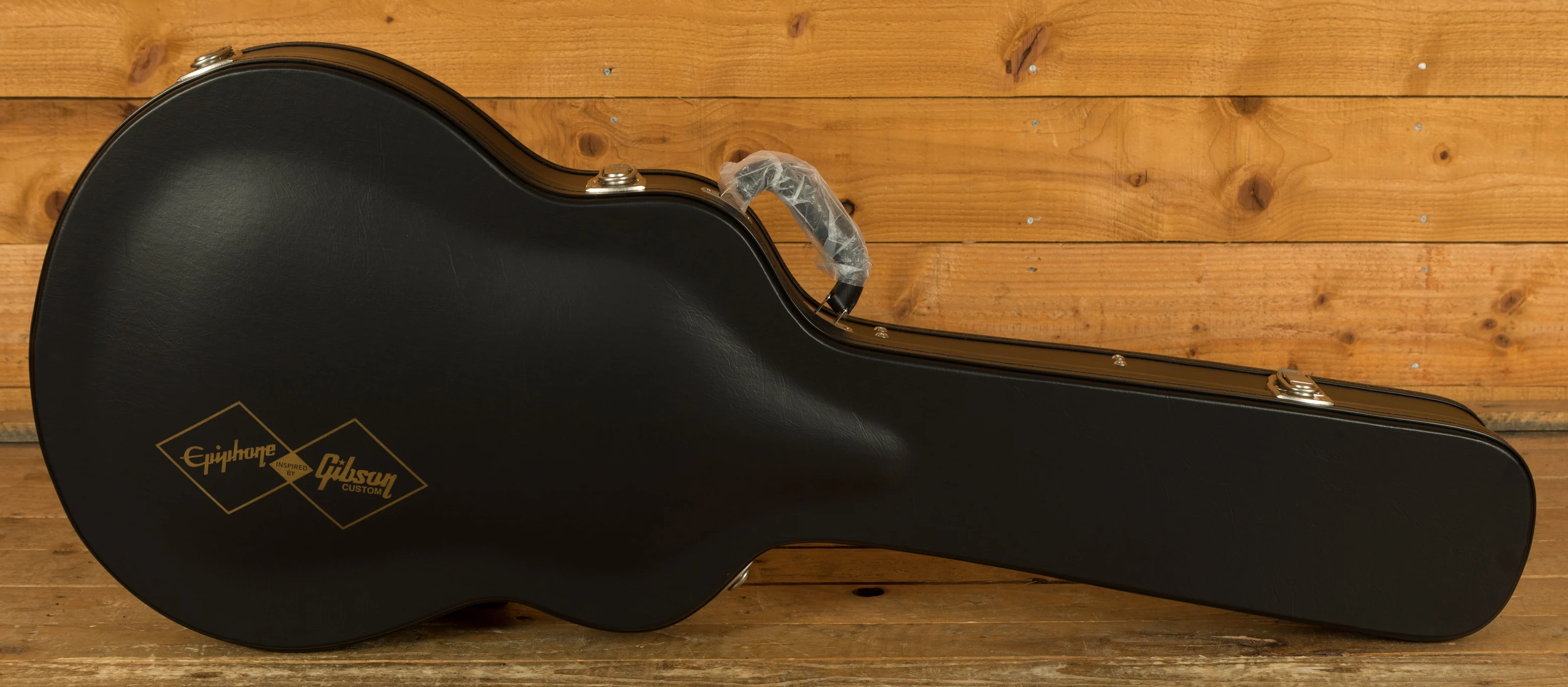 High-quality hardware includes an ABR-1 Tune-O-Matic bridge and a historically inspired aluminium stop bar tailpiece, both of which contribute to the guitar's excellent sustain by anchoring the strings directly to the maple centreblock. Epiphone Deluxe tuners with Double Ring Keystone-style buttons ensure tuning stability and smooth adjustment. A Graph Tech nut enhances tuning consistency and durability. A vintage-style hardshell case with a plush interior and Gibson Custom-inspired graphics is included for secure transport and storage.