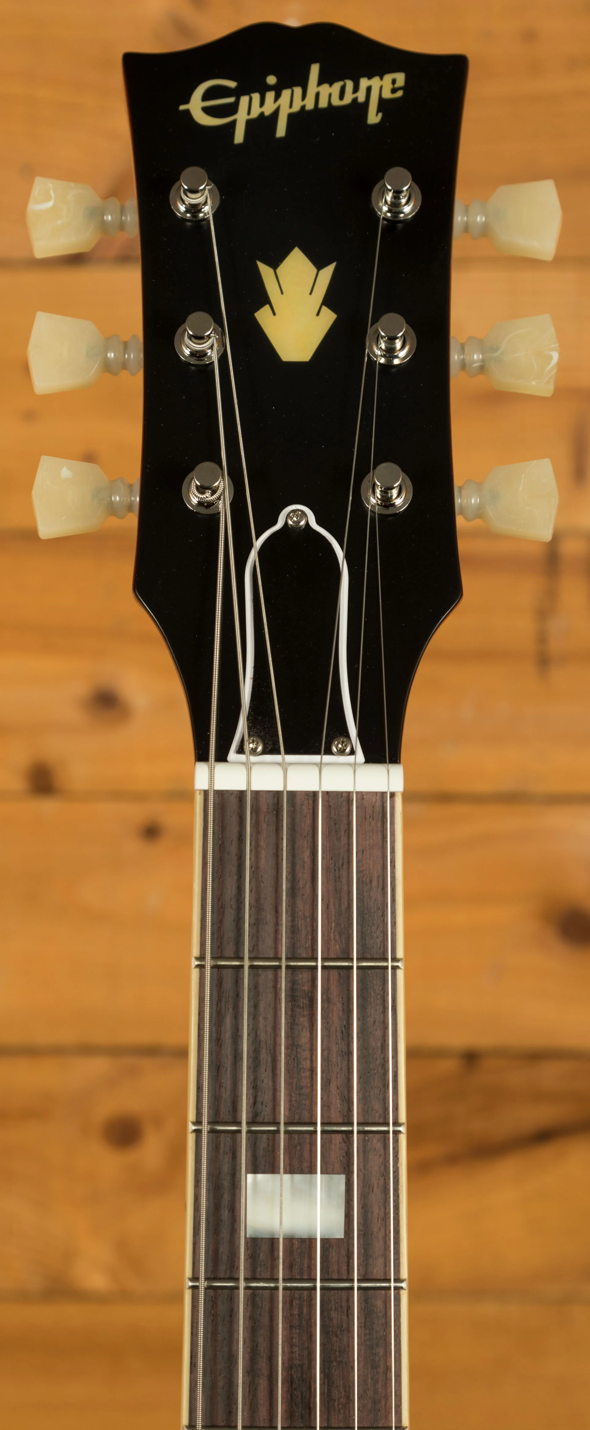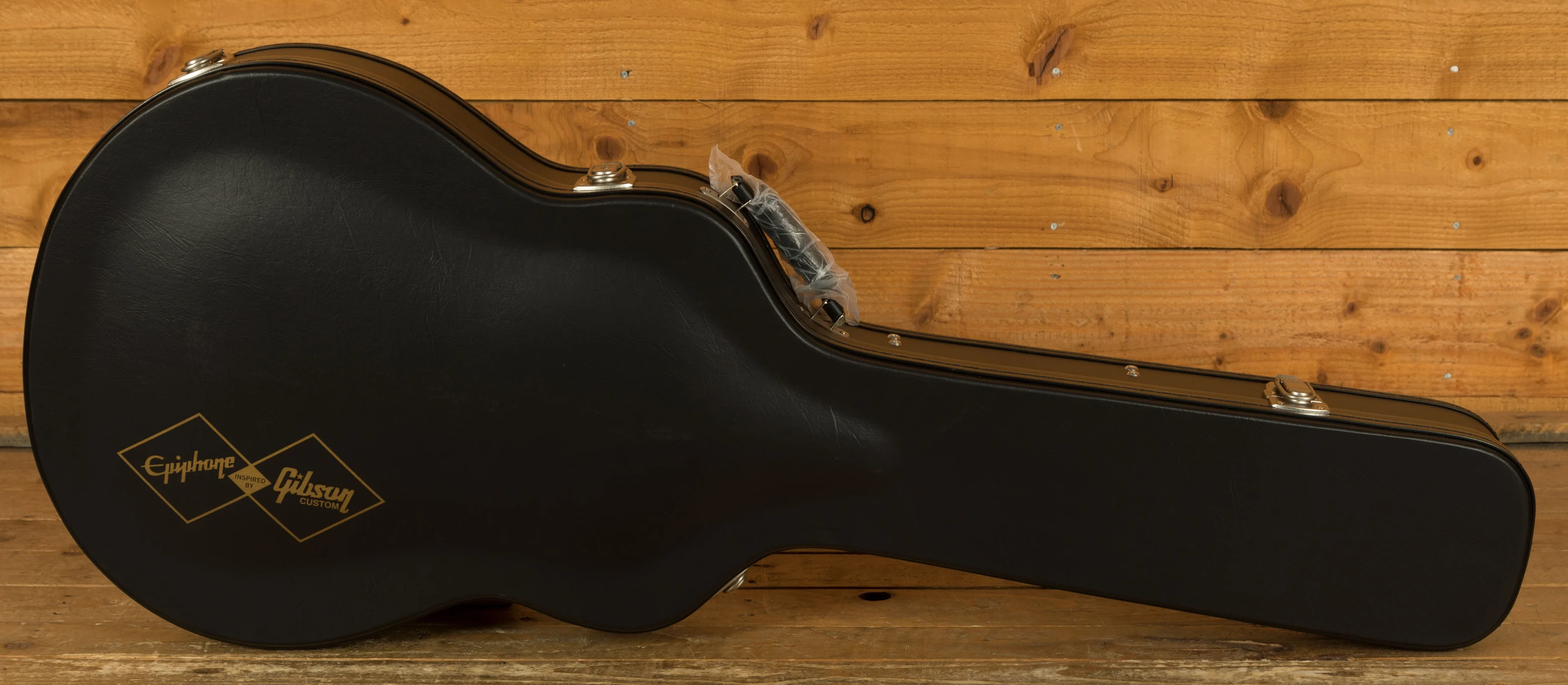 High-quality hardware includes an ABR-1 Tune-O-Matic bridge and a historically inspired aluminium stop bar tailpiece, both of which contribute to the guitar's excellent sustain by anchoring the strings directly to the maple centreblock. Epiphone Deluxe tuners with Double Ring Keystone-style buttons ensure tuning stability and smooth adjustment. A Graph Tech nut enhances tuning consistency and durability. A vintage-style hardshell case with a plush interior and Gibson Custom-inspired graphics is included for secure transport and storage.
