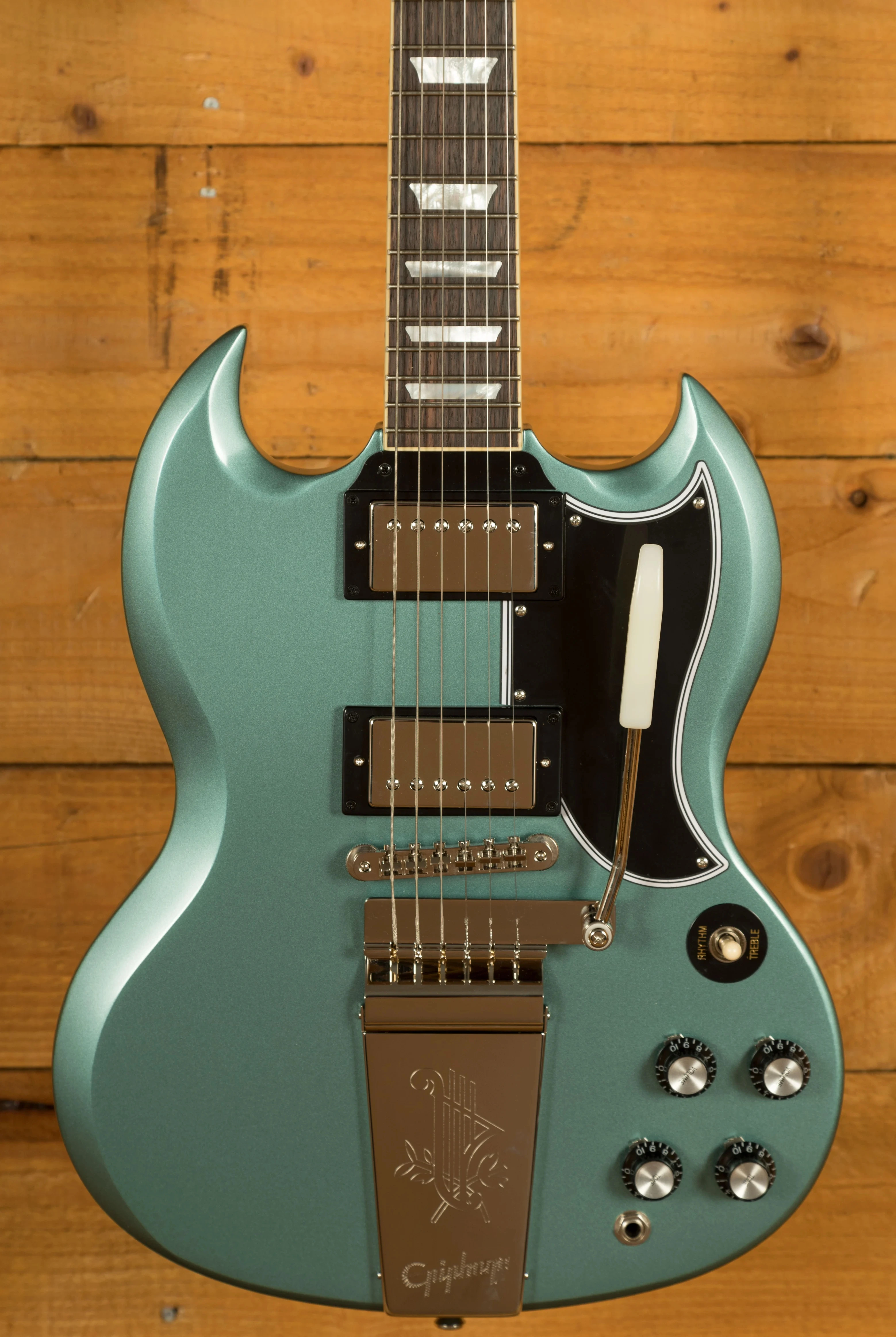 The is crafted from one piece Mahogany and features a 60s SlimTaper neck shape. This neck is super comfortable and feels great in your hands, it feels just like a vintage SG crafted in the 60s would be. The fingerboard is made from a dark piece of Rosewood, which really allows the mother-of-pearl trapezoid inlays to stand out! It also features a 24.75 scale length, 12 radius and a 43mm nut width. As an Inspired By Gibson Custom model, this guitar features a Gibson style headstock, which further increases the vintage appeal.