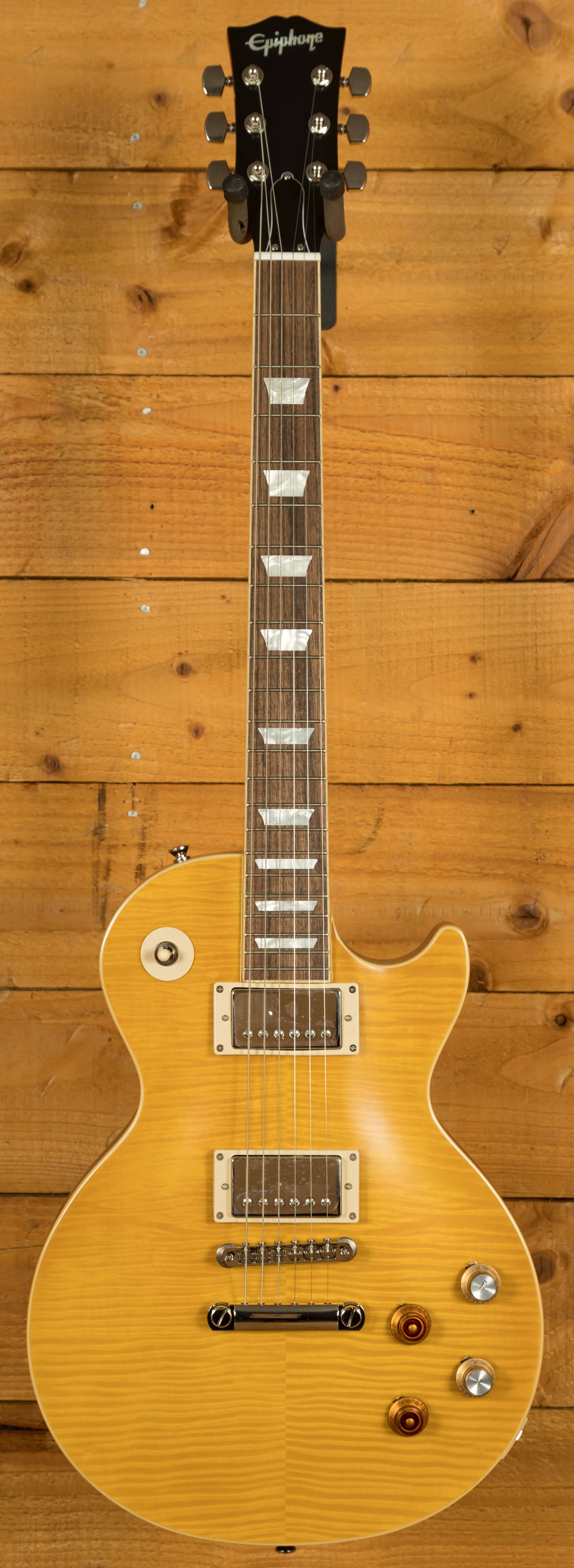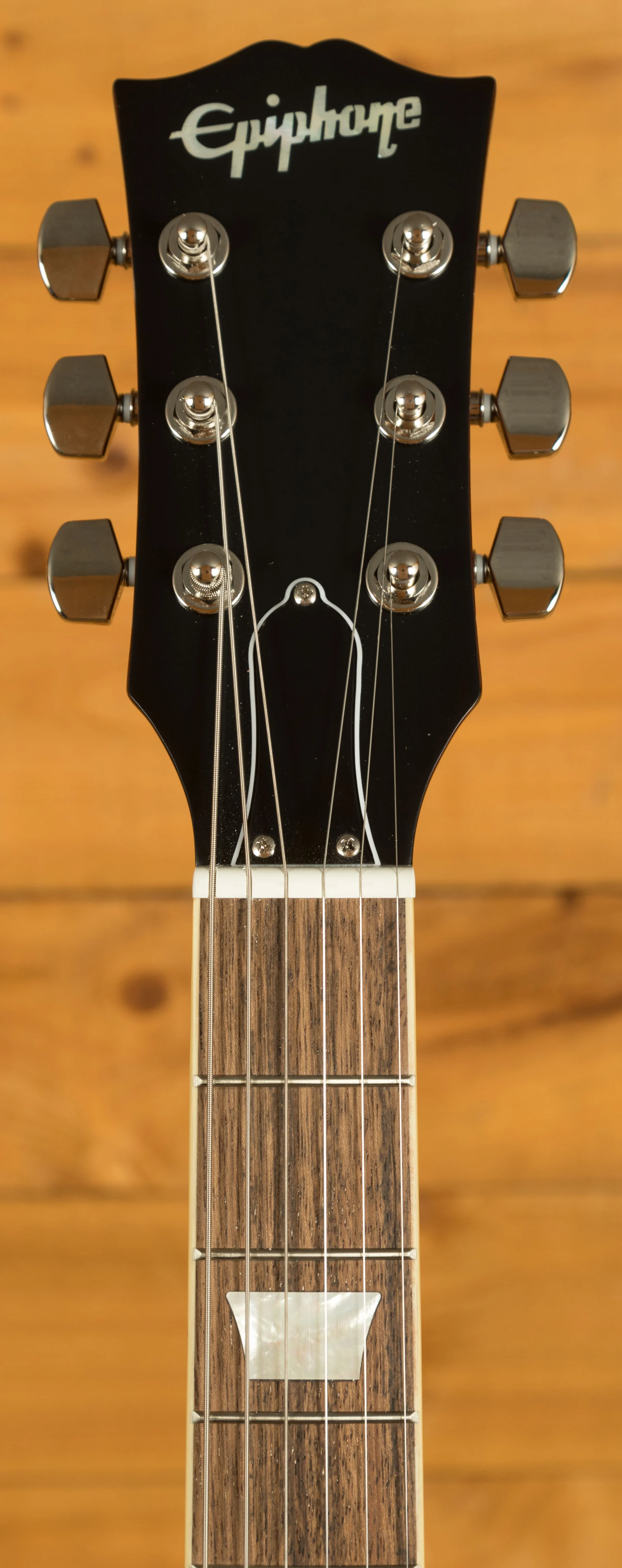 The Mahogany neck is topped with a crisp Indian Laurel fingerboard with classic Gibson Mother of Pearl Trapezoid inlays, this guitar looks every bit the real deal. With a 24.75" scale length and a custom Greeny profile, it retains that classic Les Paul feel. The Epiphone ABR bridge and Stop Bar tailpiece offer an authentic vintage vibe, it even features Grover Rotomatic tuners with kidney buttons. One of the most exciting features of this Epiphone Greeny Les Paul is the inclusion of a genuine Gibson style headstock. It looks super sweet and is a great addition to this guitar.