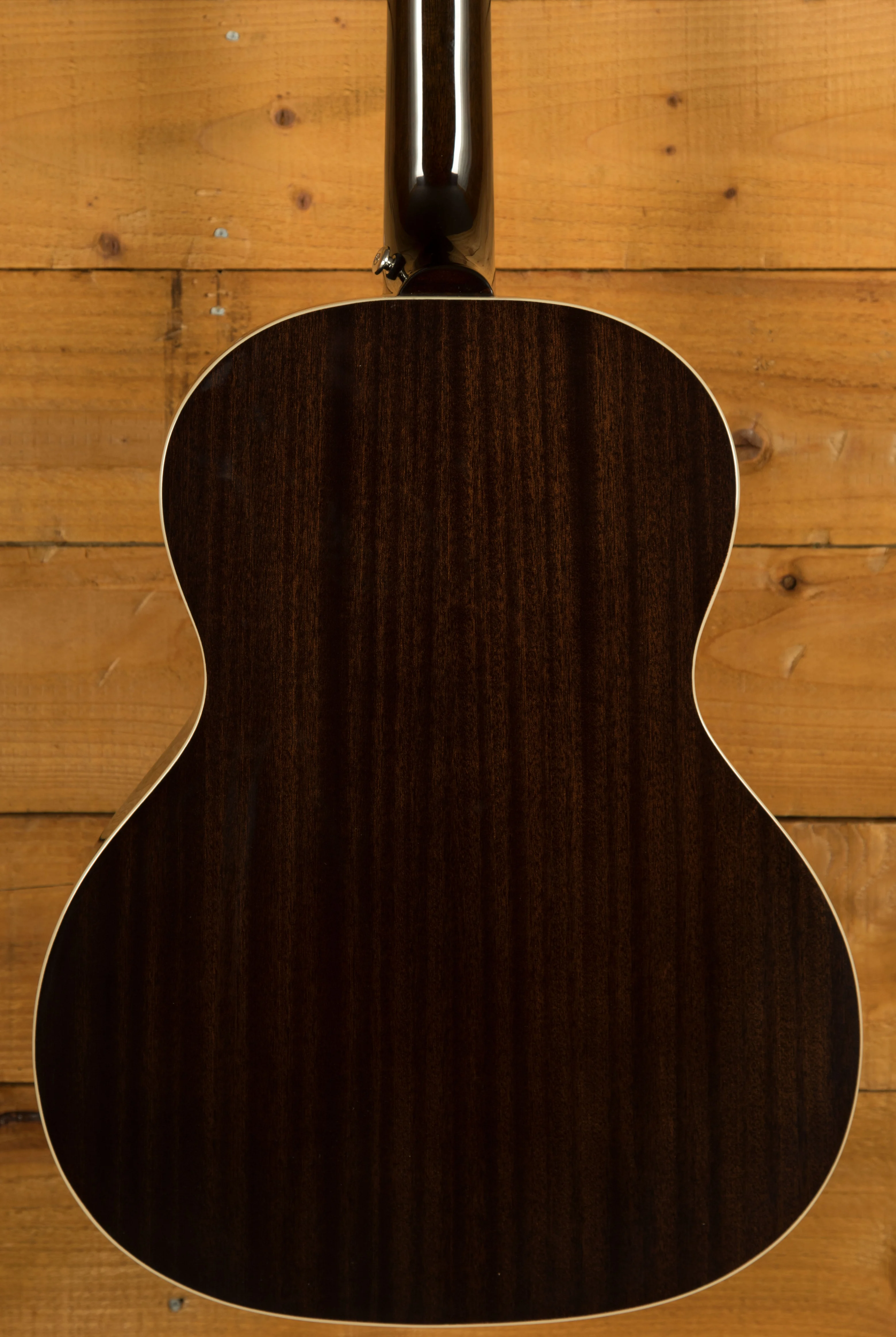 The mahogany neck is attached to the body with a glued in tapered dovetail neck-to-body joint and features a comfortable rounded c neck shape. If you’re a fan of the Gibson L-00 or other parlor style guitars then you’ll feel right at home with this neck. It also features a rosewood fingerboard which features 19 standard frets, a 24.75” scale length, 43mm nut width, and traditional pearloid dot inlays.