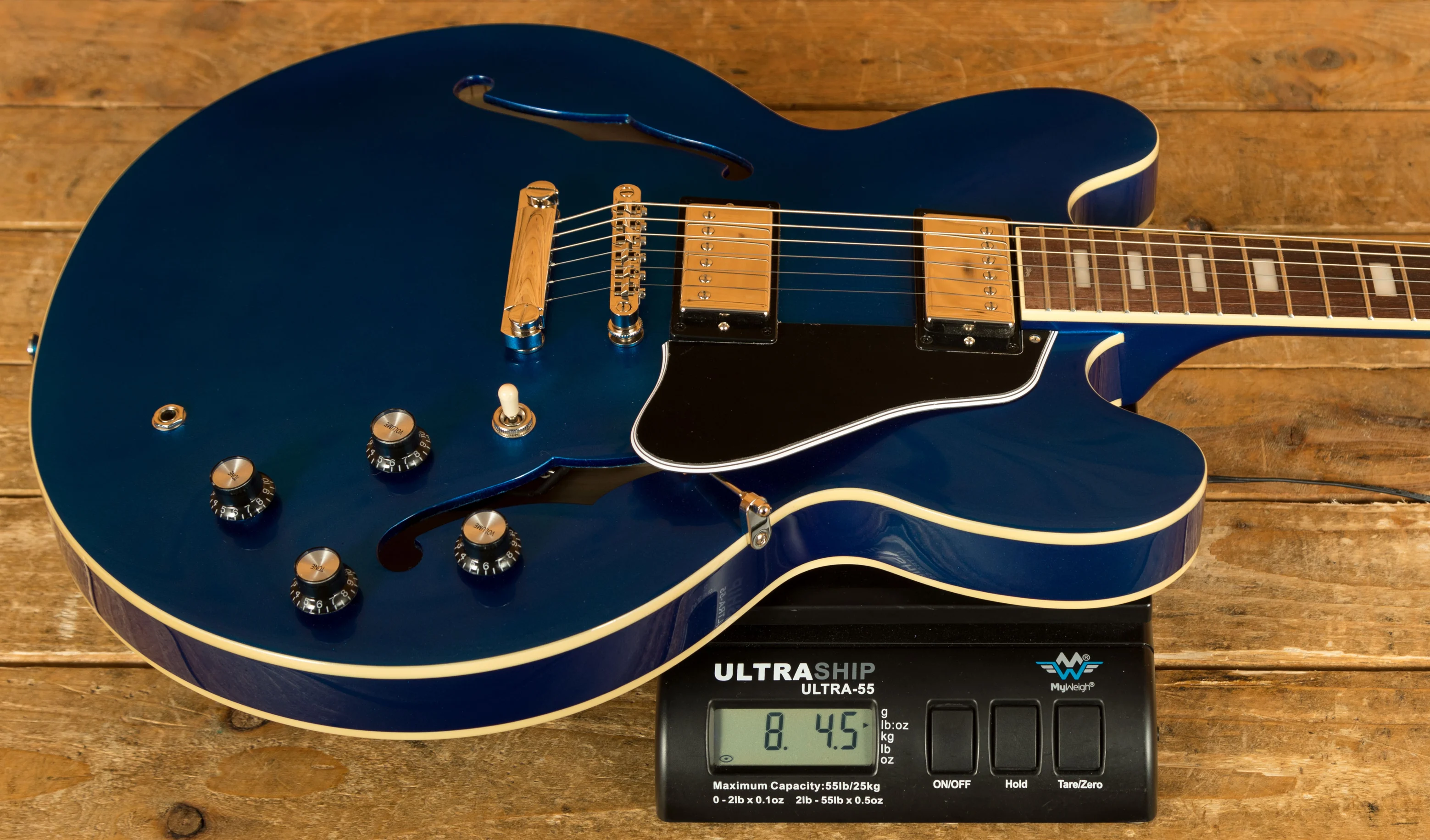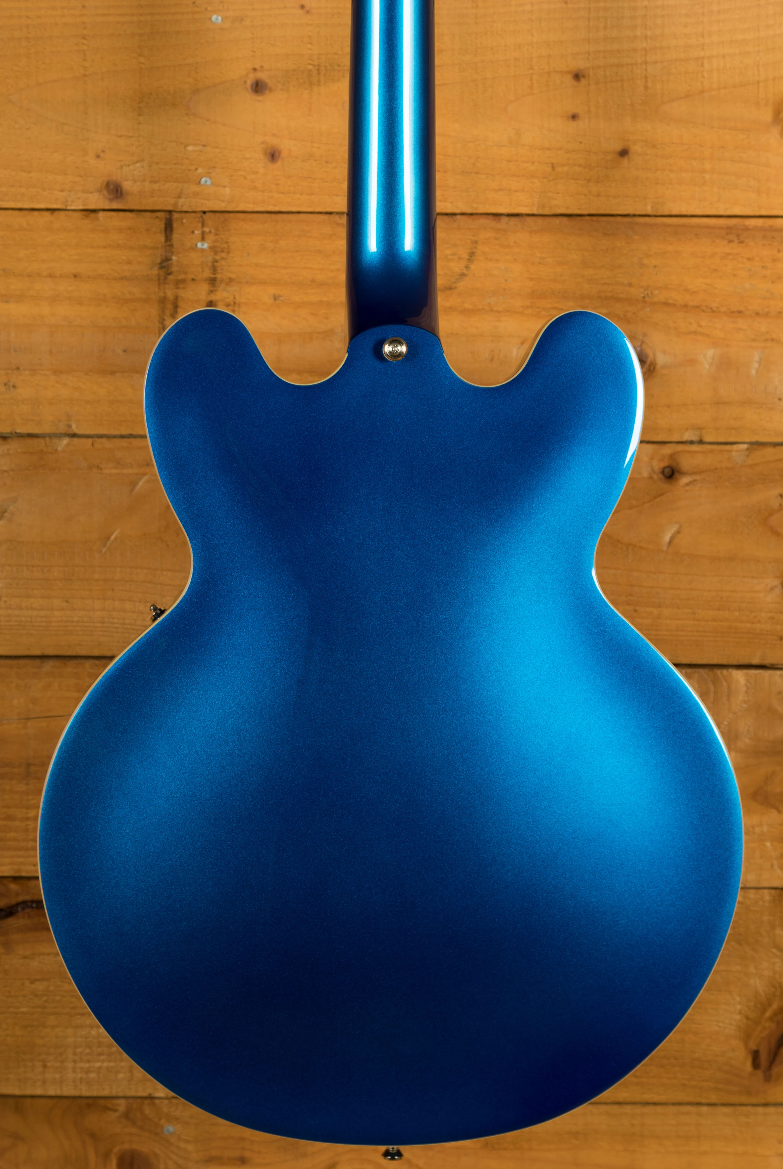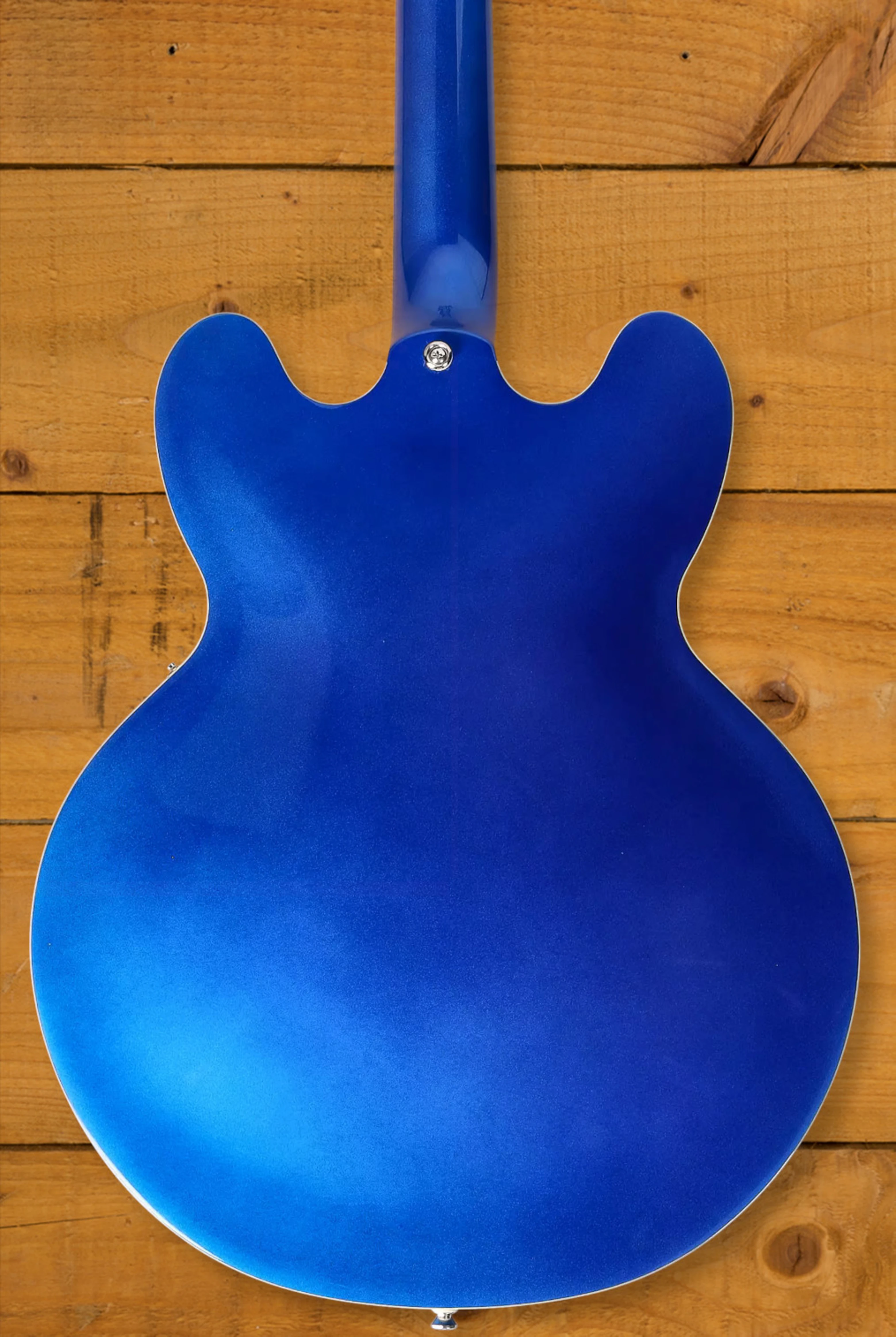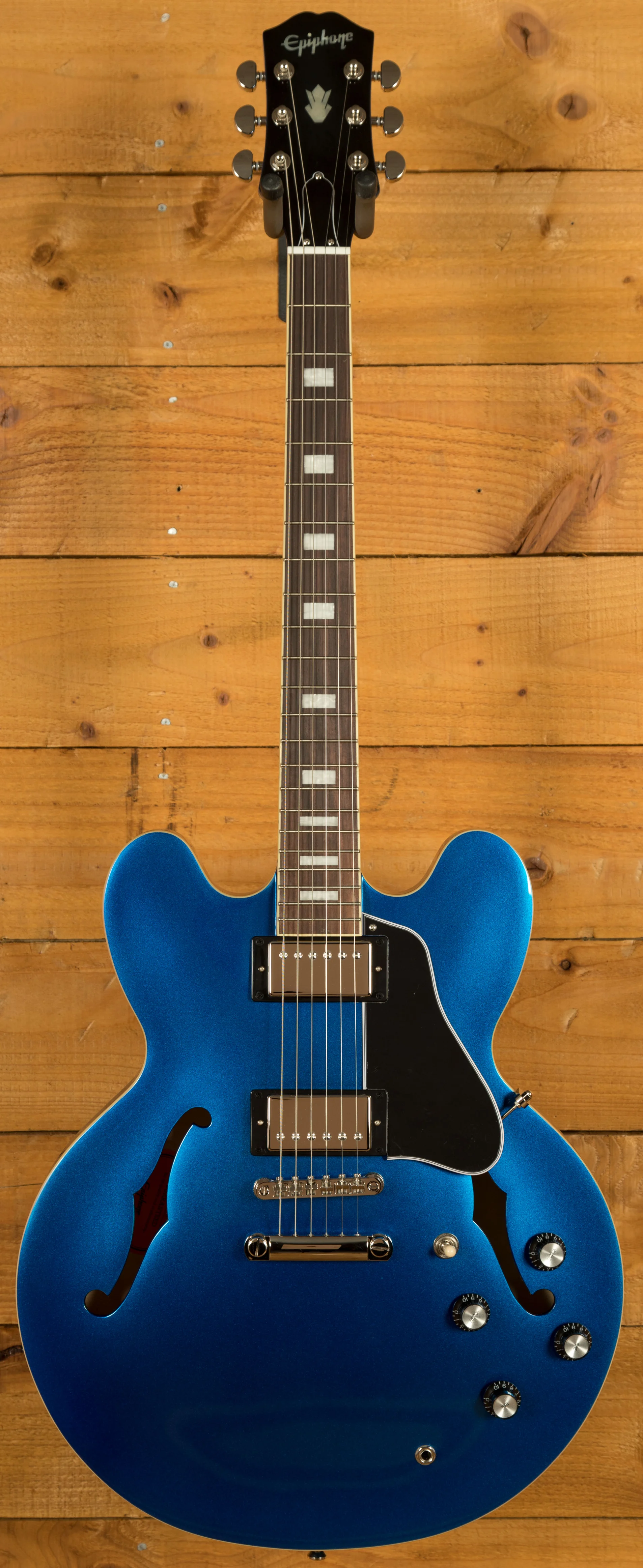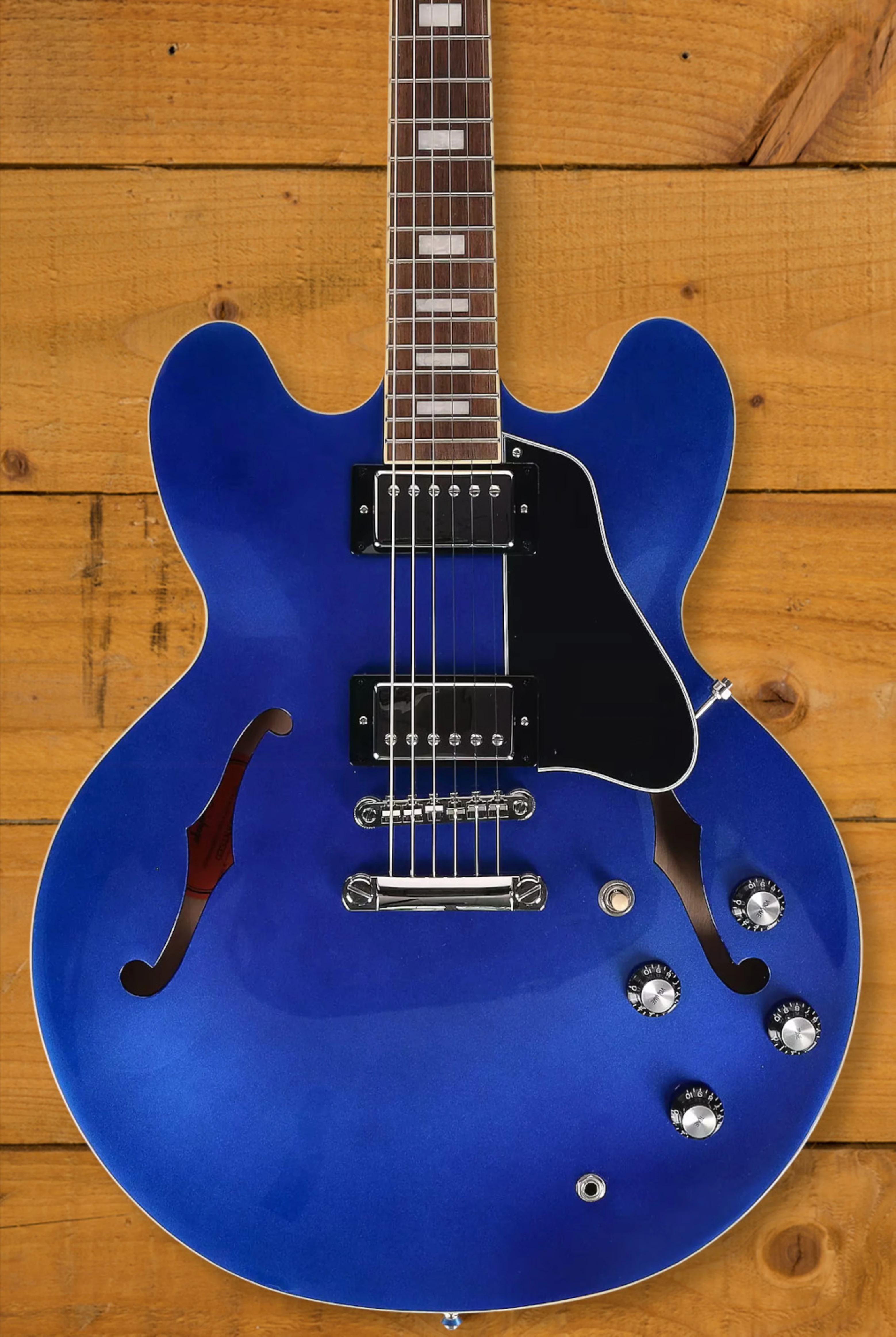 This Epiphone ES-335 features the classic semi-hollow body shape we all know and love. It looks and feels just like its Gibson counterpart. The semi-hollow body is constructed from Layered Maple, and features a super eye-catching Candy Blue finish. This finish has a metallic nature, so when you put it under lights, you'll really see the sparkling shimmer come through.