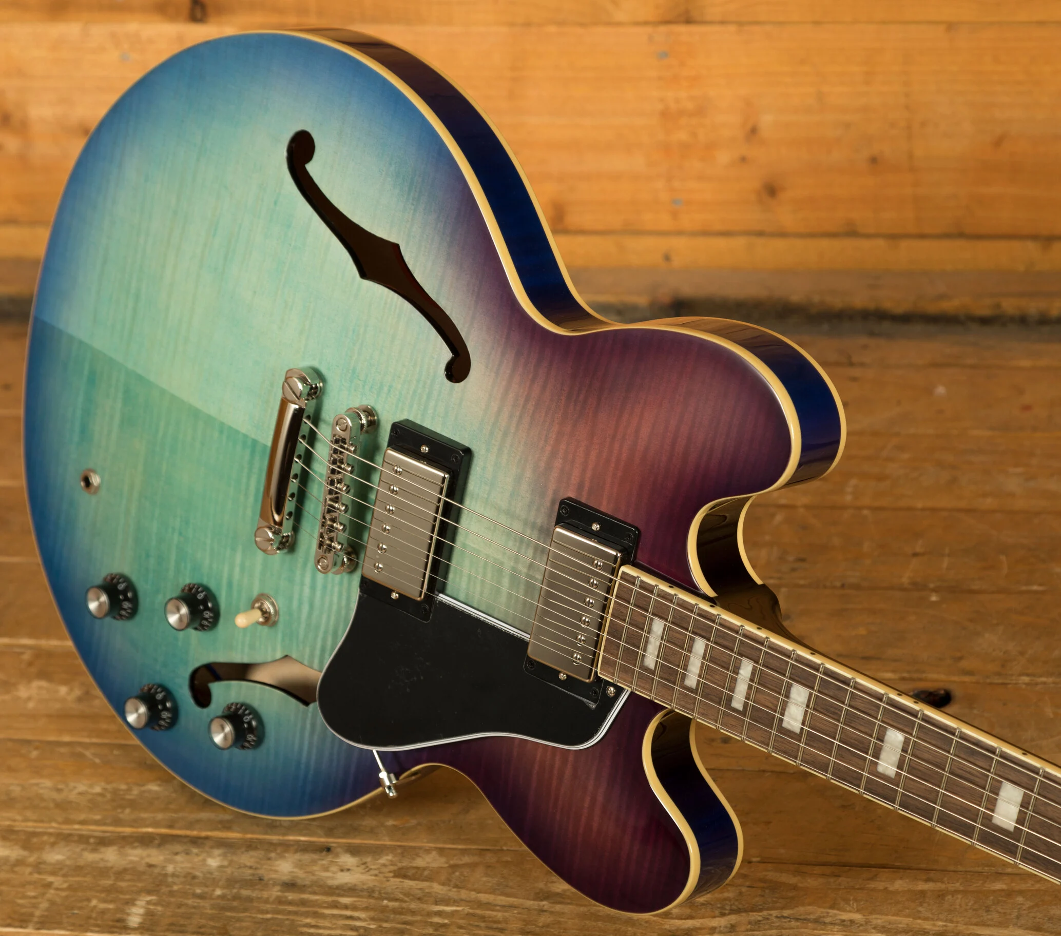 The ES-335 Figured features a comfortable rounded "C" neck profile, inviting your hand to effortlessly glide along the fretboard. Crafted from high-quality laurel, the fingerboard exudes a smooth and luxurious feel, enhancing playability and comfort. With 22 medium jumbo frets, you'll experience precise intonation and effortless bending, allowing you to unleash your creativity and explore new musical horizons.