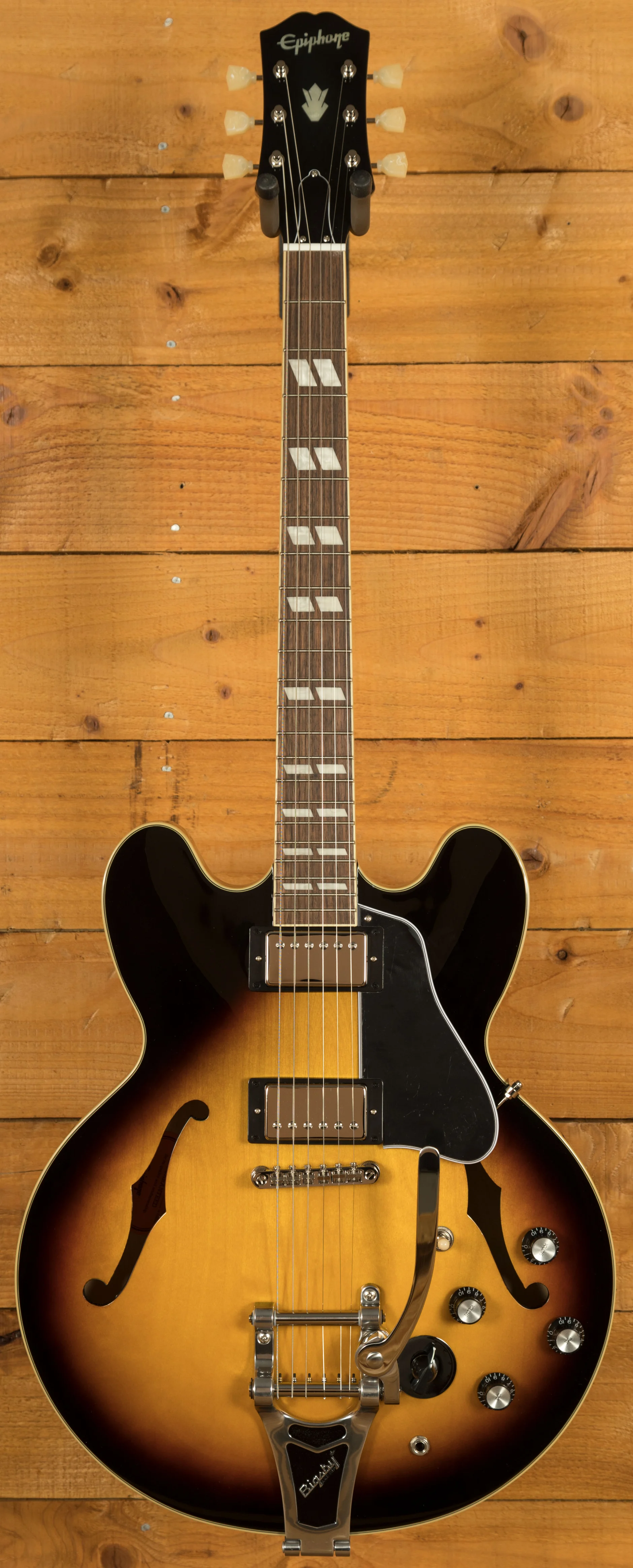 The Epiphone Deluxe tuners and TOM bridge keep the intonation and tuning in check whilst the Bigsby tailpiece allows players to add extra expression and nuance at the tip of their fingers.