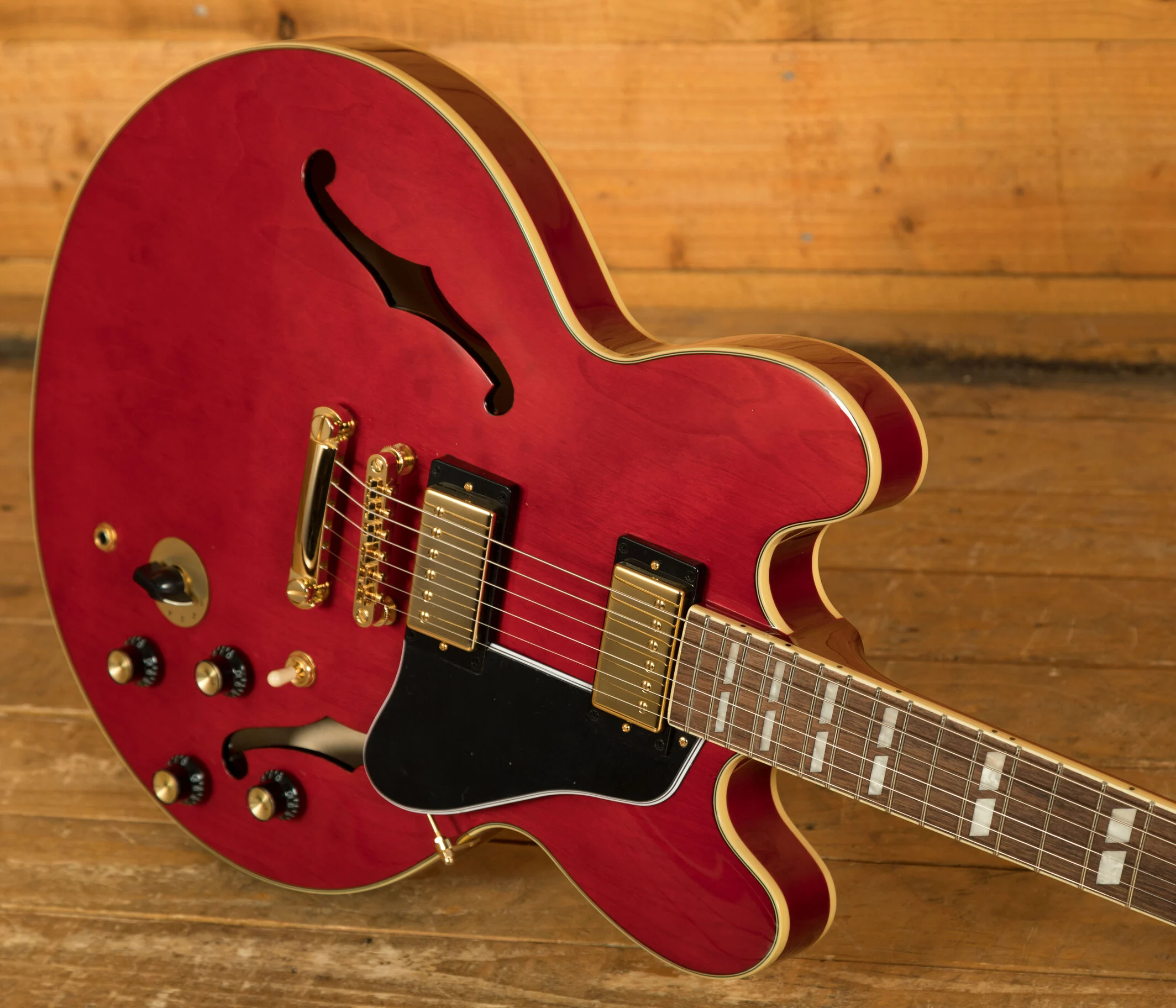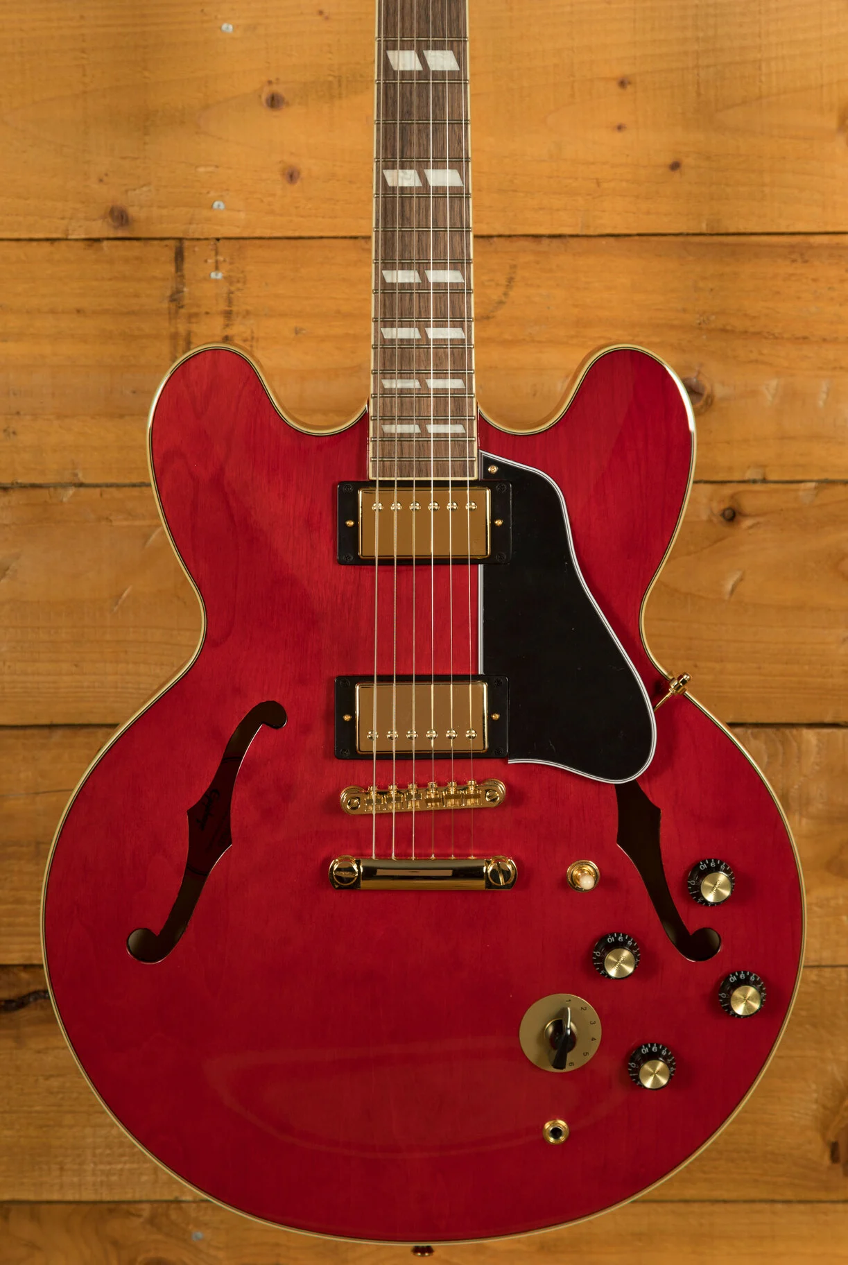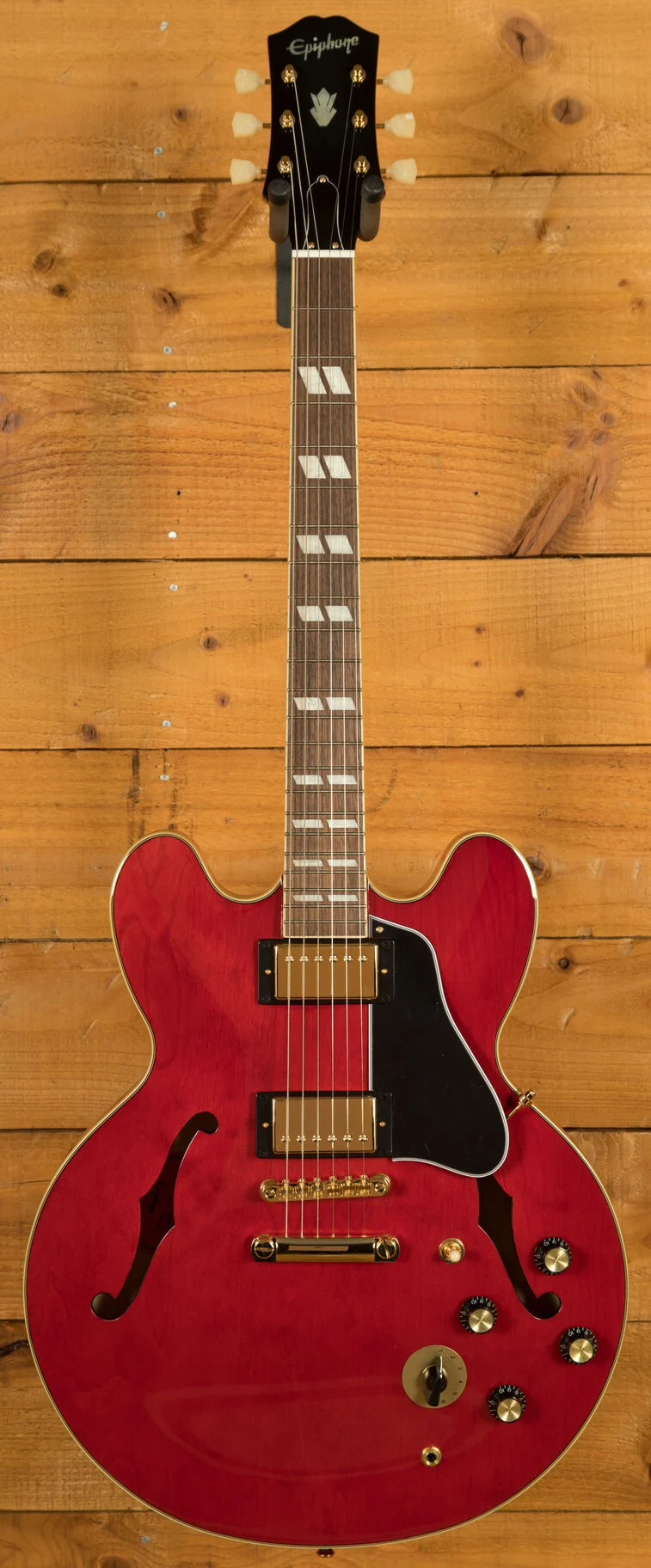 The ES-345 makes its return to the Epiphone lineup with this new and exclusive Vintage Cherry model. Taking the ES-335 and adding classy aesthetics and electronic modifications, the ES-345 is a worthy successor to the iconic semi-hollow guitar.