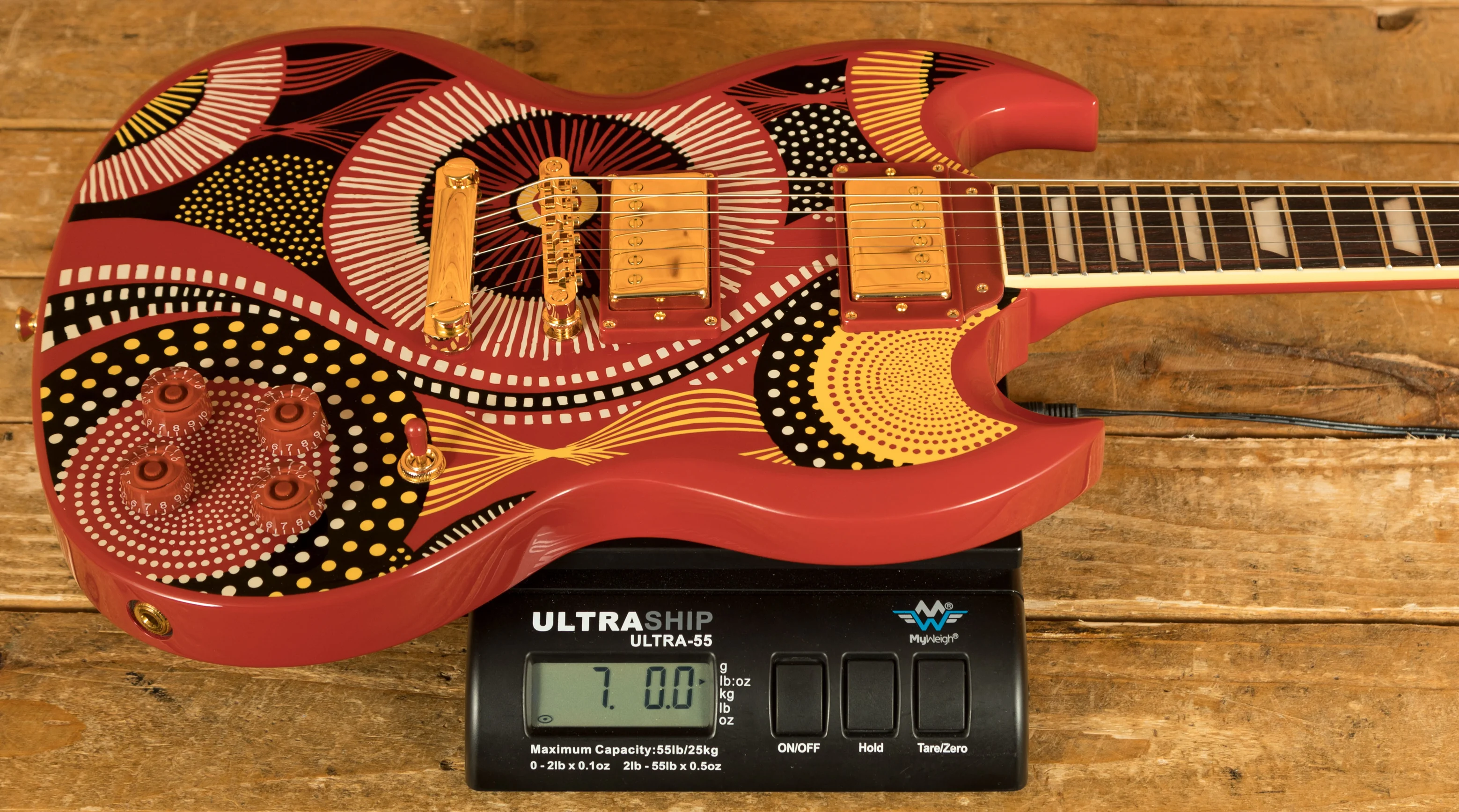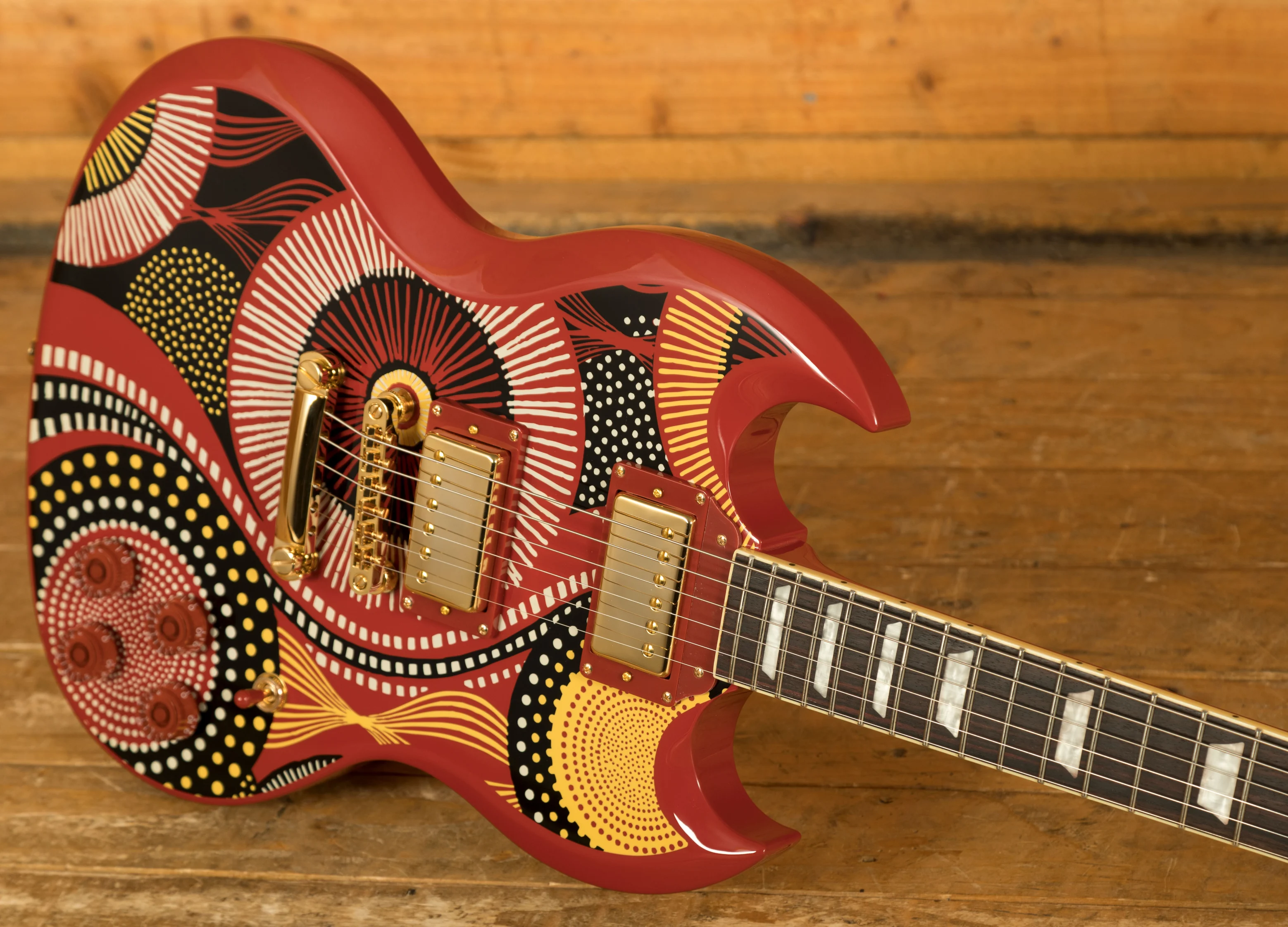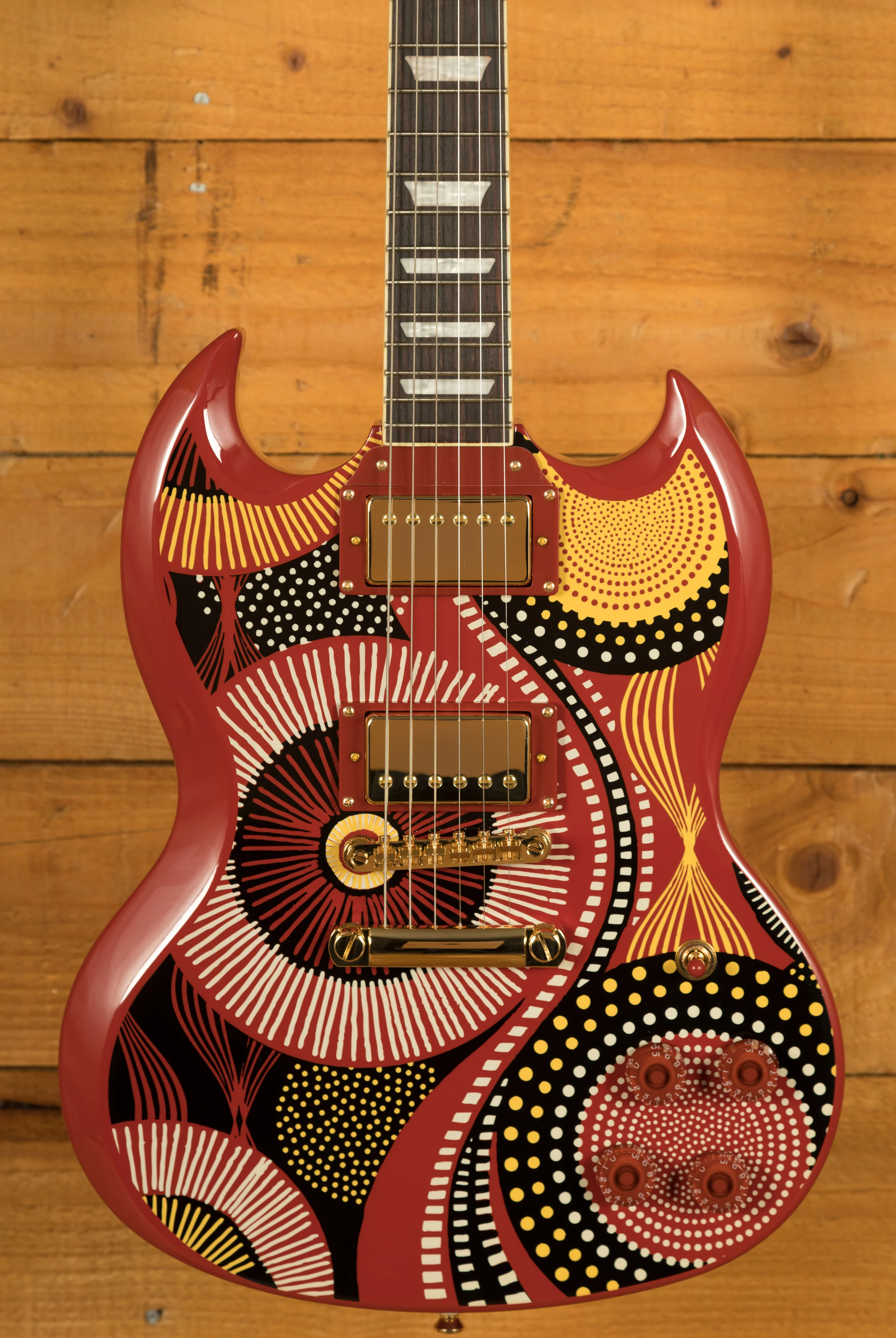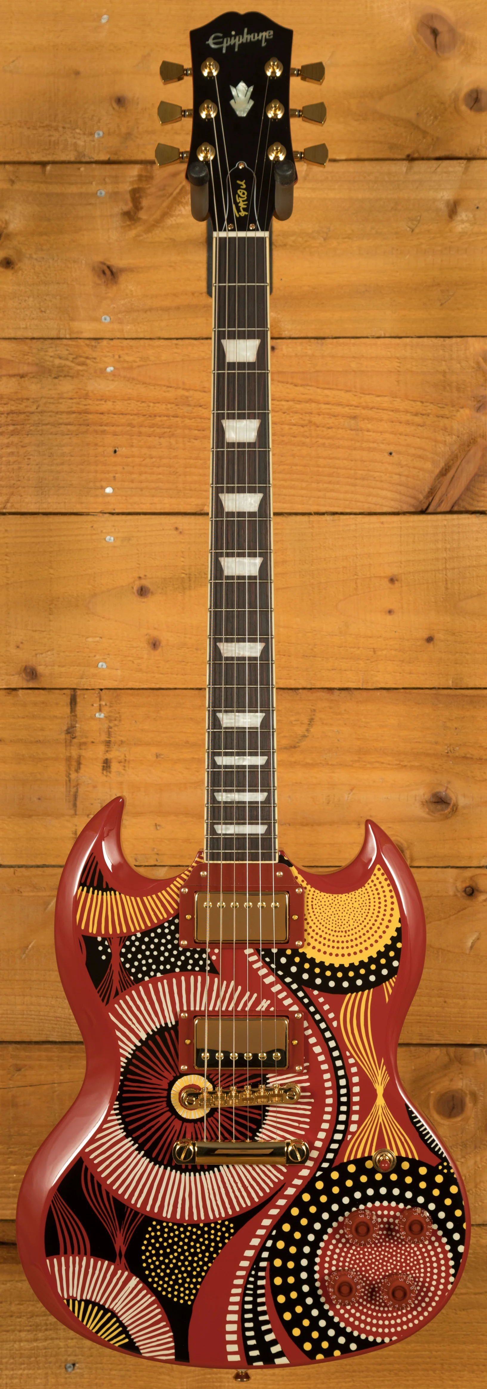 This signature Epiphone features a traditional SG body shape crafted from Mahogany. It features a vibrant red body adorned with her signature graphic on top. Its well balanced, lightweight, and comfortable to play. The Mahogany neck features a Custom C neck profile, which is comfortable and easy to navigate. The Rosewood fingerboard features 22 frets, a 24.75 scale length, 43mm nut width, Pearloid Trapezoid inlays.