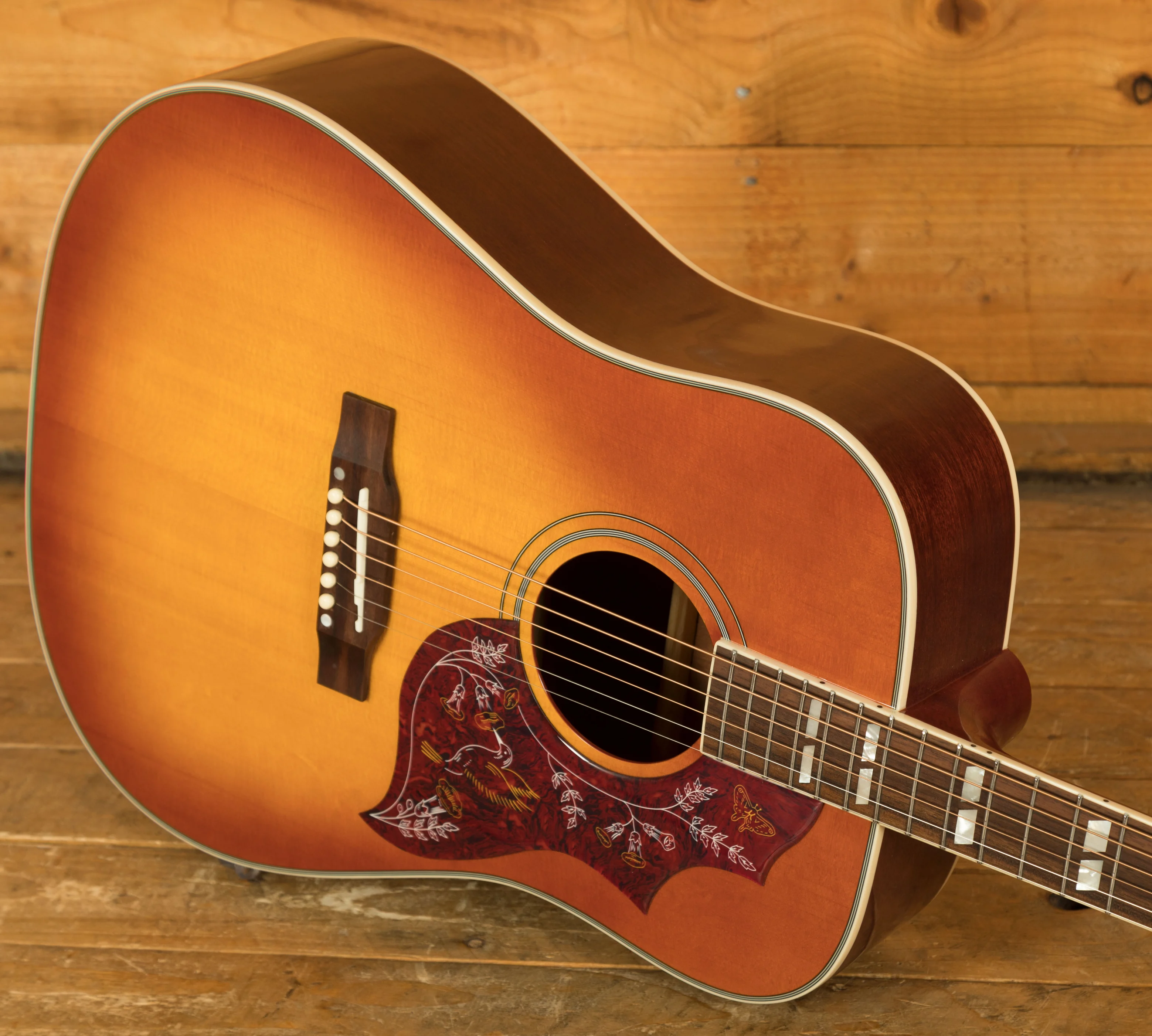 This Hummingbird features an all solid wood wood construction, which is great to see on an instrument at this price point, it really helps the overall tone and voice of the instrument. It features solid mahogany back & sides, alongside a solid spruce top. Together, these tonewoods deliver the sweet tone and power that the Hummingbird is known for.
