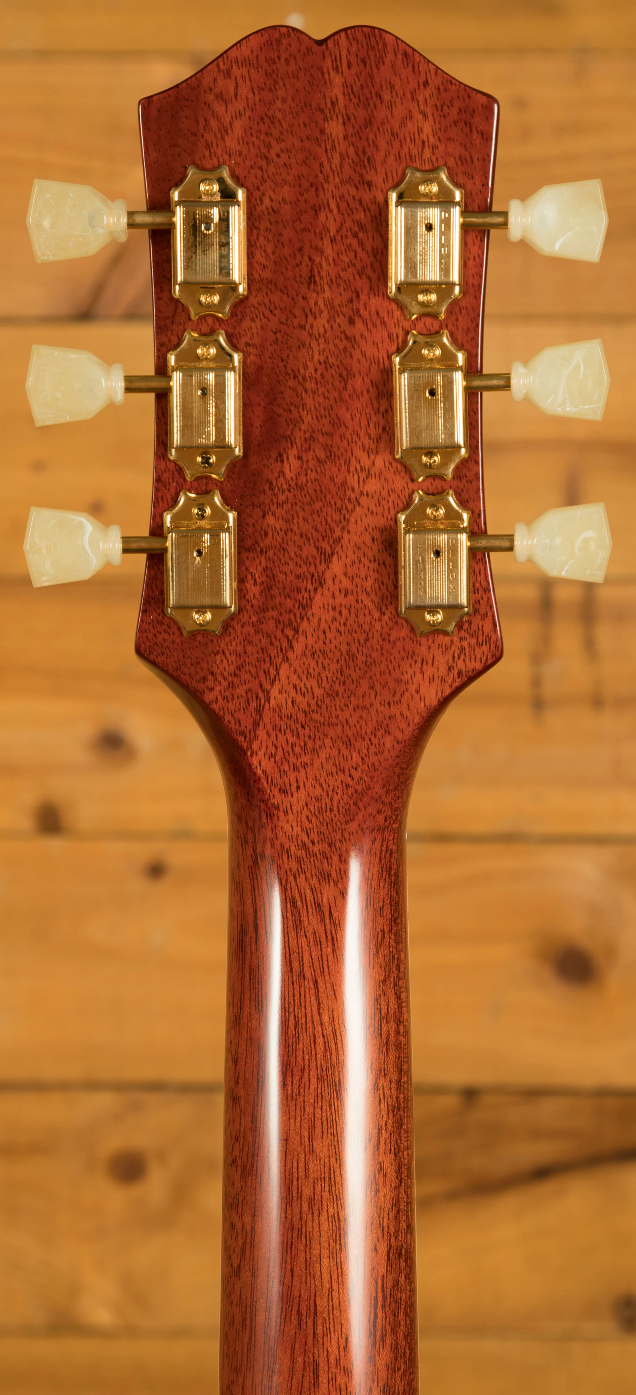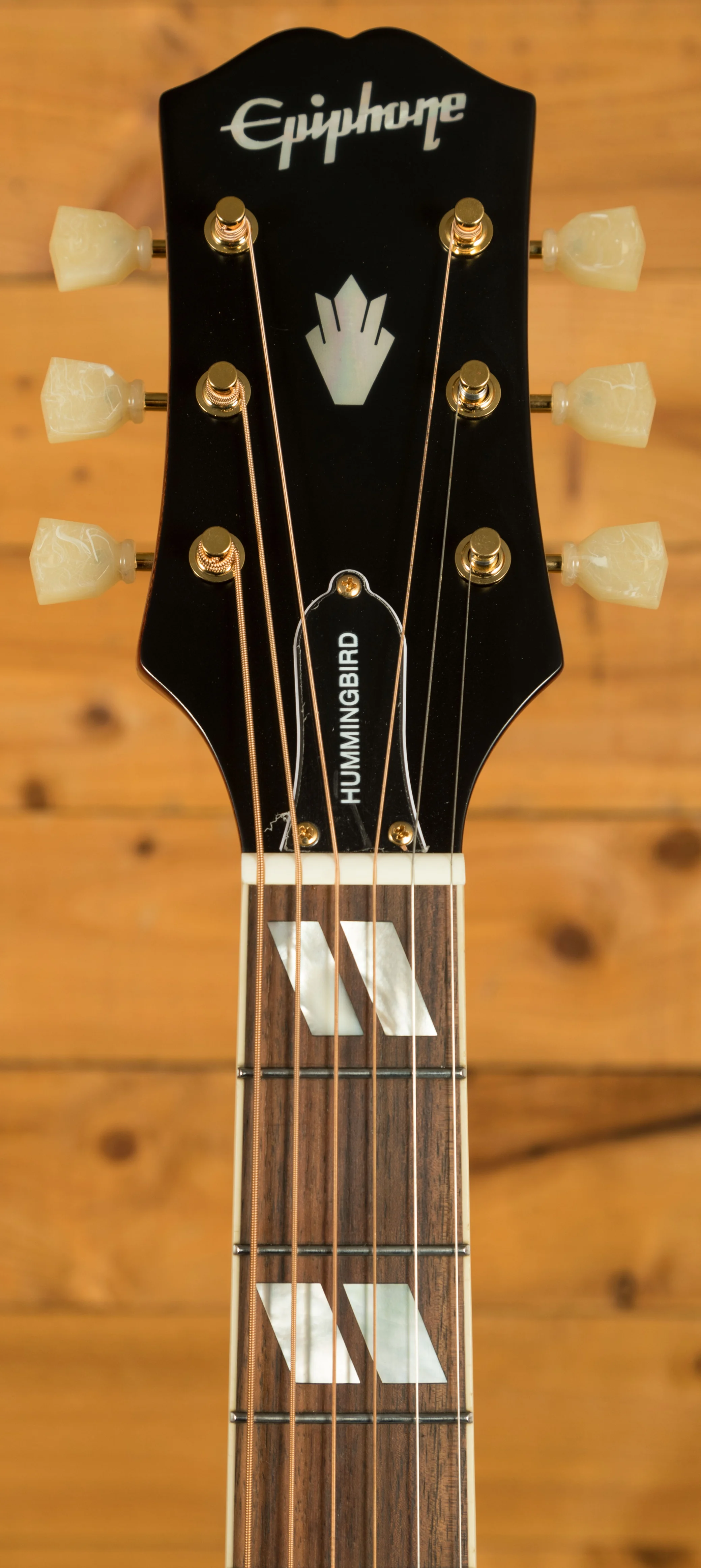 With a Fishman S-Core pickup built into the guitar, this Hummingbird is ready to hit the road or the studio right away. The S-Core is a really great pickup choice and really captures the natural characteristic of the body design. This Hummingbird also features a “belly-up” style bridge, and Epiphone deluxe tuners with keystone buttons.