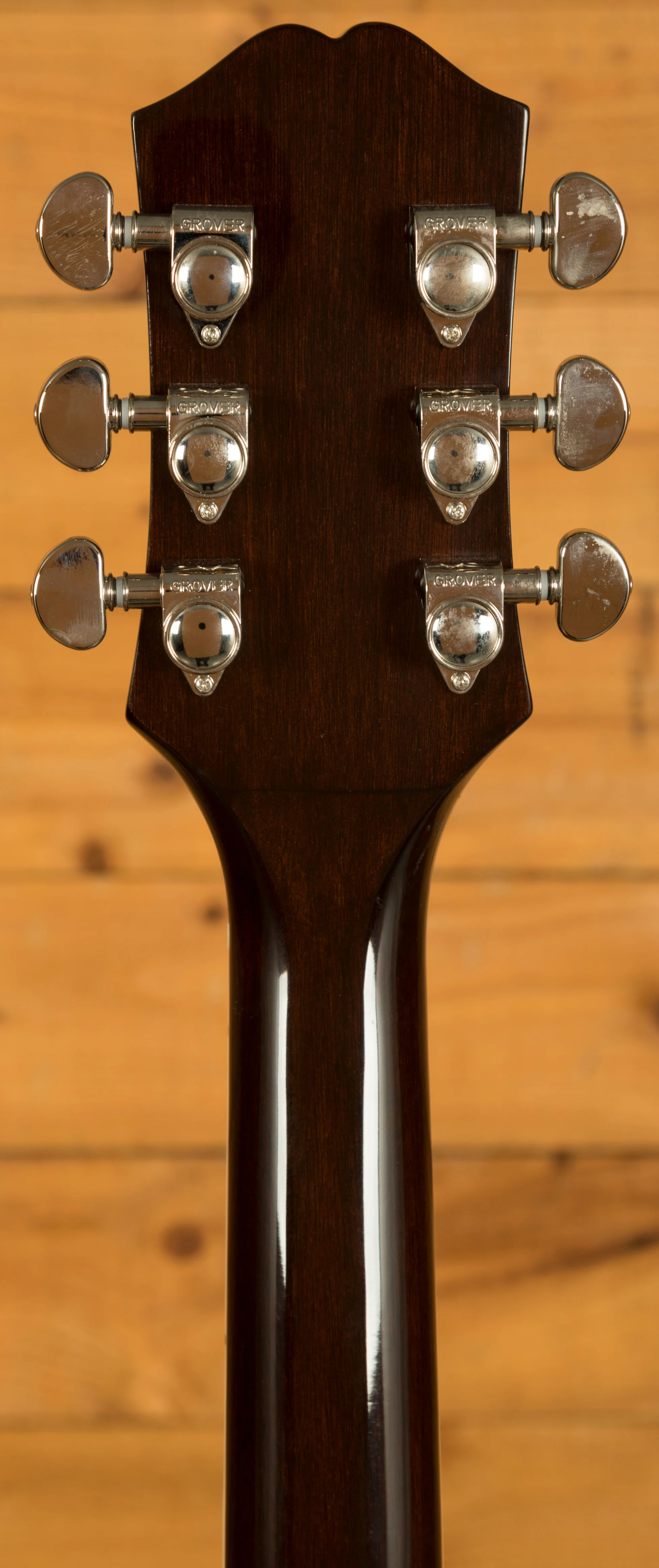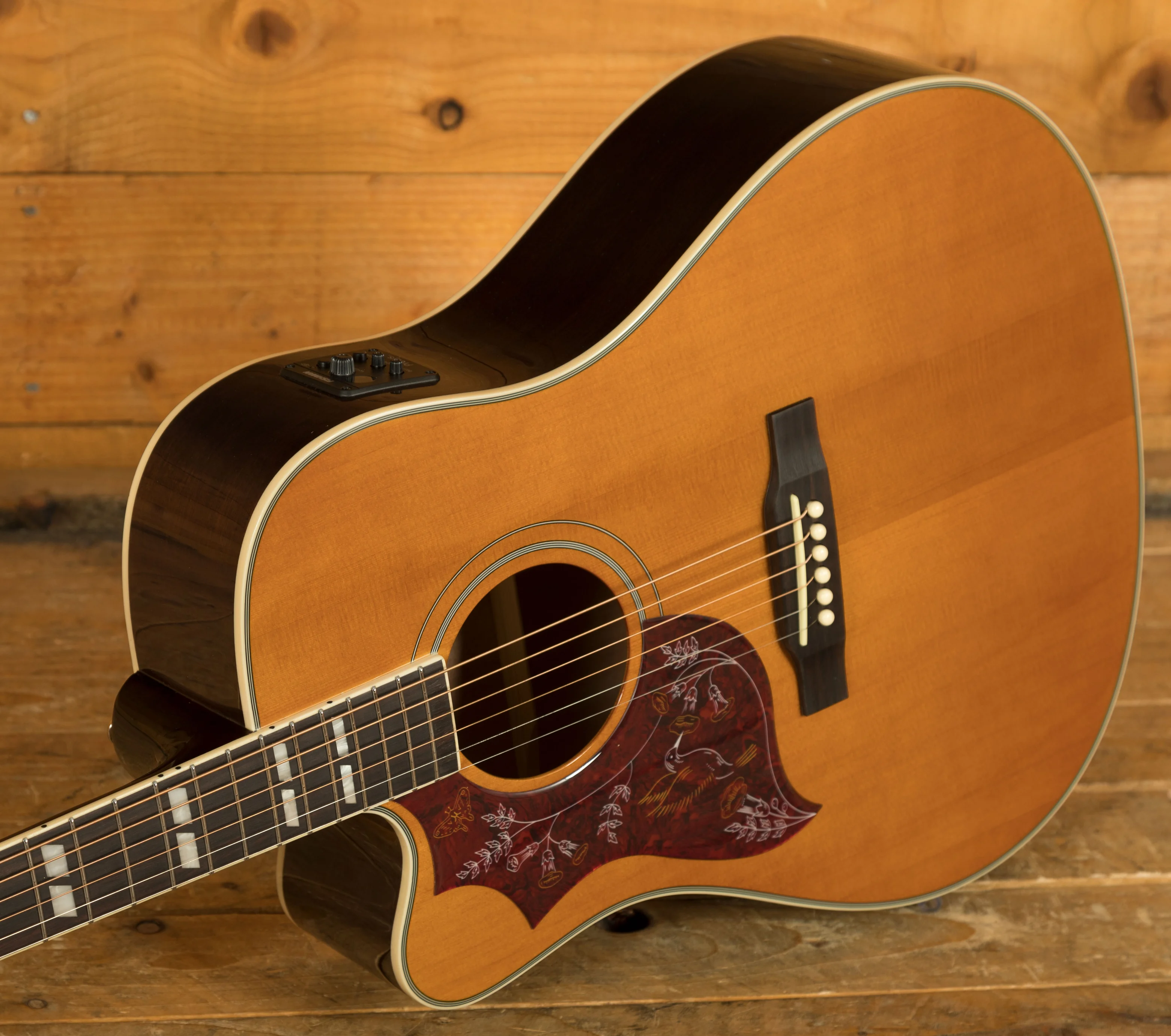 The Hummingbird Studio EC keeps the classic look of the original with its iconic tortoise pickguard featuring hummingbird graphic, Grover rotomatic tuners and a sixties Kalamazoo style headstock with mother of pearl details. It also features a rosewood 'belly-up' bridge with a compensated saddle for accurate intonation.