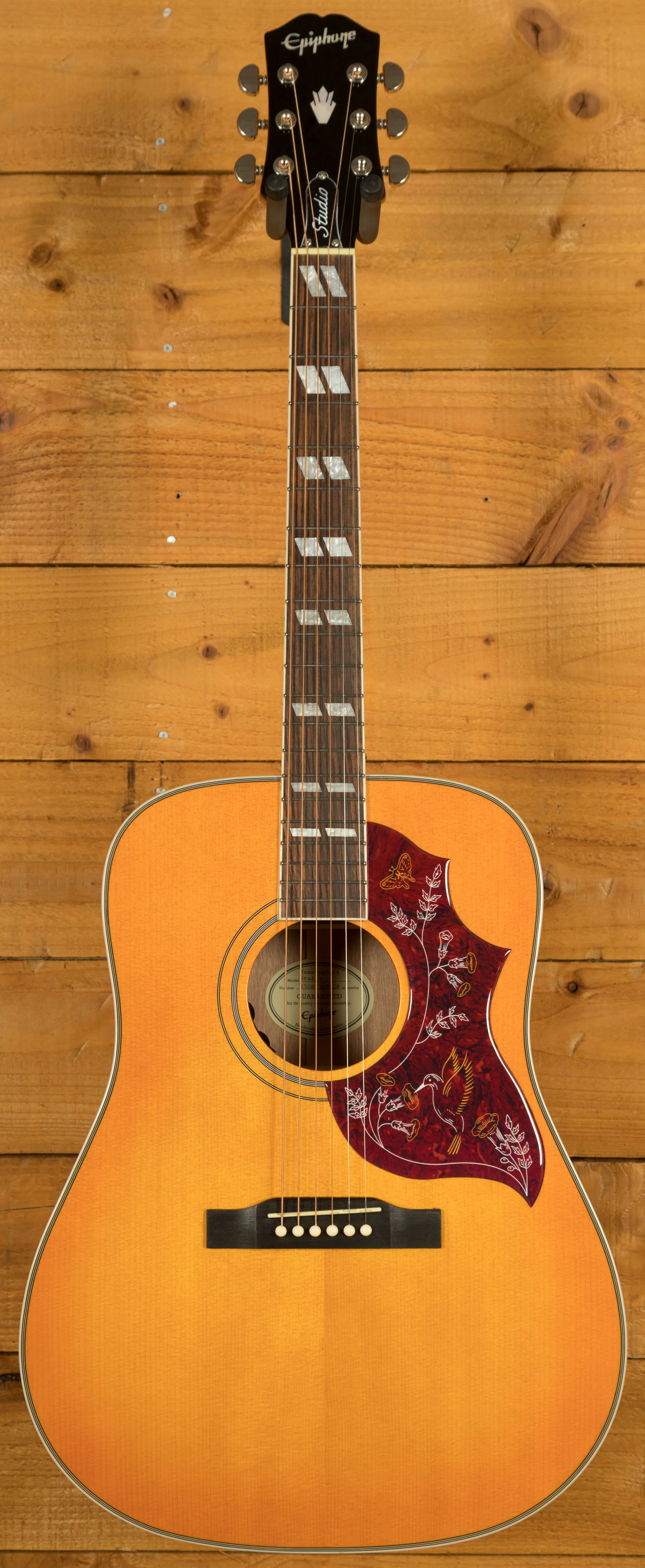 The Epiphone Hummingbird Studio in Heritage Cherry Sunburst brings a much loved Gibson acoustic design to players who want classic style and a bold, clear voice at an accessible price. As part of the new Epiphone Studio Acoustic Collection, it takes inspiration from the original Gibson Hummingbird, a square shouldered dreadnought known for its full-bodied voice with sweet trebles and enhanced low-end.