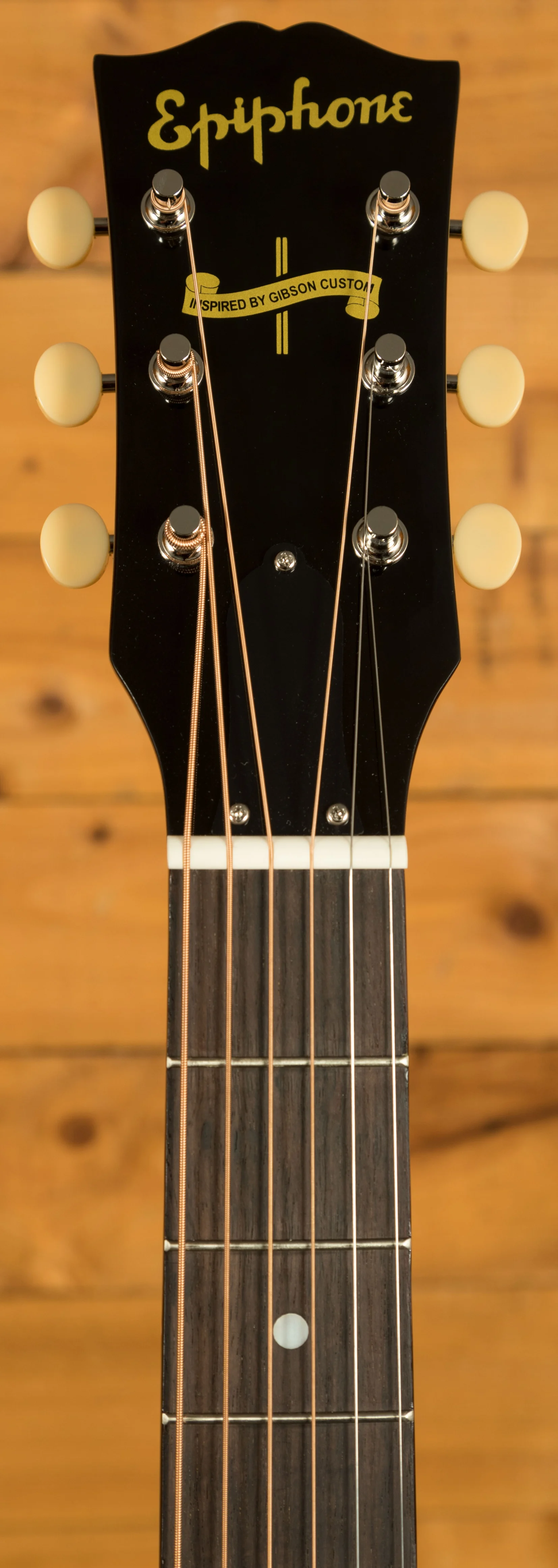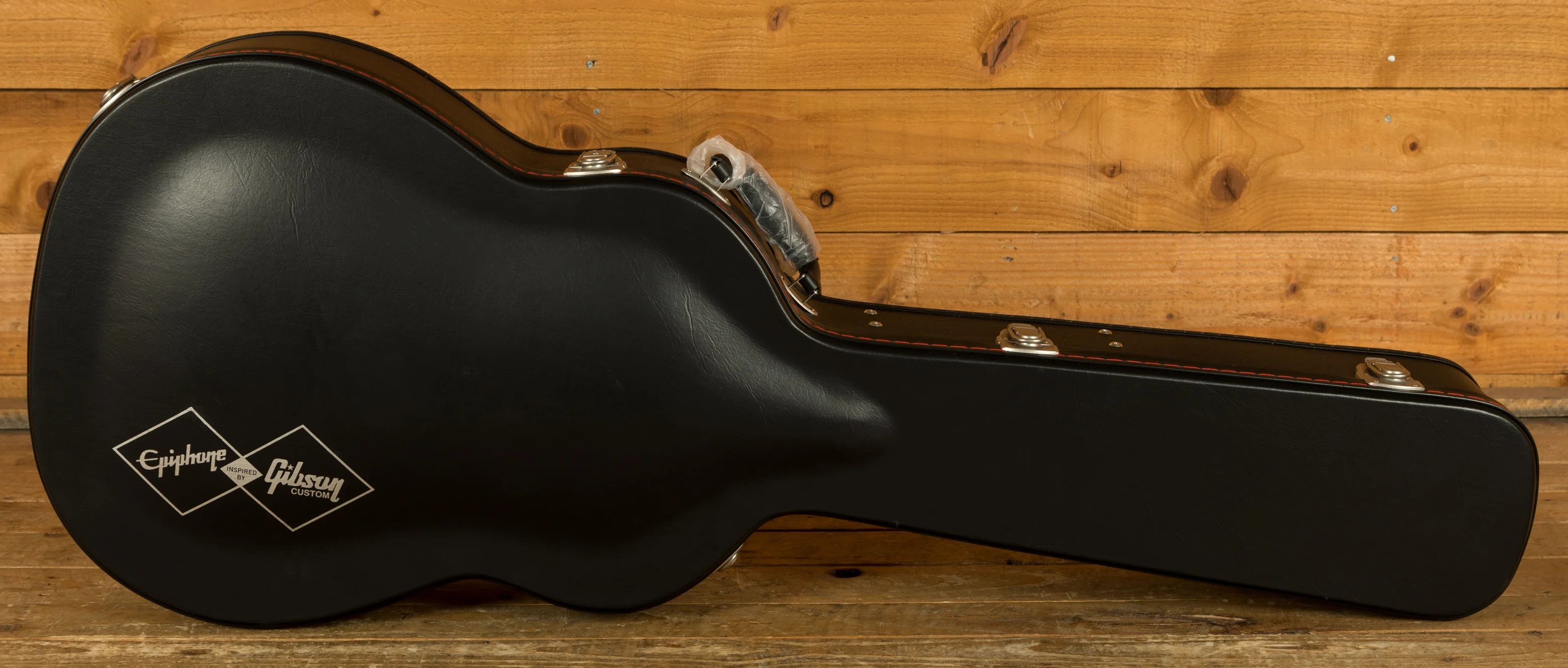 The one-piece mahogany neck has a V-shaped profile and is topped with an Indian rosewood fretboard fitted with 19 standard frets and decorated with mother-of-pearl dot inlays. It also features a 24.75” scale length, and a 44mm nut width. The headstock features the world-famous Gibson “open book” profile and bears the Inspired by Gibson Custom double diamond logo etched on the back, while the front displays the Epiphone logo and “Epiphone Inspired by Gibson” banner in gold silk screen.